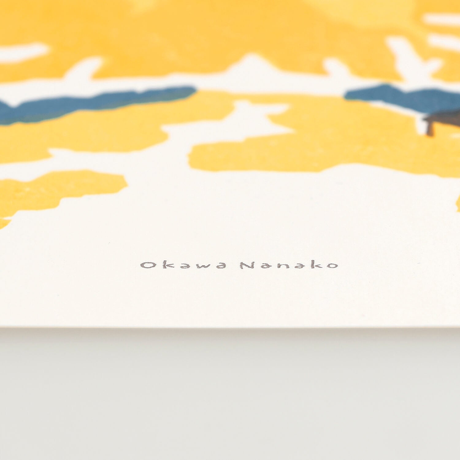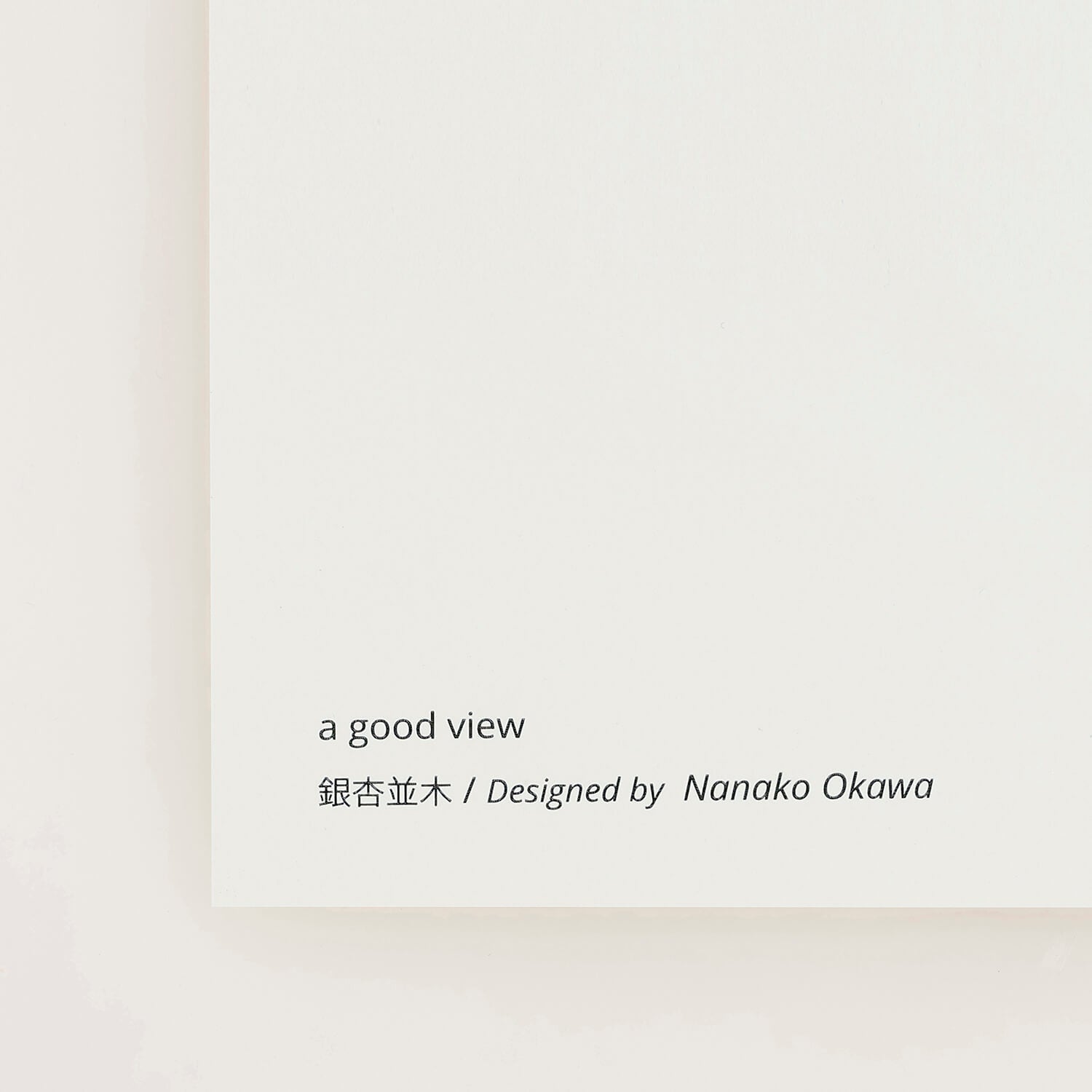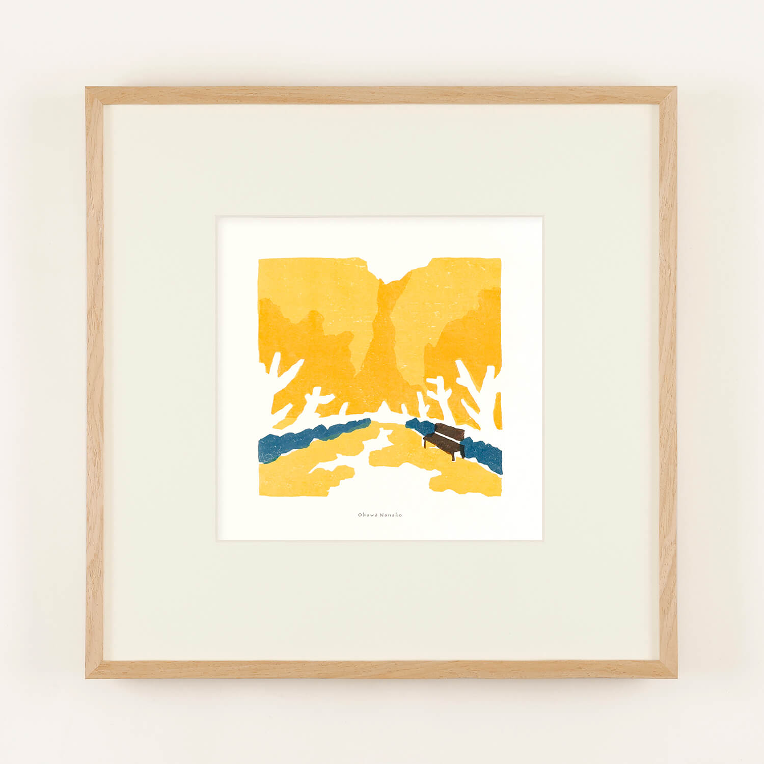 やわらかな黄色に包まれた並木道と、ぽつんと置かれたベンチ。人の気配を残しながら、静けさがゆっくりと広がります。大川菜々子さんの、記憶や季節の感触にそっと触れるような風景表現が魅力です。