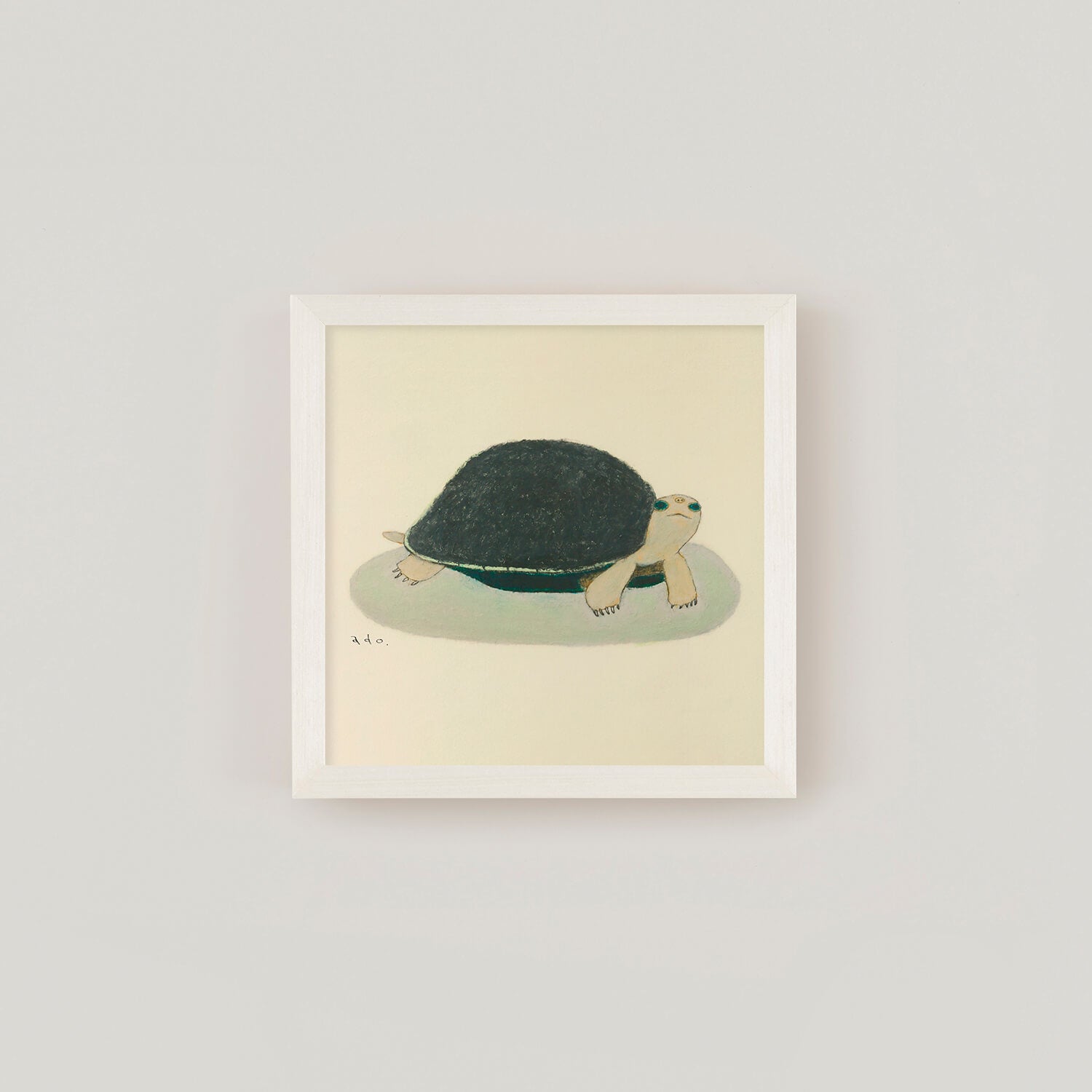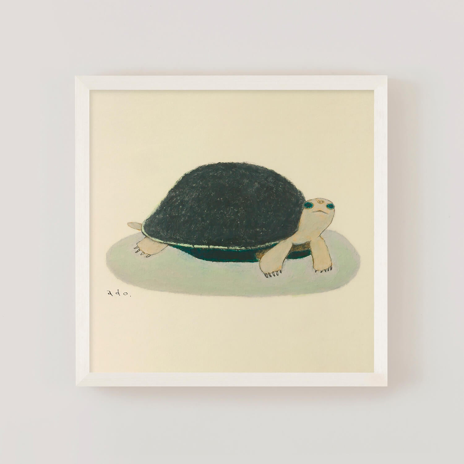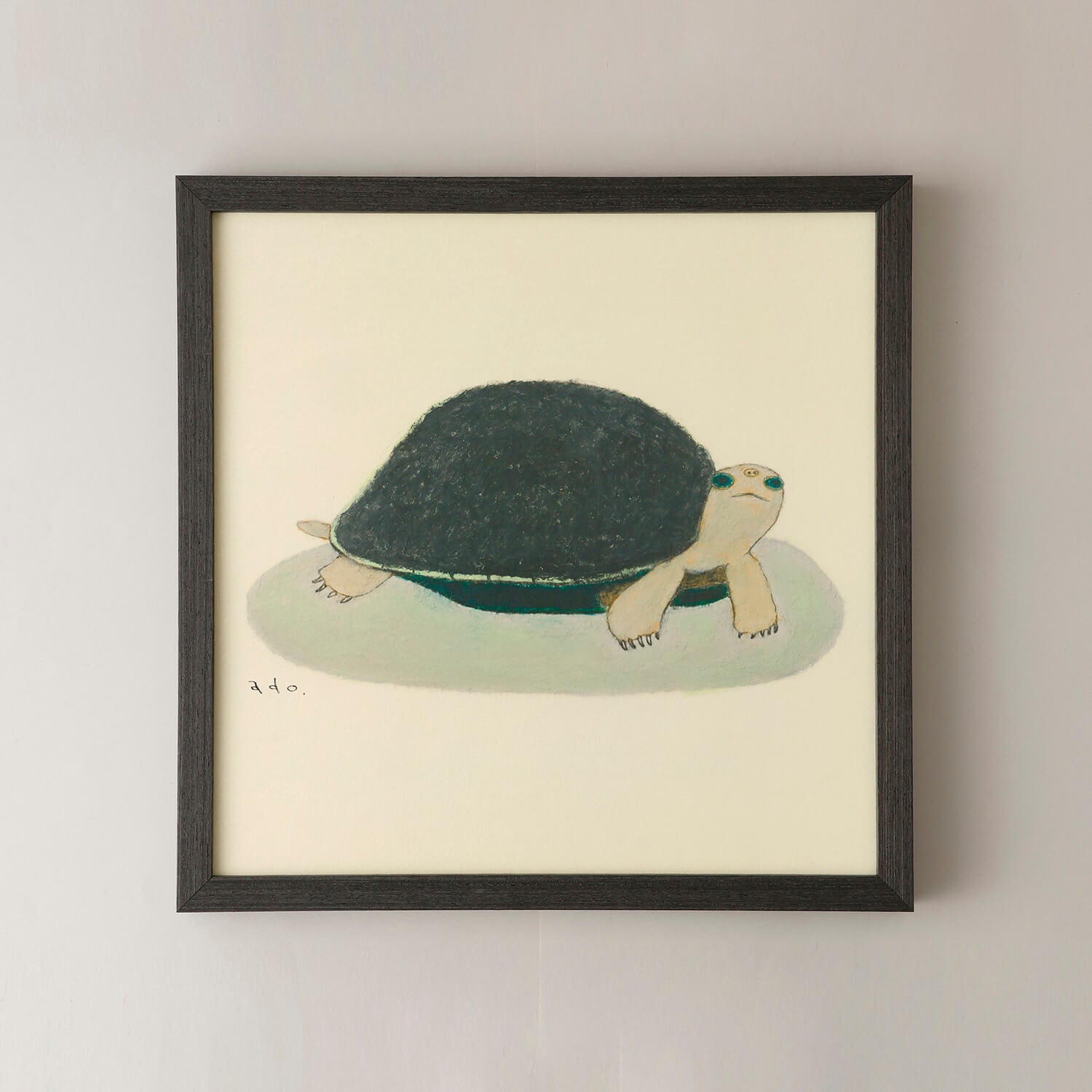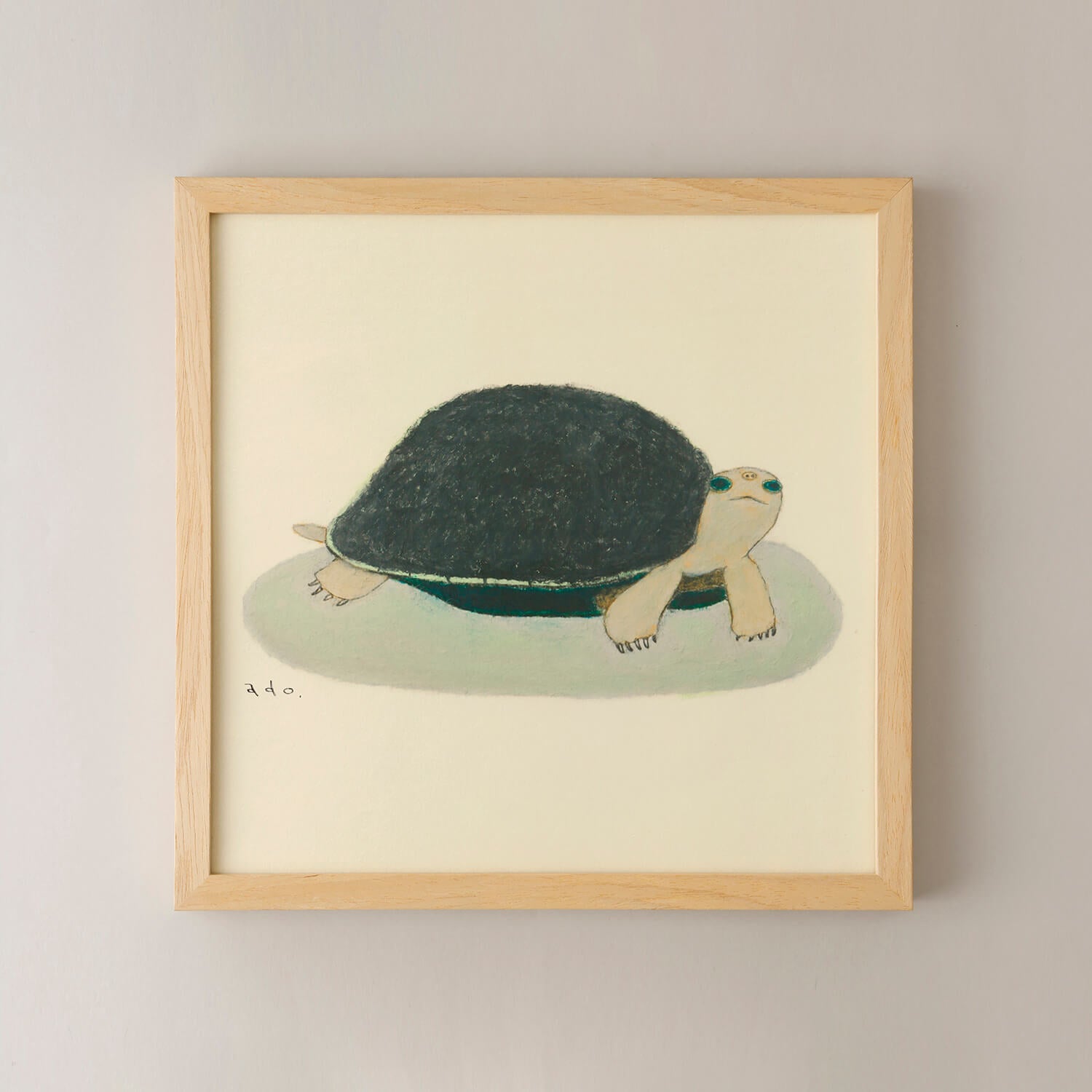 「イシガメ」がモデル。adoこと渡辺真希子さんが和紙にオイルパステル、色鉛筆、鉛筆などで描く生きものたちは、落ち着いた佇まいが特徴。まるで心で話しかけるみたいに、じっとこちらを見つめる目に、思わず引き込まれてしまいそうになります。