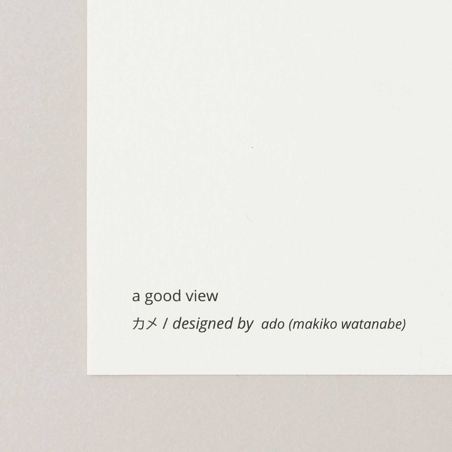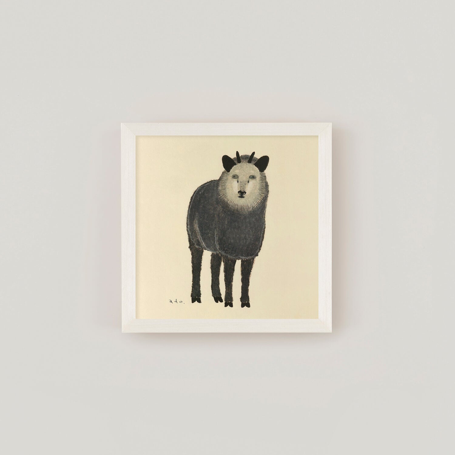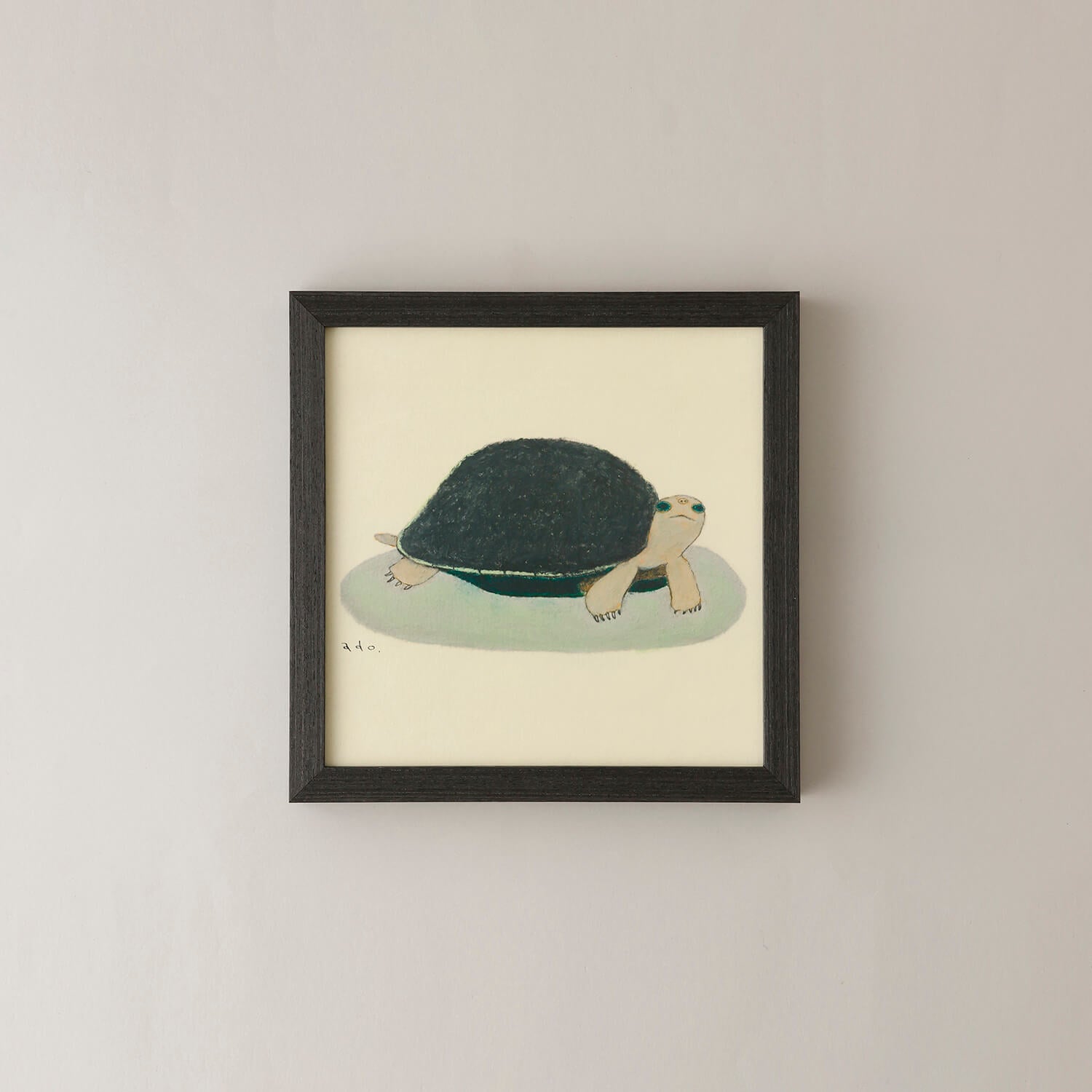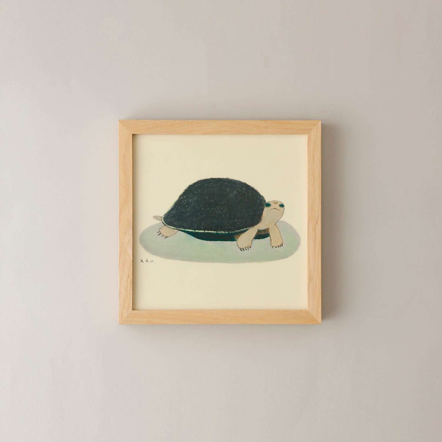 「イシガメ」がモデル。adoこと渡辺真希子さんが和紙にオイルパステル、色鉛筆、鉛筆などで描く生きものたちは、落ち着いた佇まいが特徴。まるで心で話しかけるみたいに、じっとこちらを見つめる目に、思わず引き込まれてしまいそうになります。