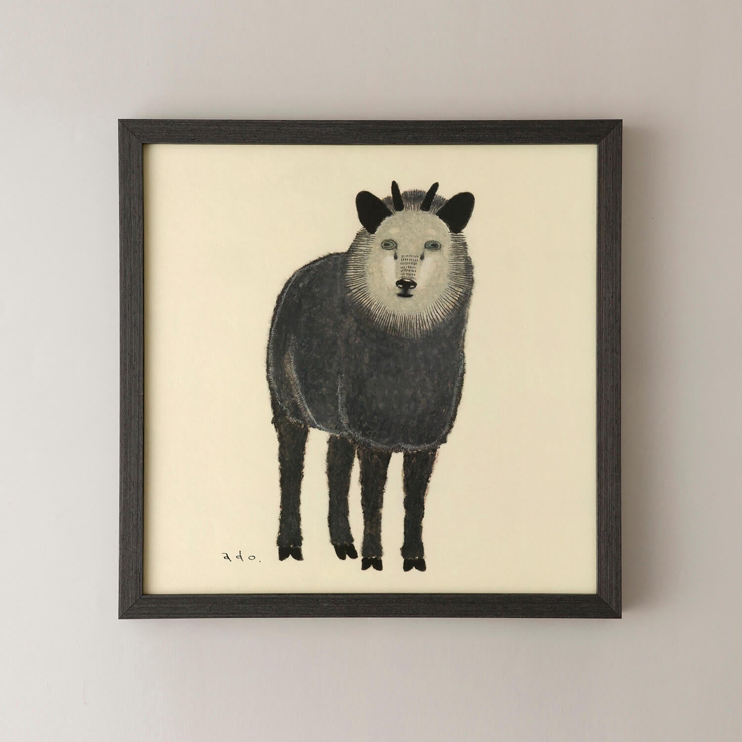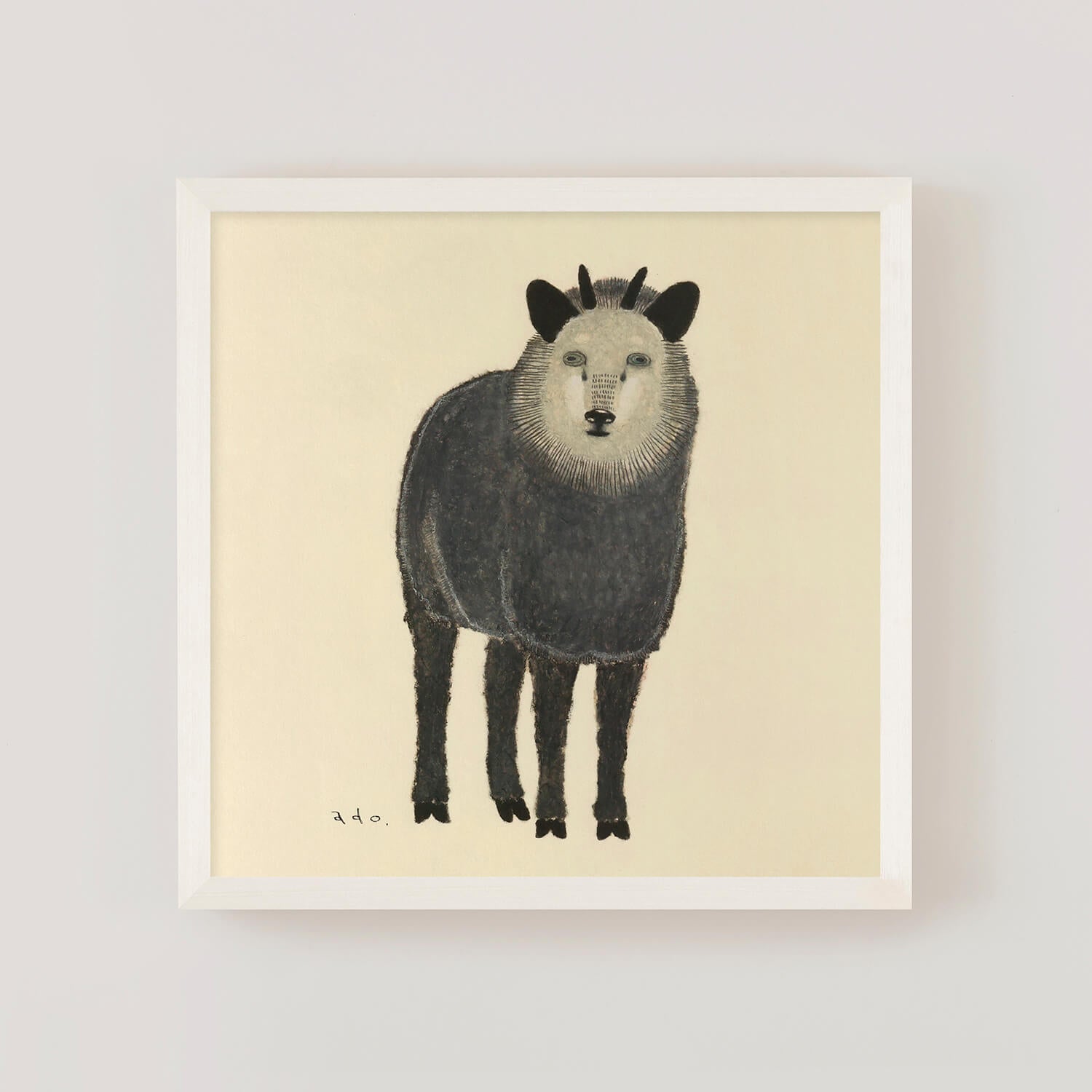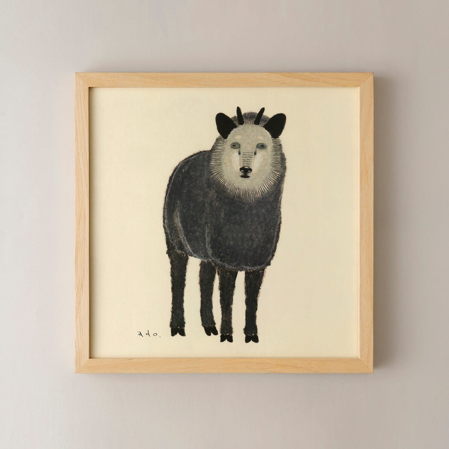 「ニホンカモシカ」がモデル。adoこと渡辺真希子さんが和紙にオイルパステル、色鉛筆、鉛筆などで描く生きものたちは、落ち着いた佇まいが特徴。まるで心で話しかけるみたいに、じっとこちらを見つめる目に、思わず引き込まれてしまいそうになります。