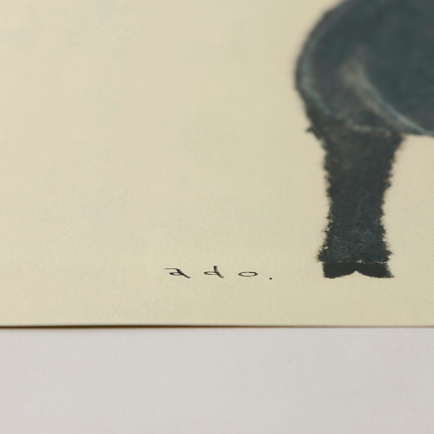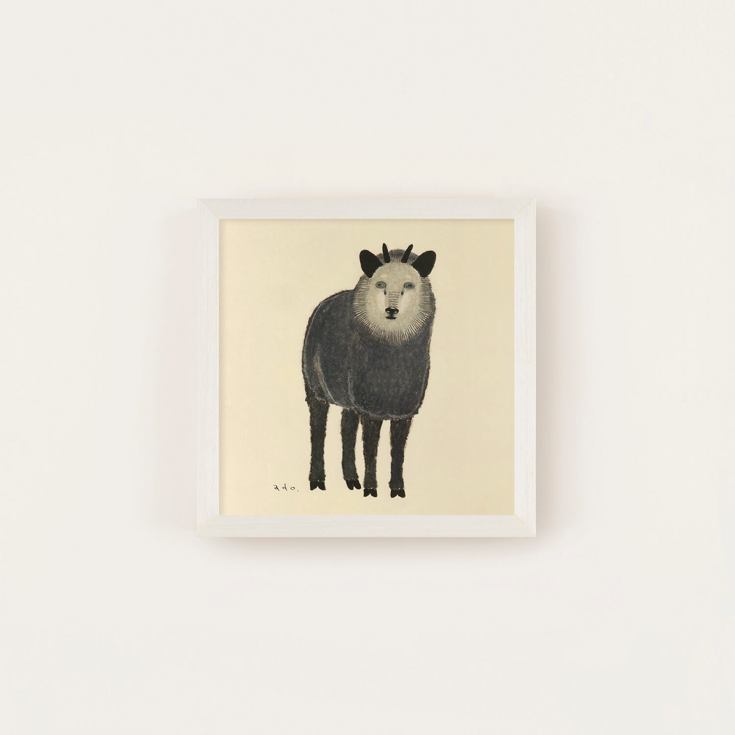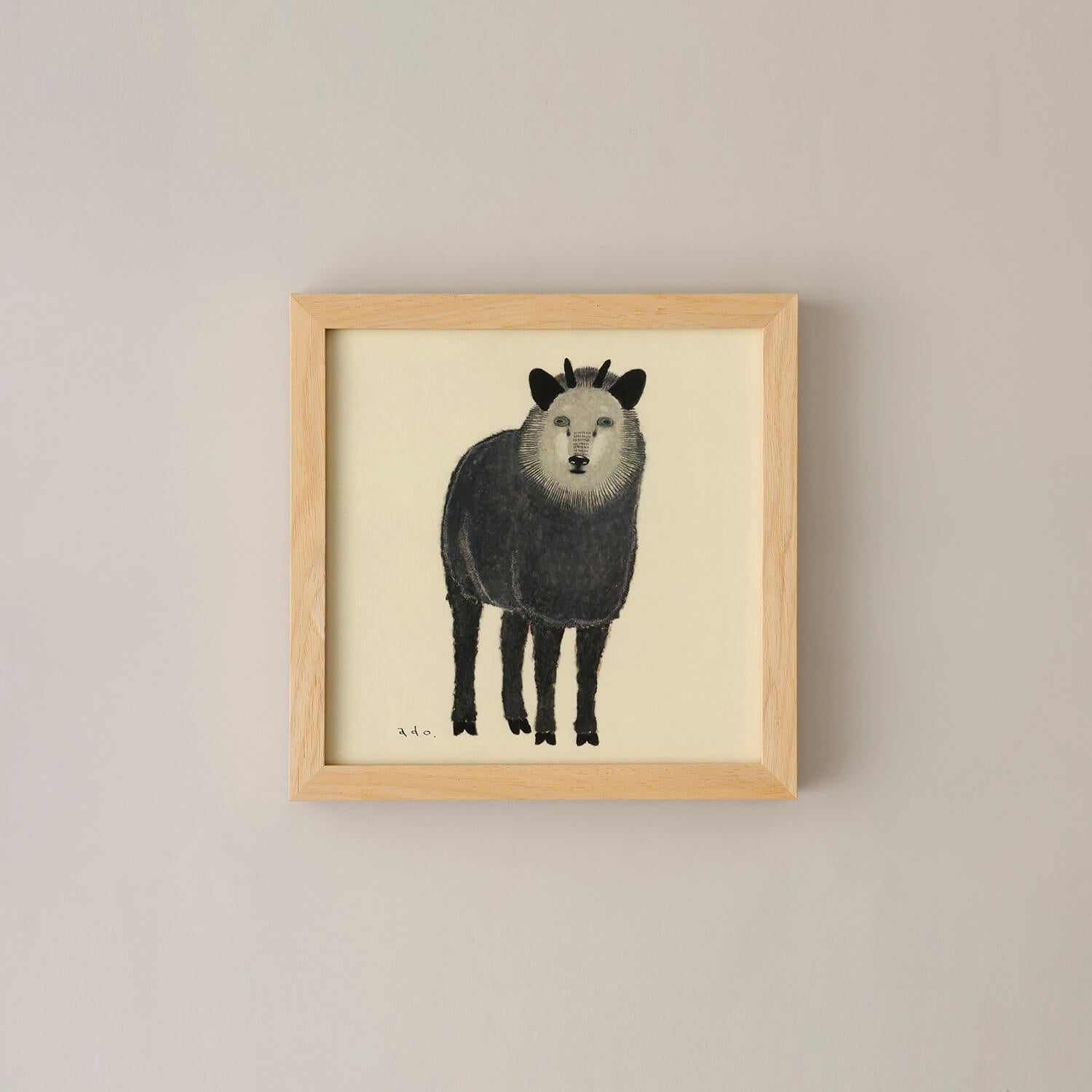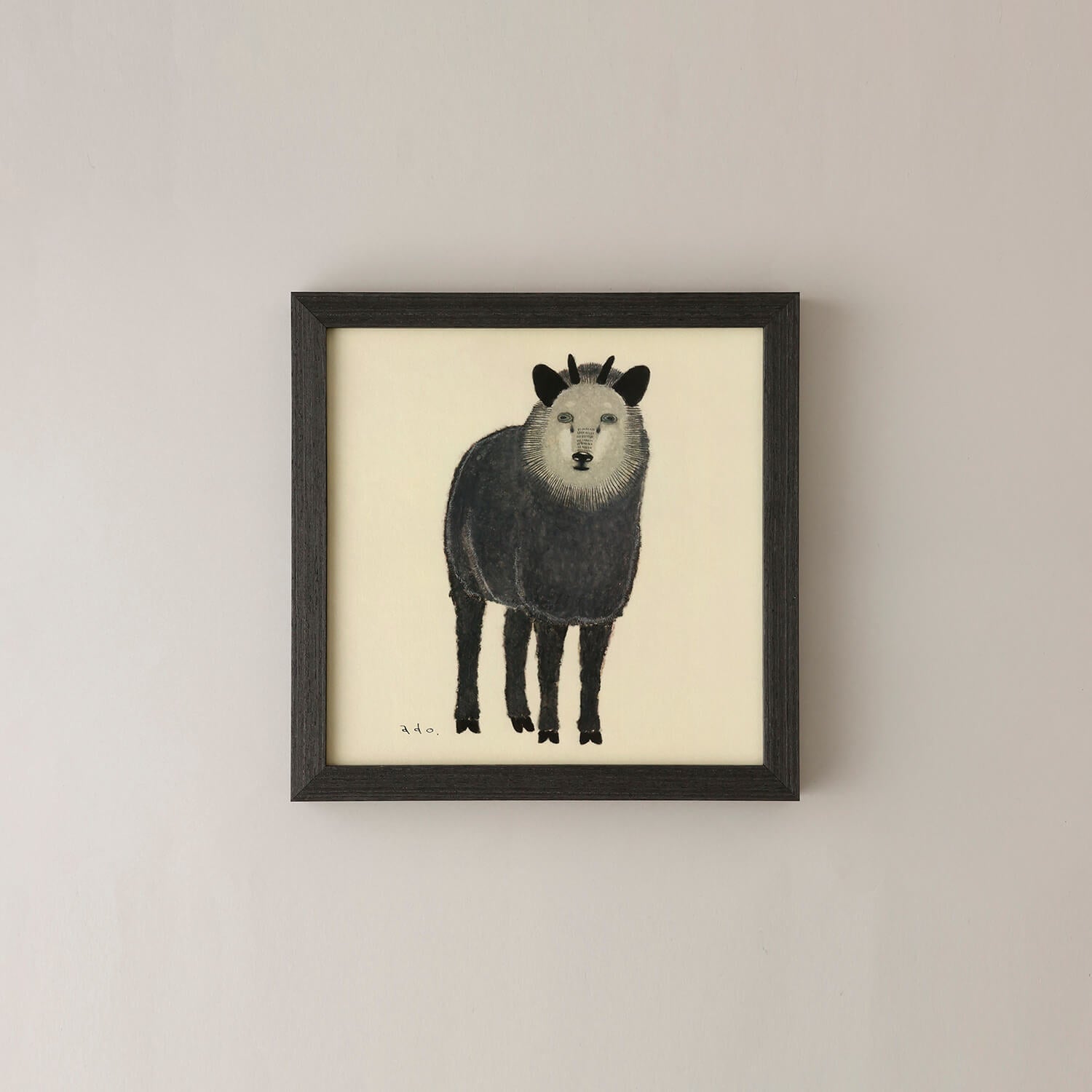「ニホンカモシカ」がモデル。adoこと渡辺真希子さんが和紙にオイルパステル、色鉛筆、鉛筆などで描く生きものたちは、落ち着いた佇まいが特徴。まるで心で話しかけるみたいに、じっとこちらを見つめる目に、思わず引き込まれてしまいそうになります。