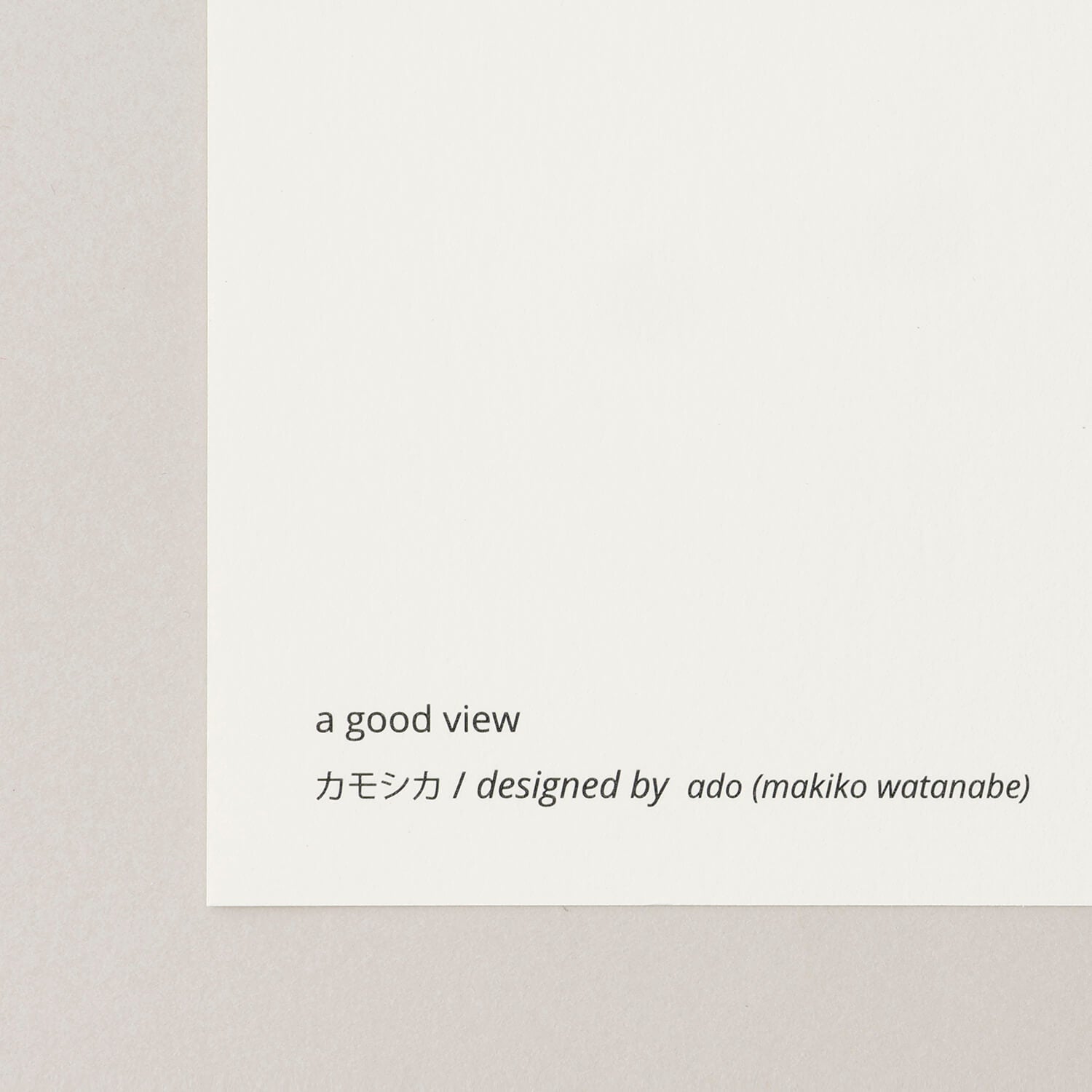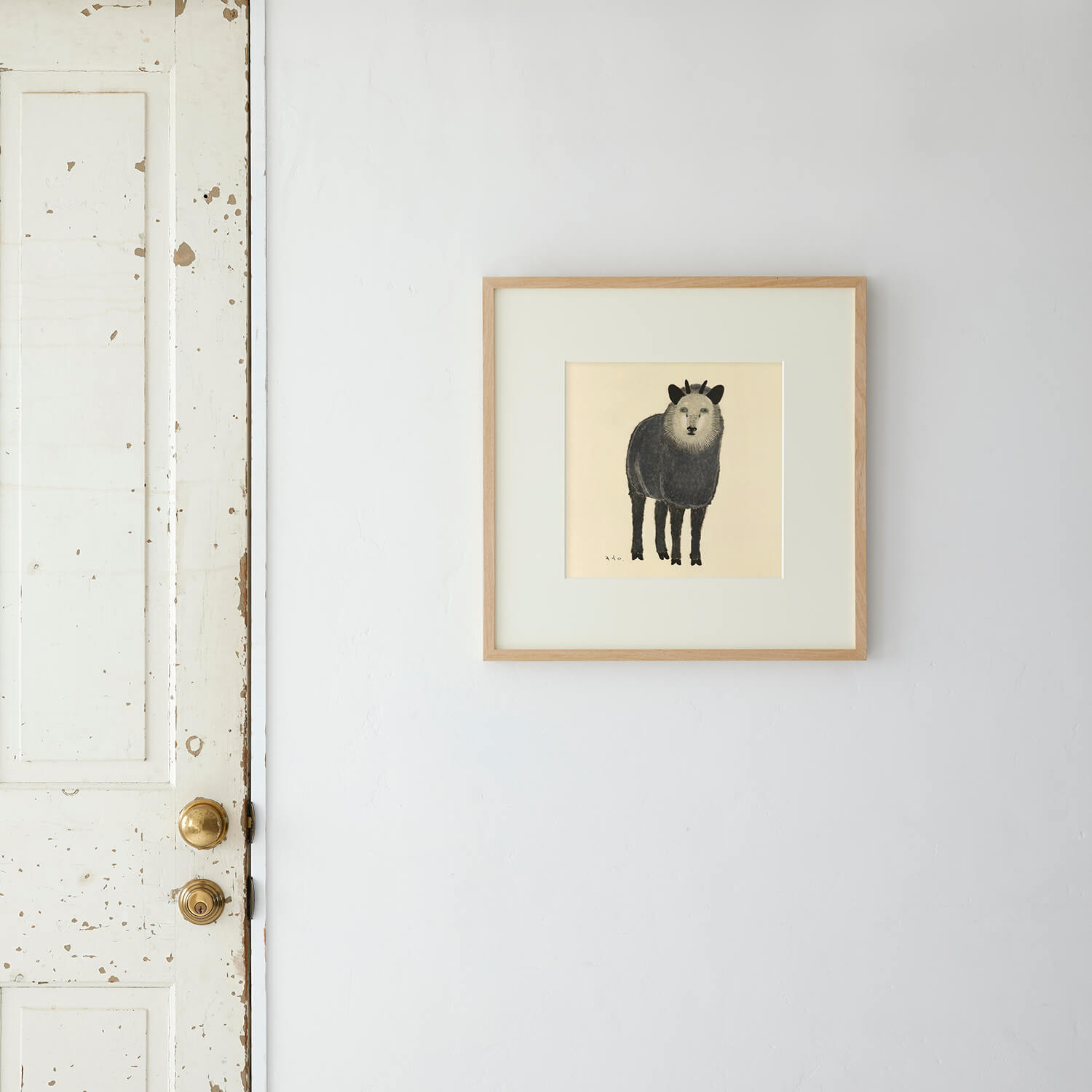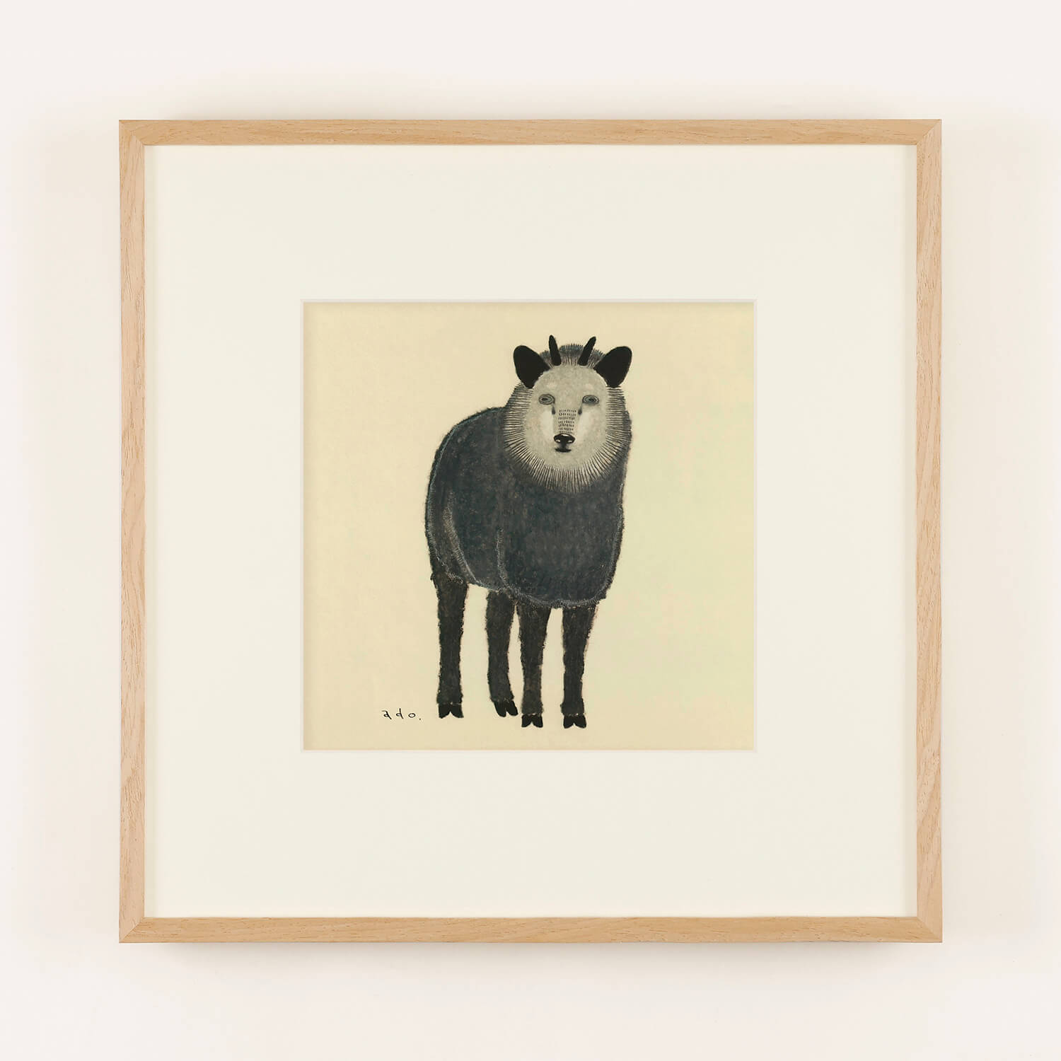 「ニホンカモシカ」がモデル。adoこと渡辺真希子さんが和紙にオイルパステル、色鉛筆、鉛筆などで描く生きものたちは、落ち着いた佇まいが特徴。まるで心で話しかけるみたいに、じっとこちらを見つめる目に、思わず引き込まれてしまいそうになります。