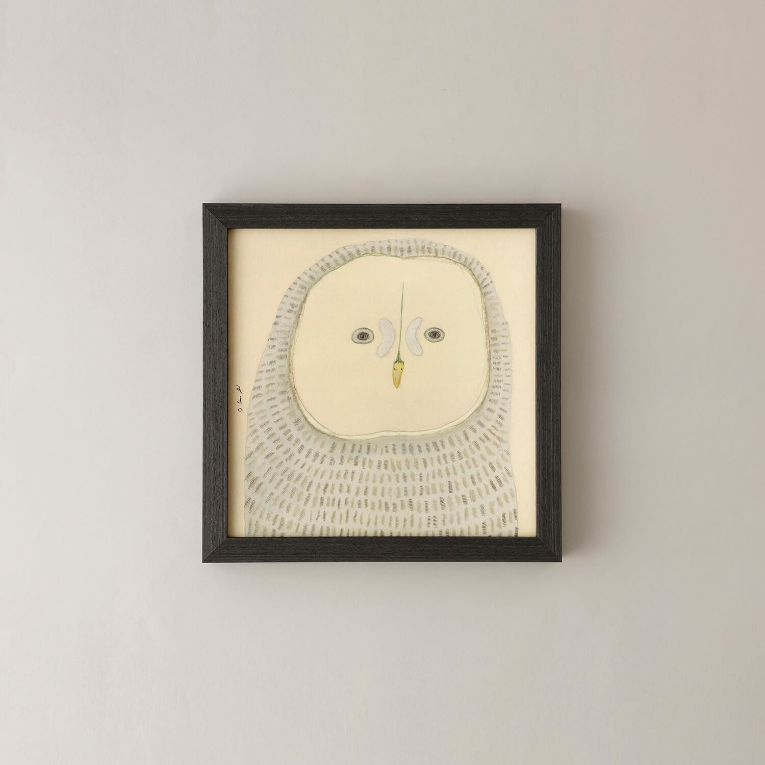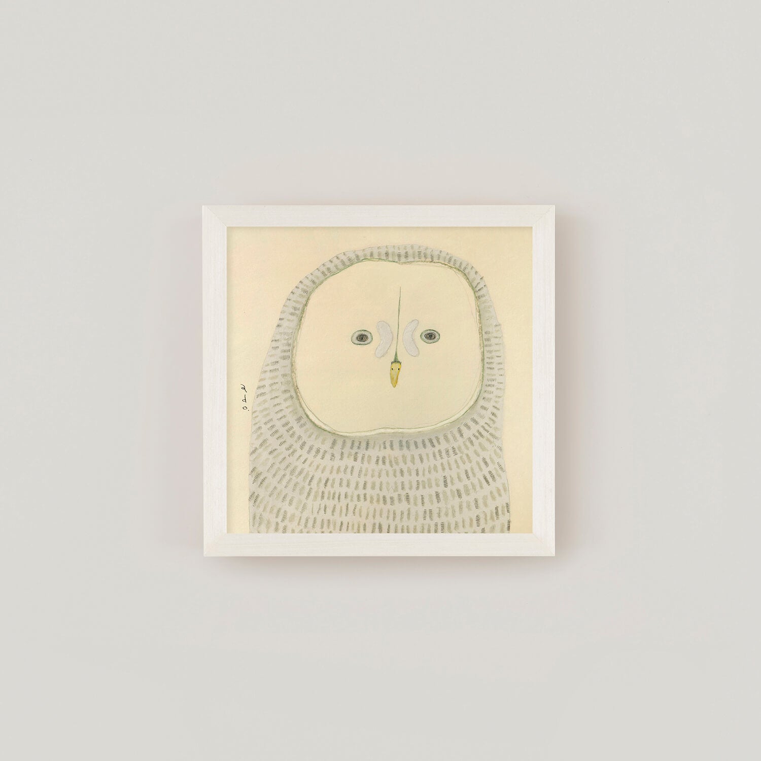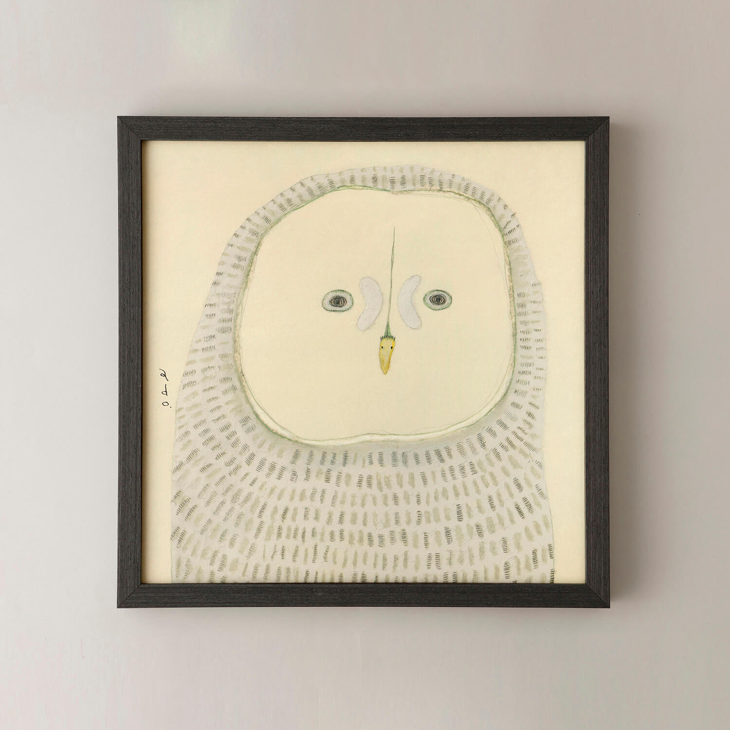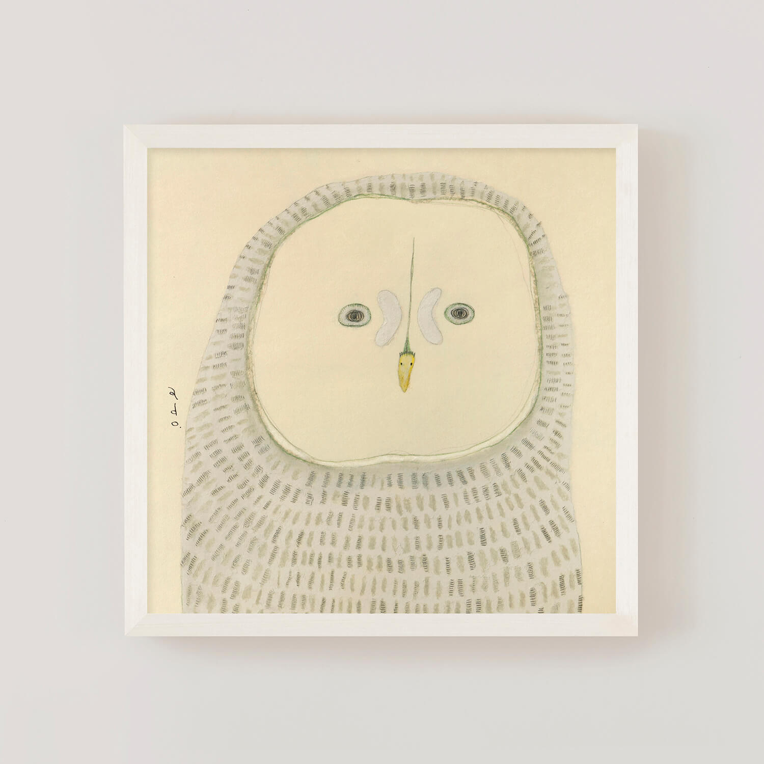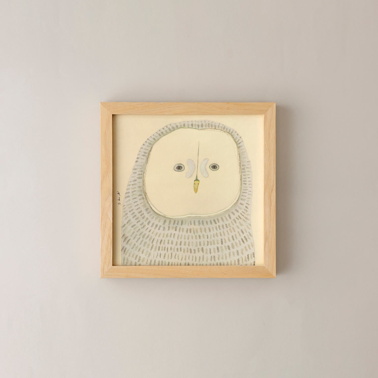 「カラフトフクロウ」がモデル。adoこと渡辺真希子さんが和紙にオイルパステル、色鉛筆、鉛筆などで描く生きものたちは、落ち着いた佇まいが特徴。まるで心で話しかけるみたいに、じっとこちらを見つめる目に、思わず引き込まれてしまいそうになります。