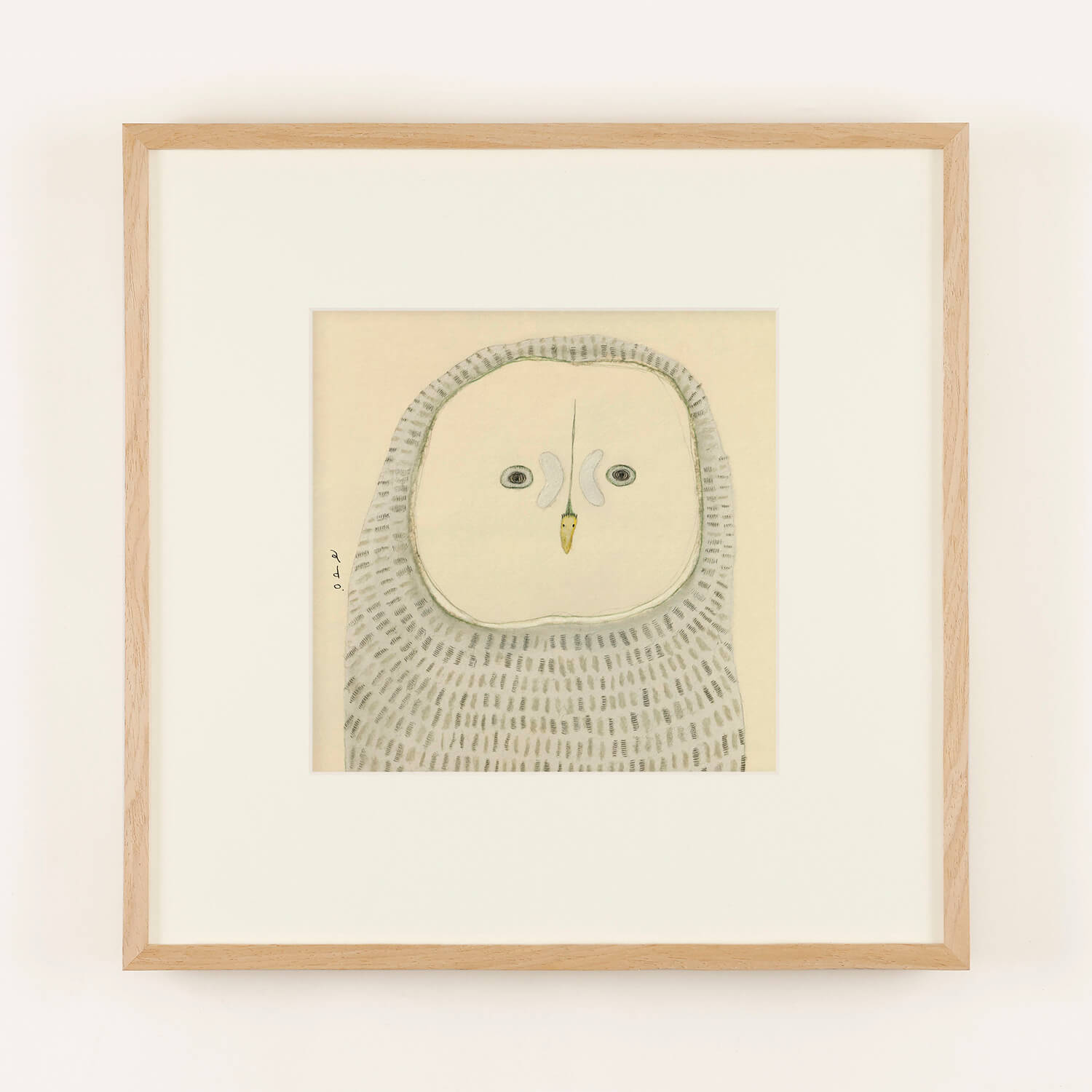 「カラフトフクロウ」がモデル。adoこと渡辺真希子さんが和紙にオイルパステル、色鉛筆、鉛筆などで描く生きものたちは、落ち着いた佇まいが特徴。まるで心で話しかけるみたいに、じっとこちらを見つめる目に、思わず引き込まれてしまいそうになります。