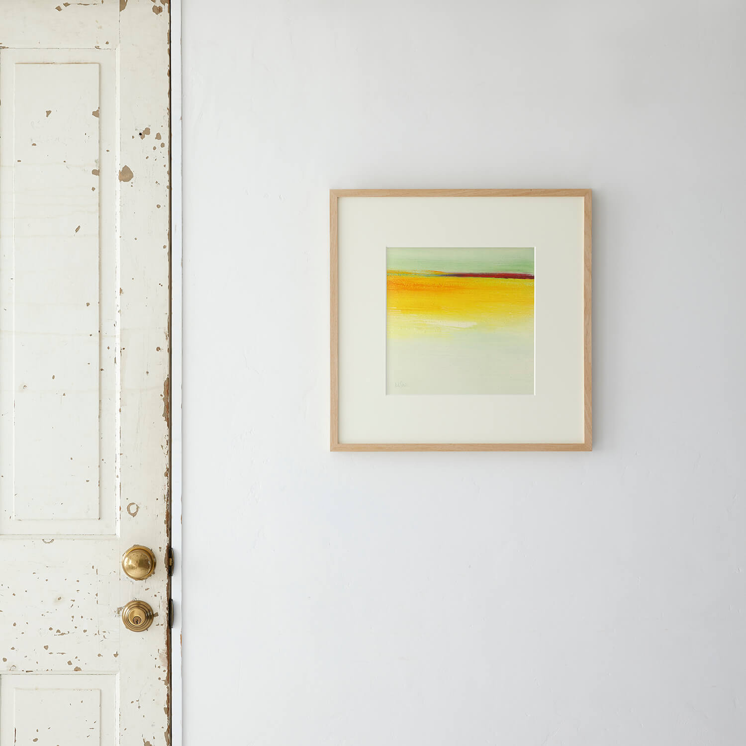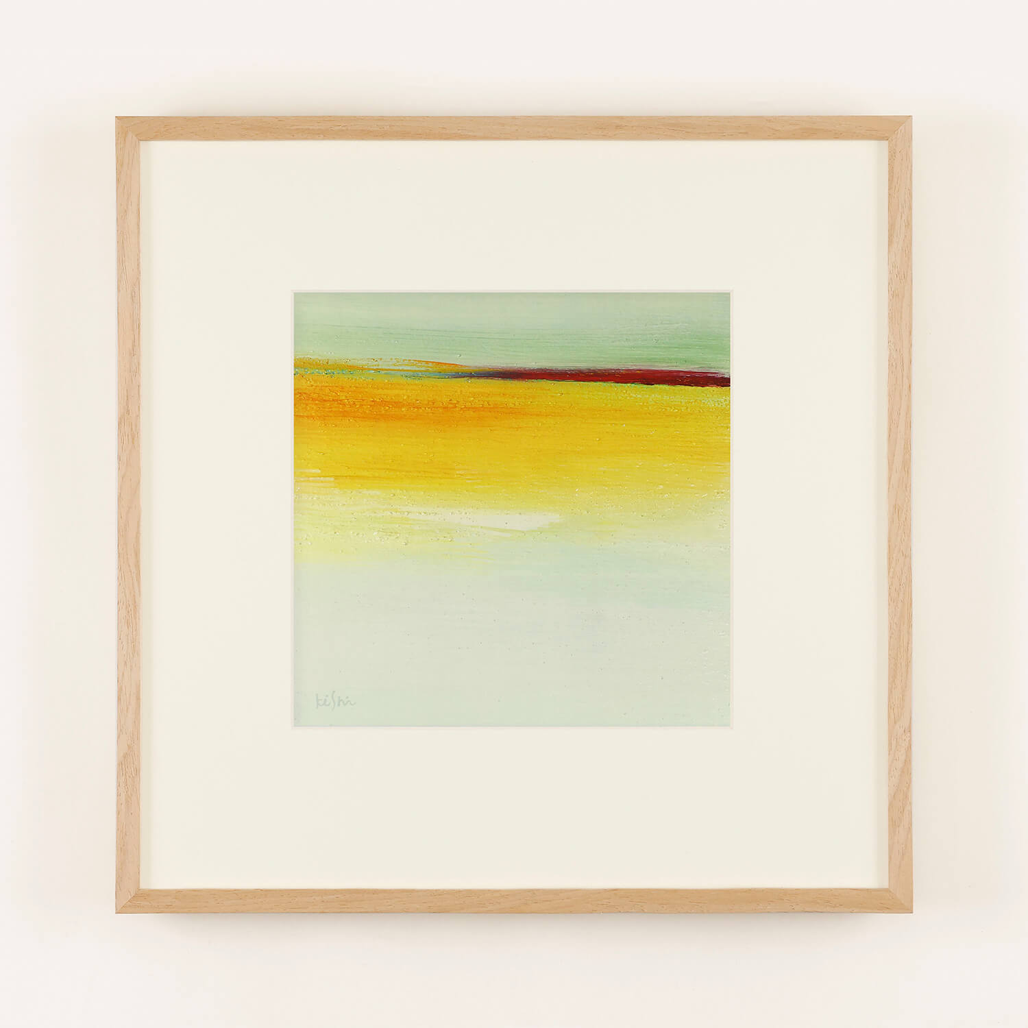力強い色面と繊細なグラデーションが交差し、画面に独特の熱量とひらけた空気感をもたらしています。抽象でありながら、どこか風景のようにも見える不思議な一枚です。