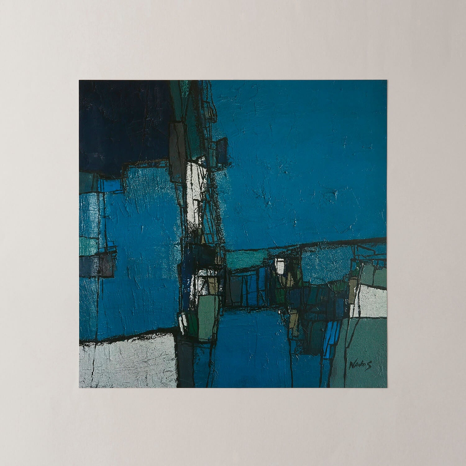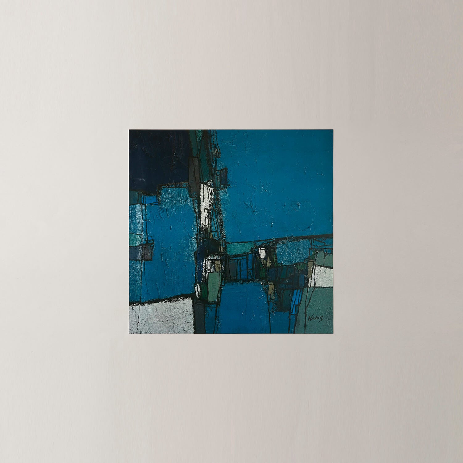 島上直子さんの作品は、どれも線と面で構成された抽象的な風景画。基調となる青色は空や海でしょうか。旅をきっかけに描かれたその景色に、ただただ圧倒されます。
