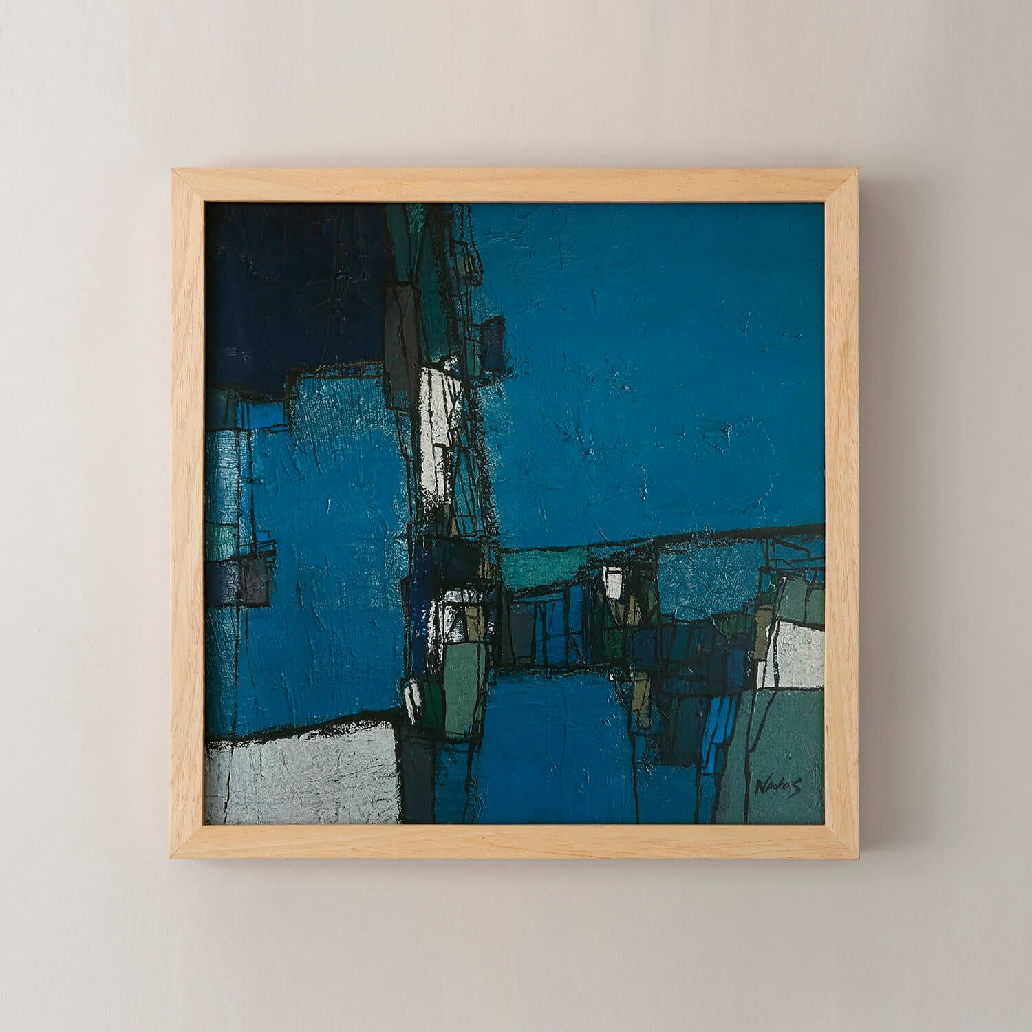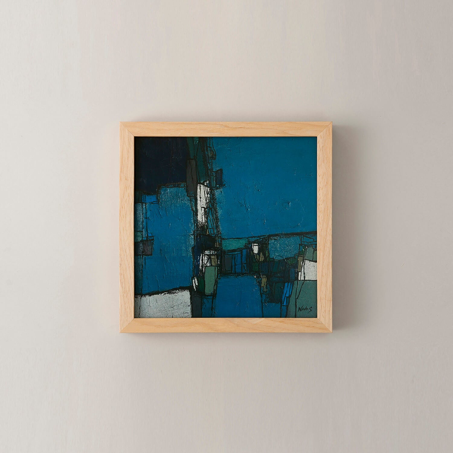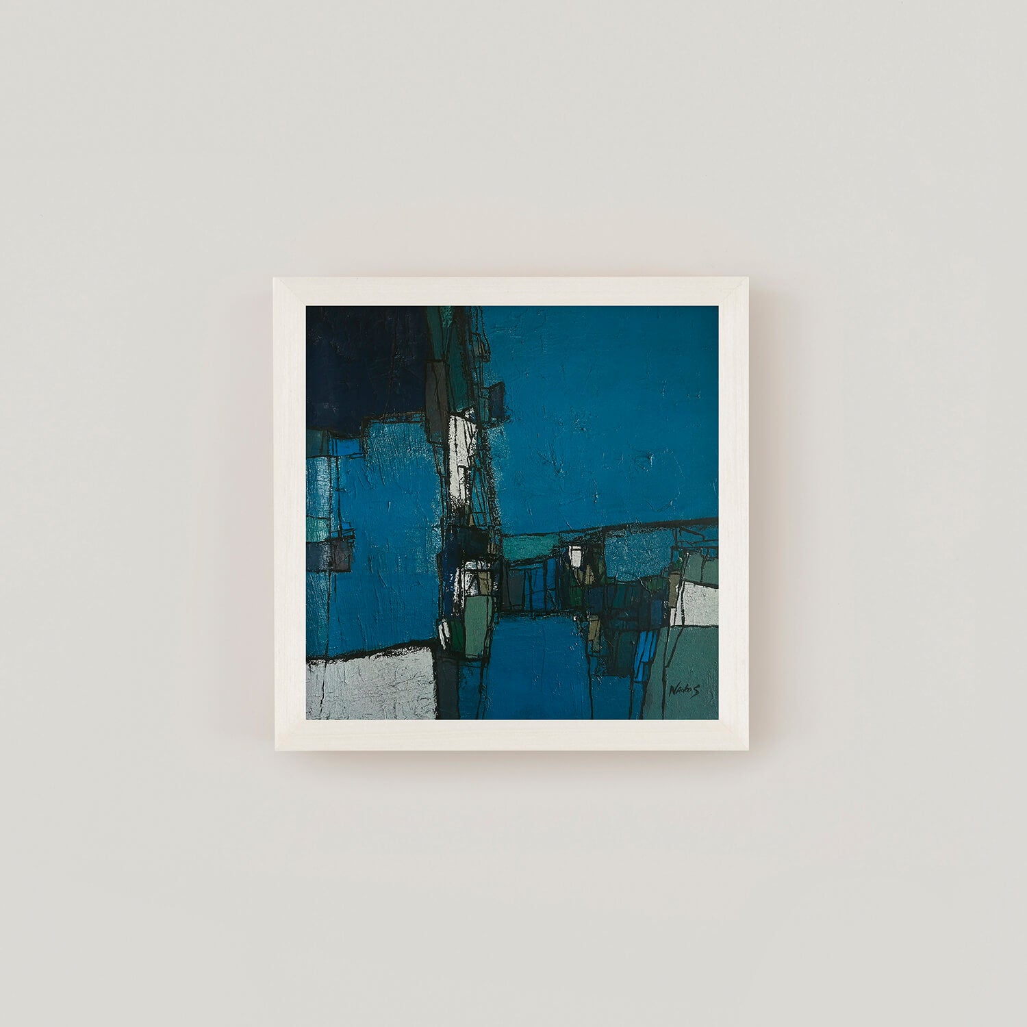 島上直子さんの作品は、どれも線と面で構成された抽象的な風景画。基調となる青色は空や海でしょうか。旅をきっかけに描かれたその景色に、ただただ圧倒されます。
