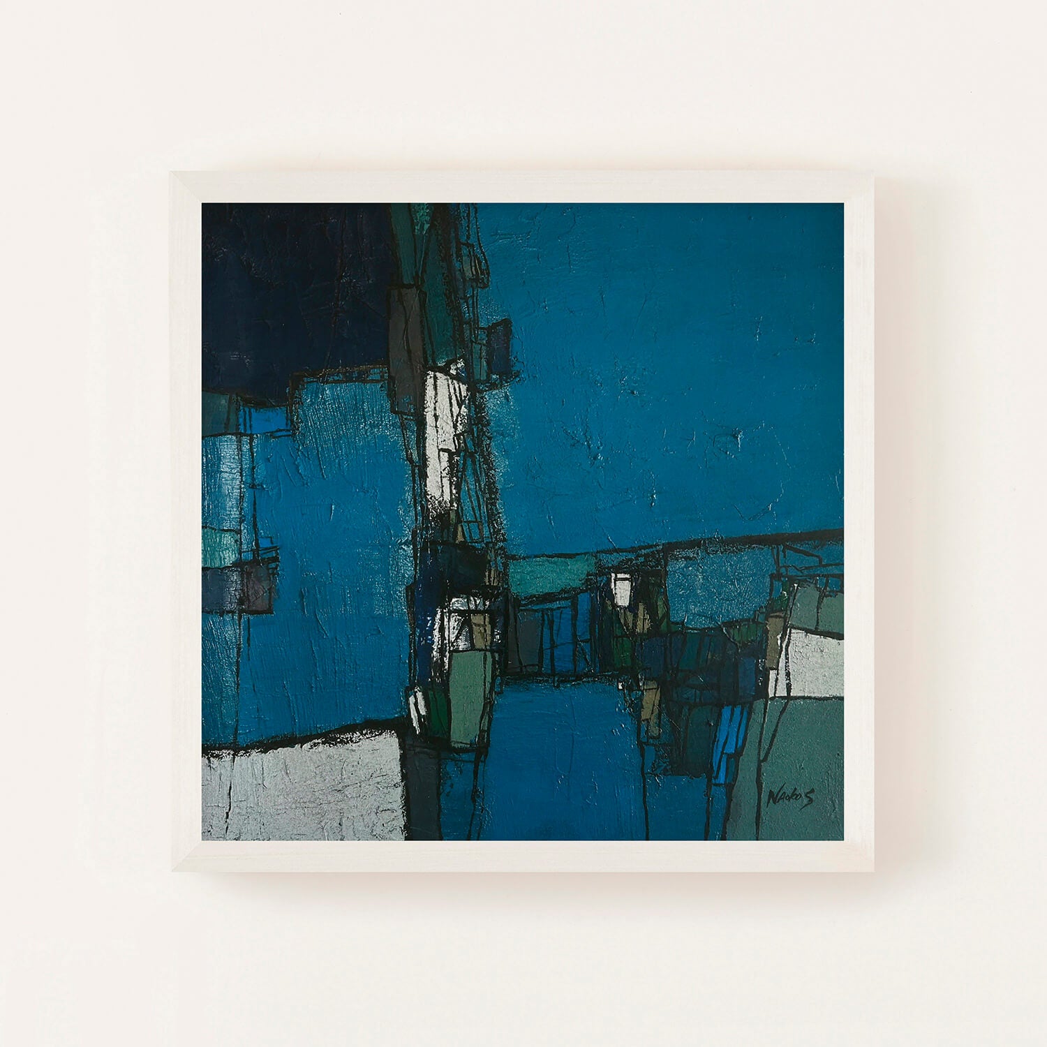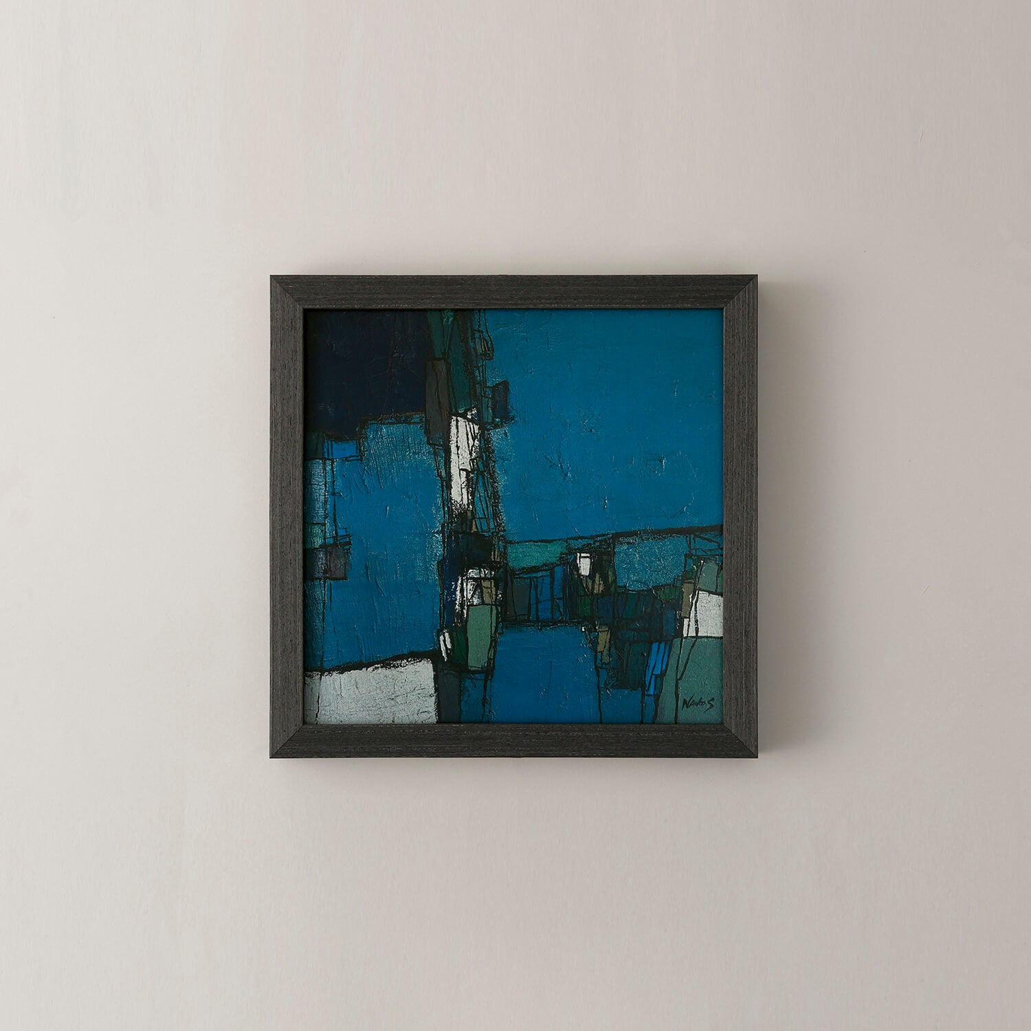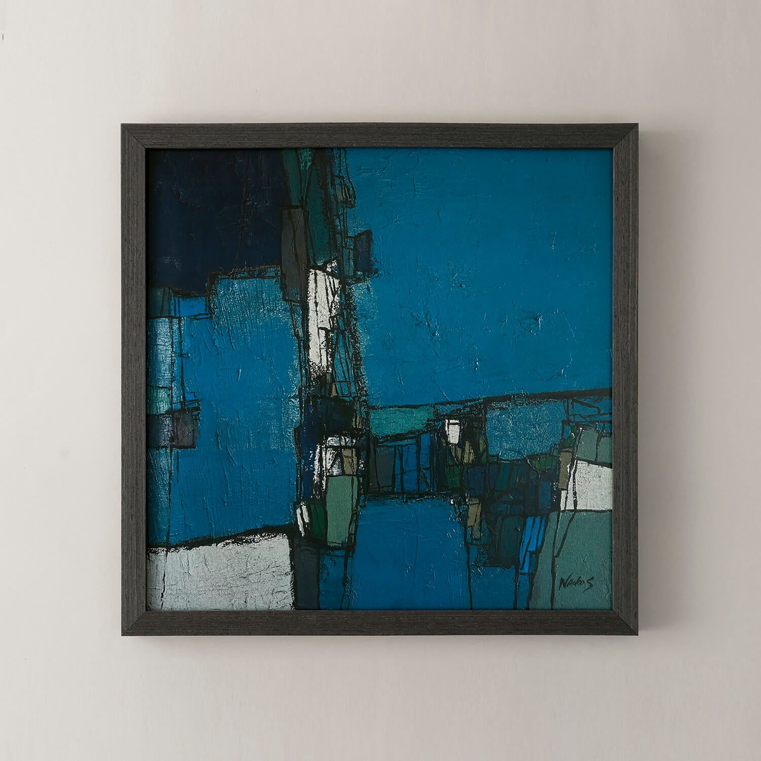 島上直子さんの作品は、どれも線と面で構成された抽象的な風景画。基調となる青色は空や海でしょうか。旅をきっかけに描かれたその景色に、ただただ圧倒されます。