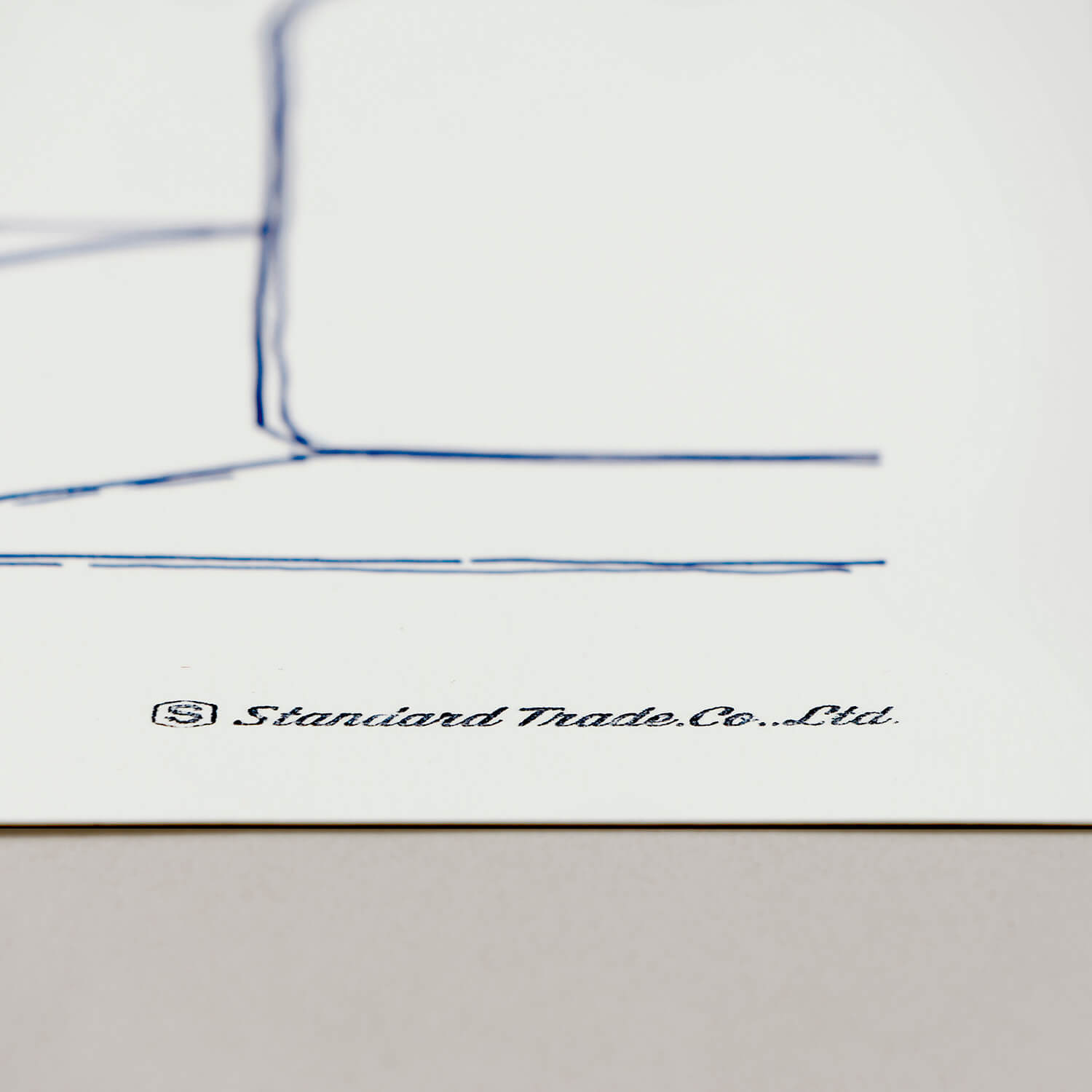 渡邊謙一郎さんご自身が設計した家具を、愛用のブルーペンだけで描いたミニマルな線画。名だたるクリエイターたちに愛される、ブランドの思想がうかがえる作品です。ポスターとして印刷するにあたって、原画に残るインクの漏れや擦れはそのまま活かしました。