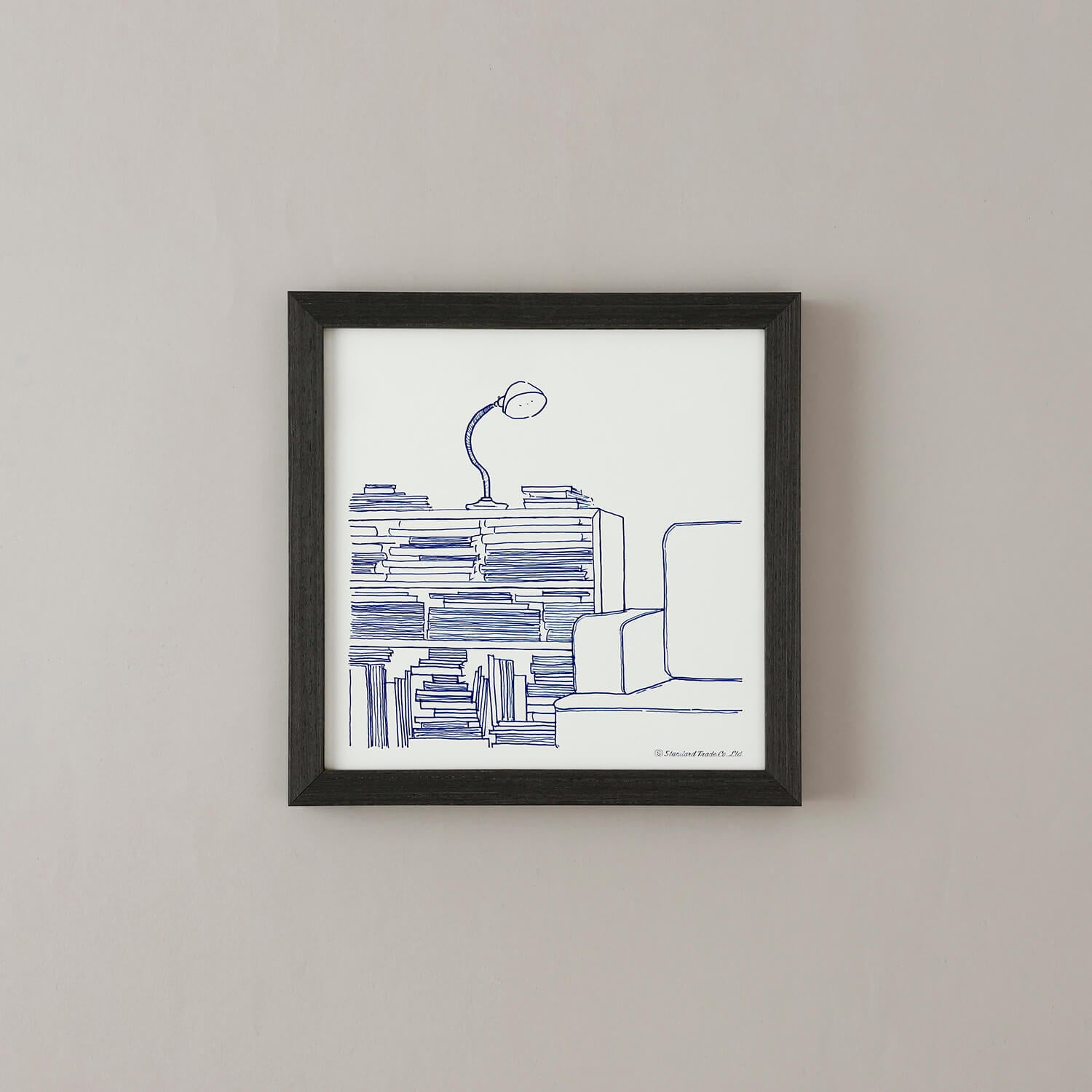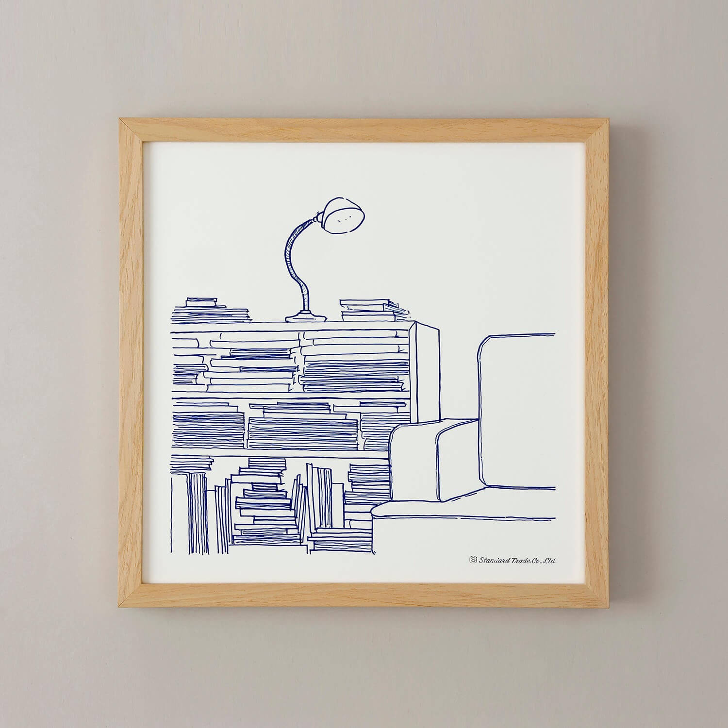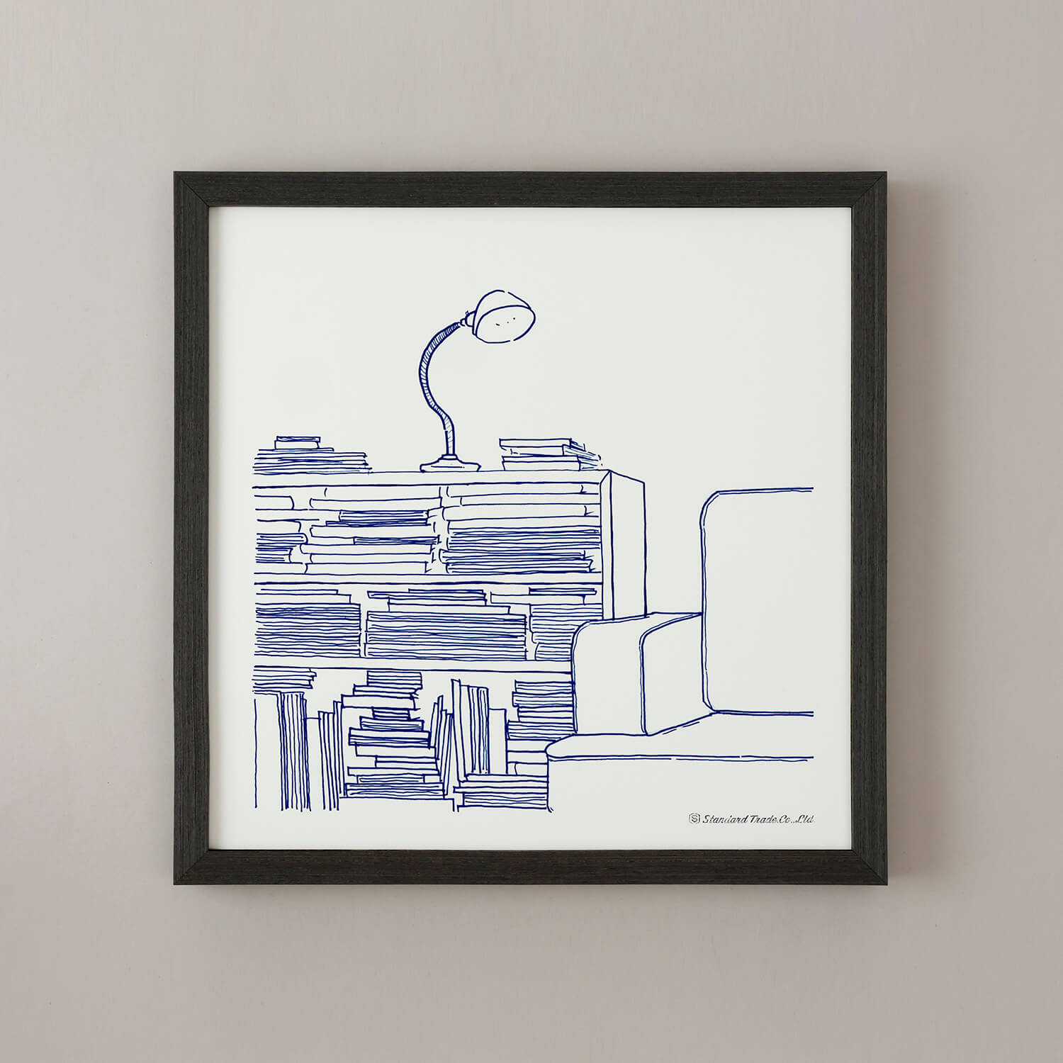 渡邊謙一郎さんご自身が設計した家具を、愛用のブルーペンだけで描いたミニマルな線画。名だたるクリエイターたちに愛される、ブランドの思想がうかがえる作品です。ポスターとして印刷するにあたって、原画に残るインクの漏れや擦れはそのまま活かしました。