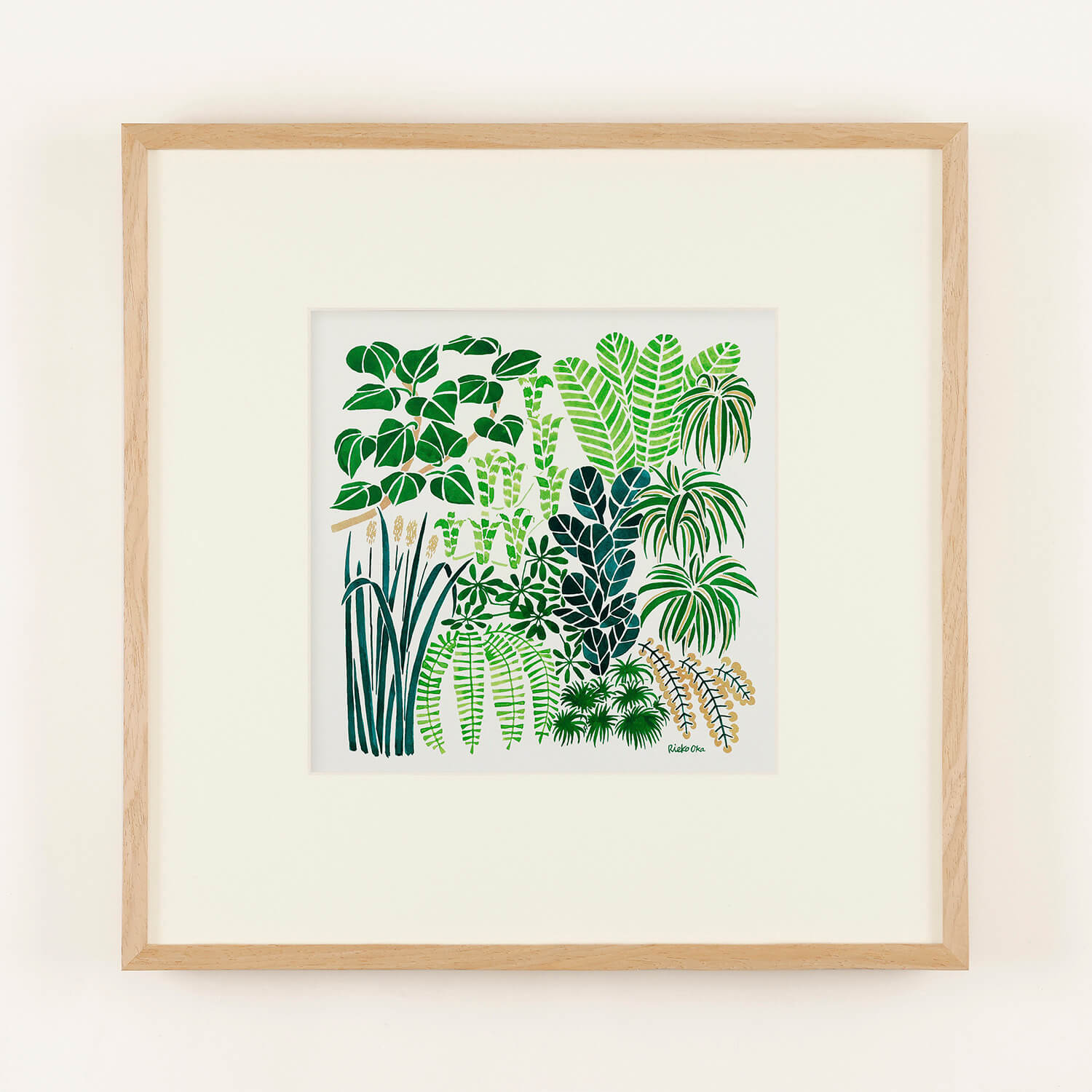 岡理恵子さんによる植物のコレクションのような一枚。さまざまな葉やかたちが重なり合い、画面いっぱいに豊かな緑の世界が広がります。細部まで丁寧に描かれた植物たちは、眺めるたびに小さな発見があり、空間に自然の気配といきいきとした明るさをもたらします。