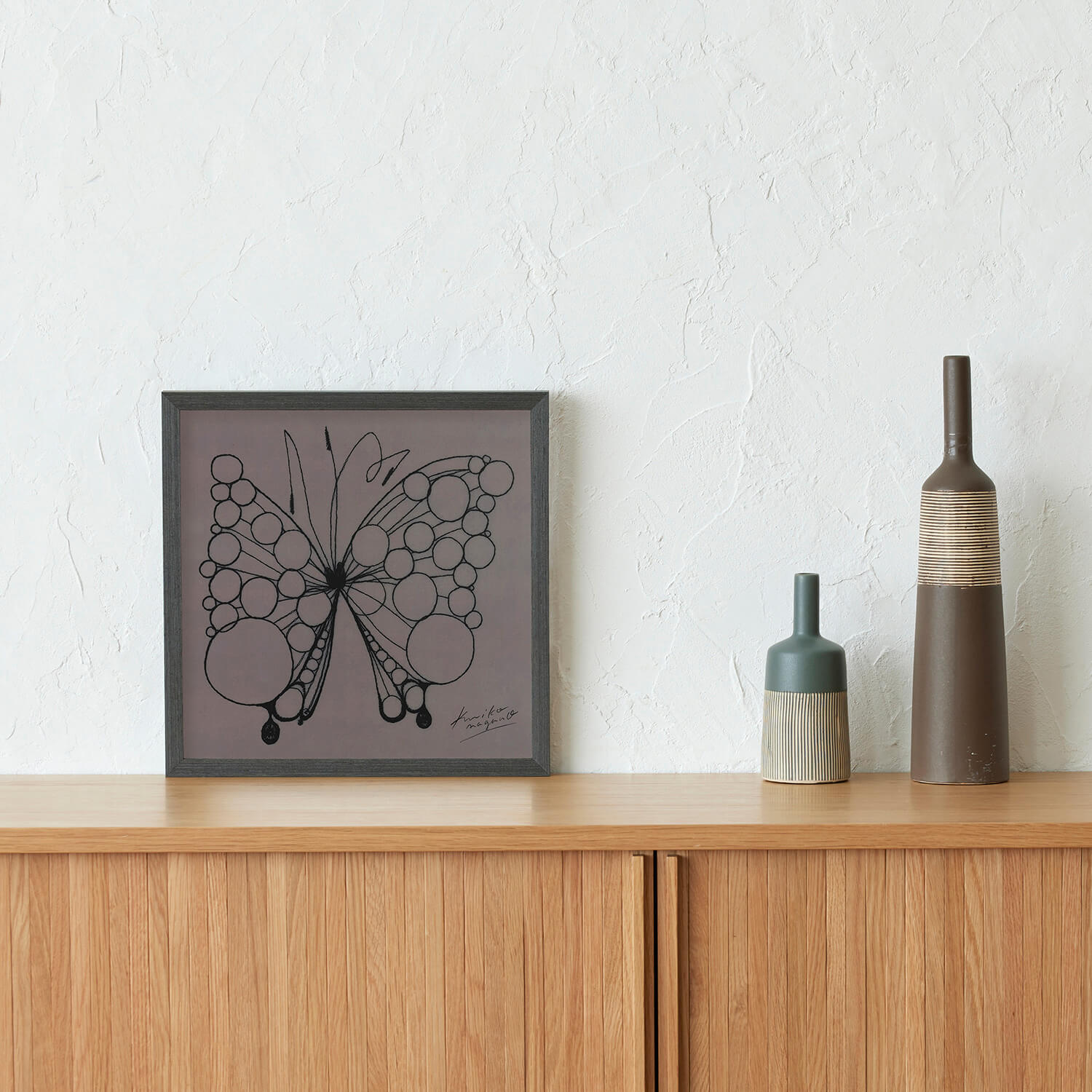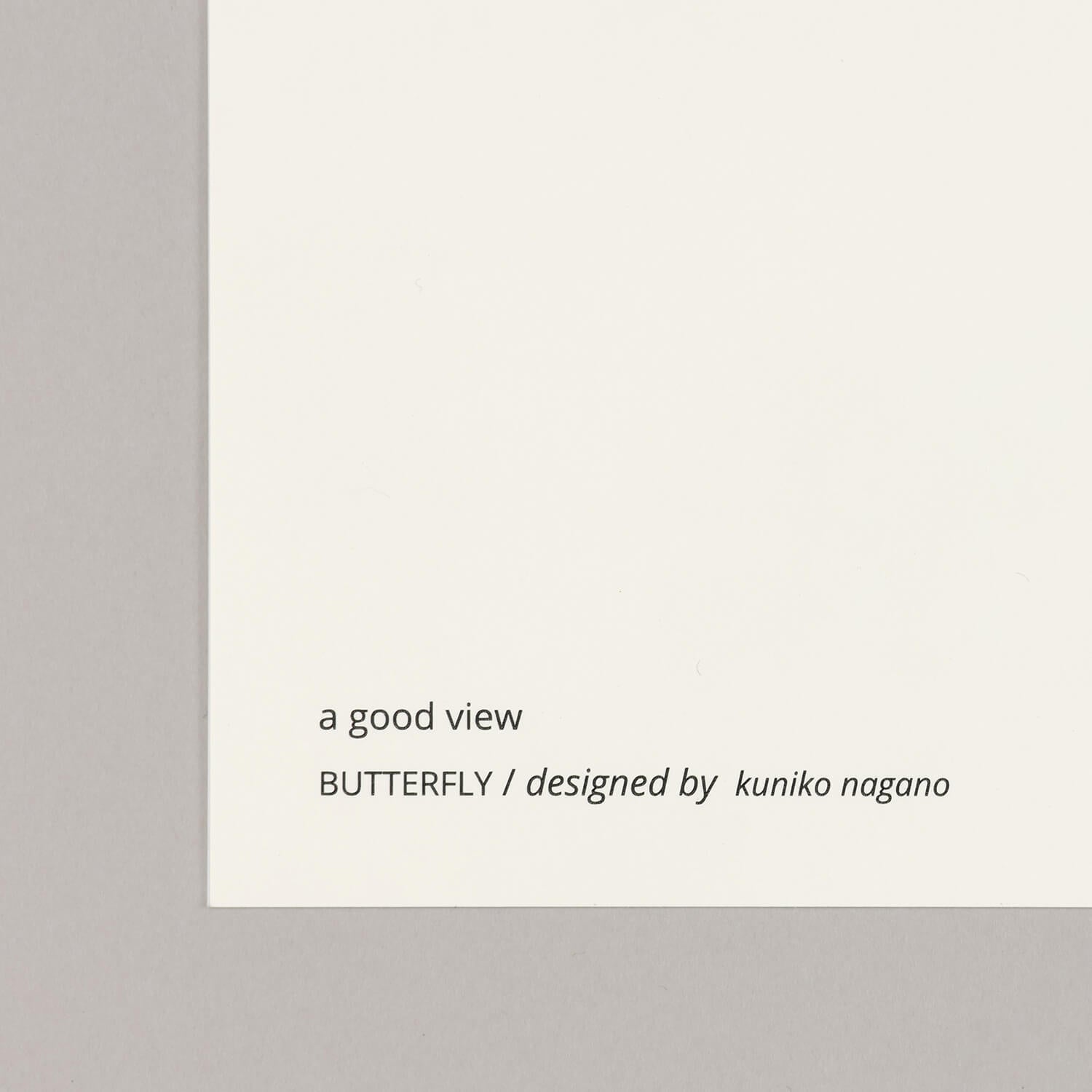 蝶は幼虫からサナギ、成虫へと姿を変えてゆくところから、「不死」「不滅」を表すシンボルとして、日本では家紋や着物の柄などに用いられてきたモチーフです。刺繍で描かれた蝶は堂々と羽を広げ、力強さも感じられます。※このポスターは刺繍で描かれた原画をスキャンして印刷しています。長崎訓子さんの作品。