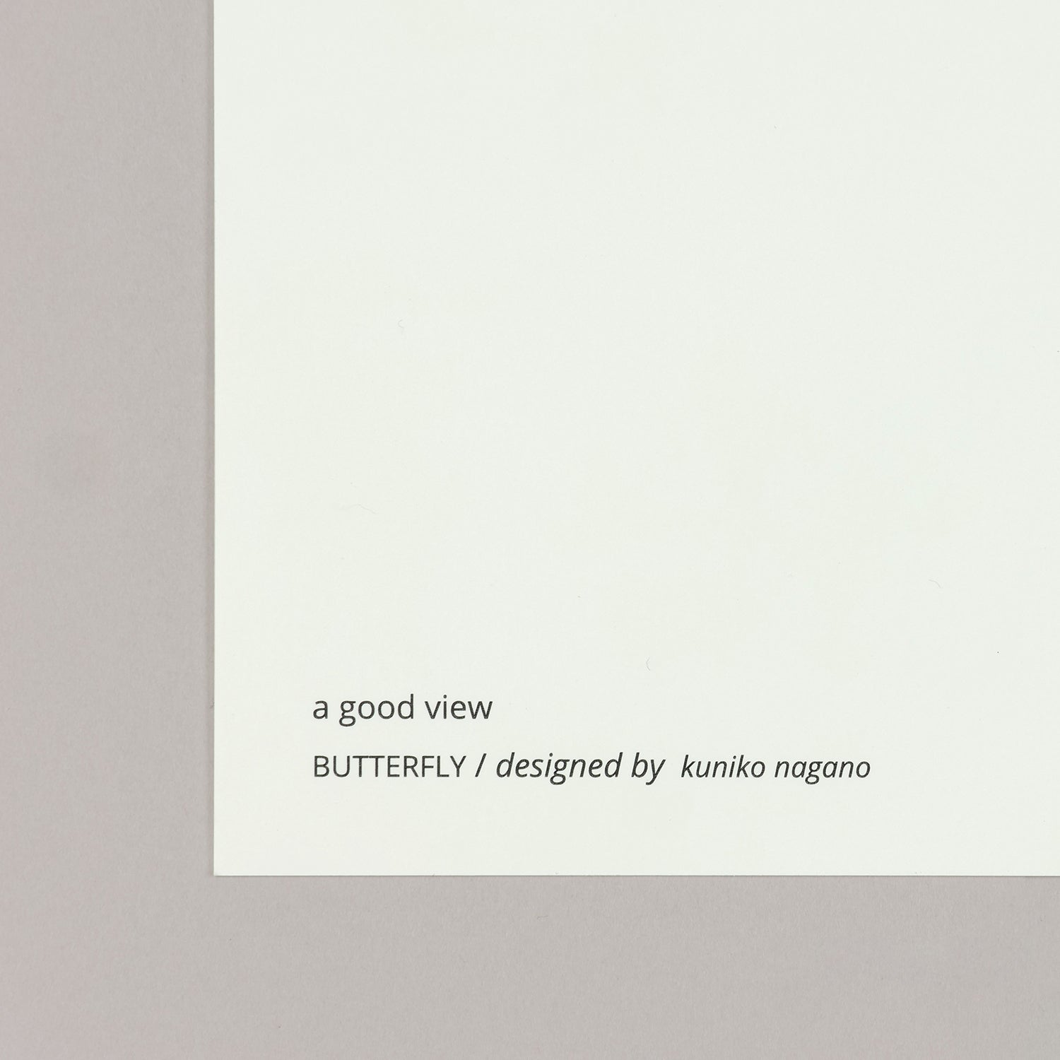 蝶は幼虫からサナギ、成虫へと姿を変えてゆくところから、「不死」「不滅」を表すシンボルとして、日本では家紋や着物の柄などに用いられてきたモチーフです。刺繍で描かれた蝶は堂々と羽を広げ、力強さも感じられます。※このポスターは刺繍で描かれた原画をスキャンして印刷しています。長崎訓子さんの作品。