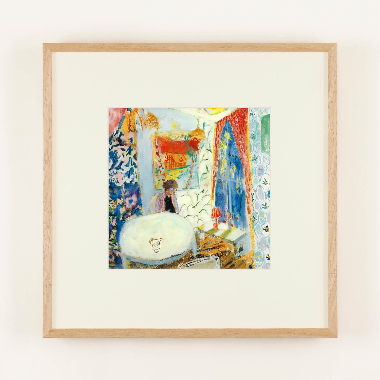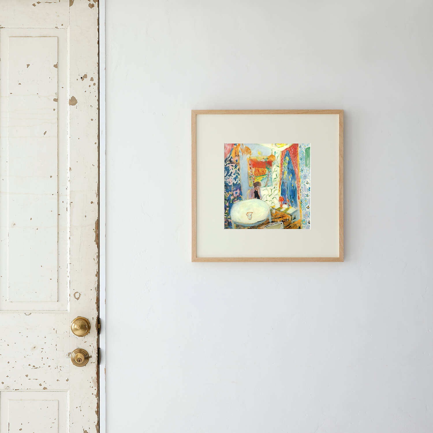 一見夜のカフェに思えますが、窓際に置かれたスタンドの影をつくるのは、窓から入る陽の光か天井の照明か。少しうつむき加減に物思いにふける女性と、テーブルの端にぽつんと置かれたピッチャーとの距離感が絶妙。栗原あきさんの作品です。