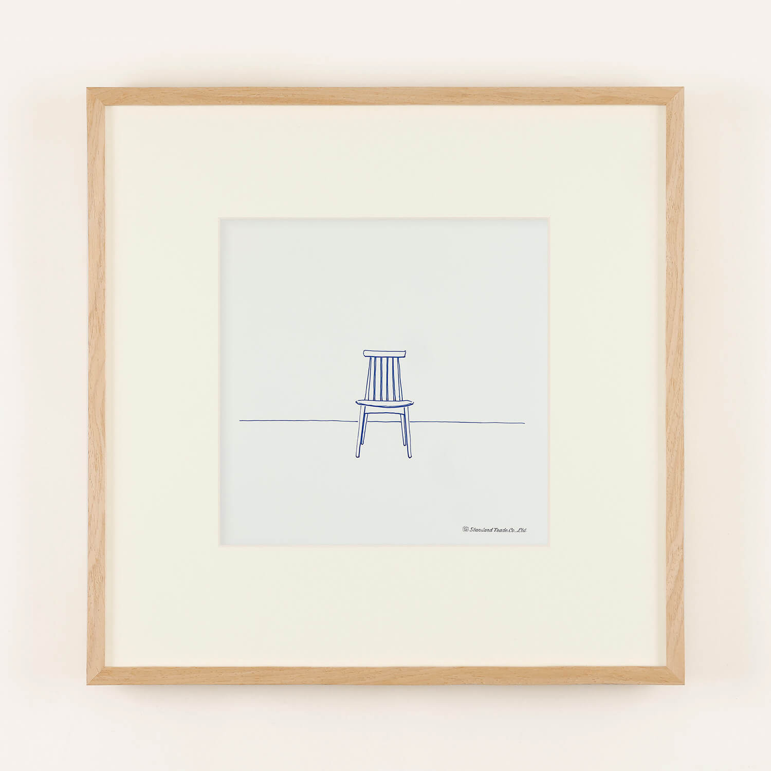 渡邊謙一郎さんご自身が設計した家具を、愛用のブルーペンだけで描いたミニマルな線画。名だたるクリエイターたちに愛される、ブランドの思想がうかがえる作品です。ポスターとして印刷するにあたって、原画に残るインクの漏れや擦れはそのまま活かしました。