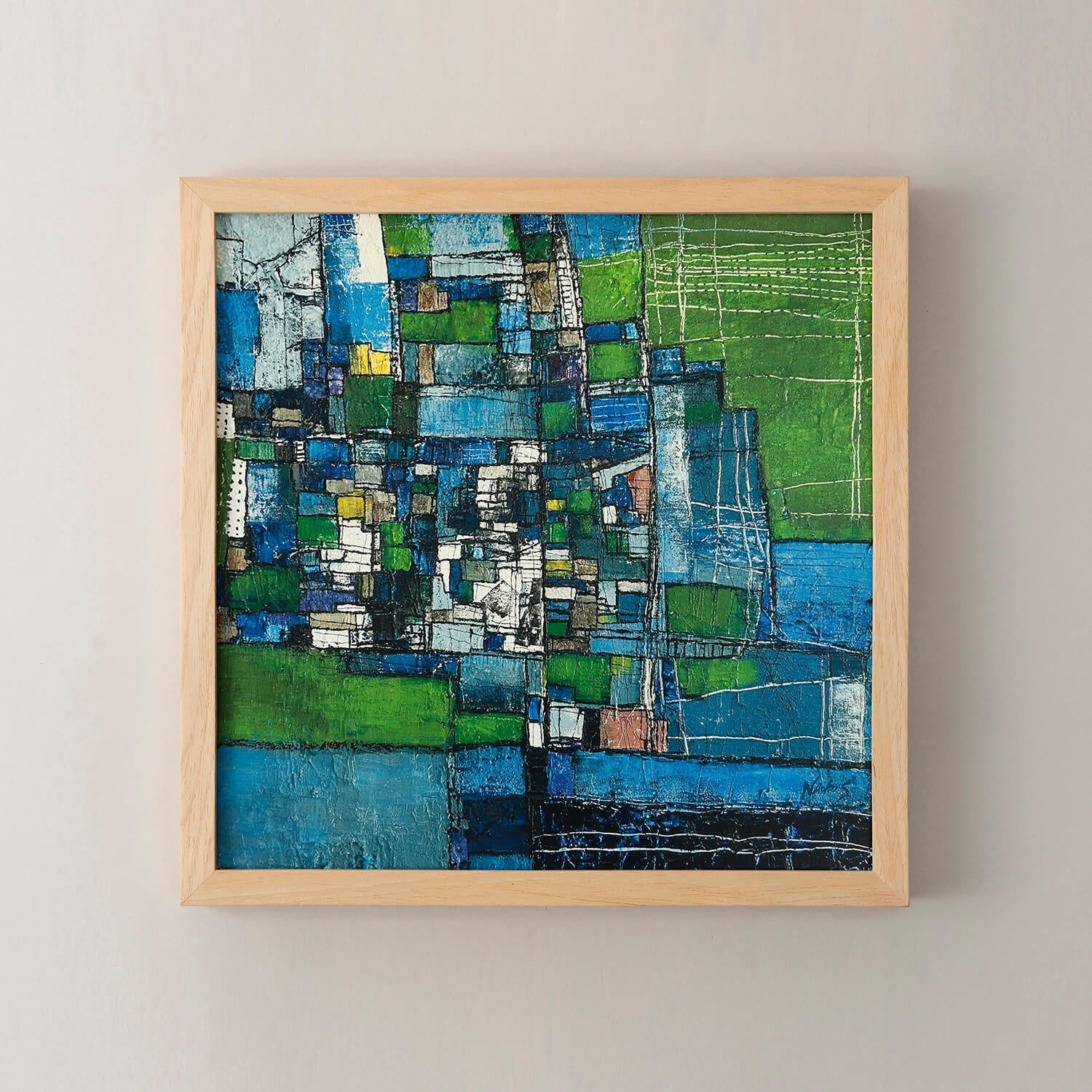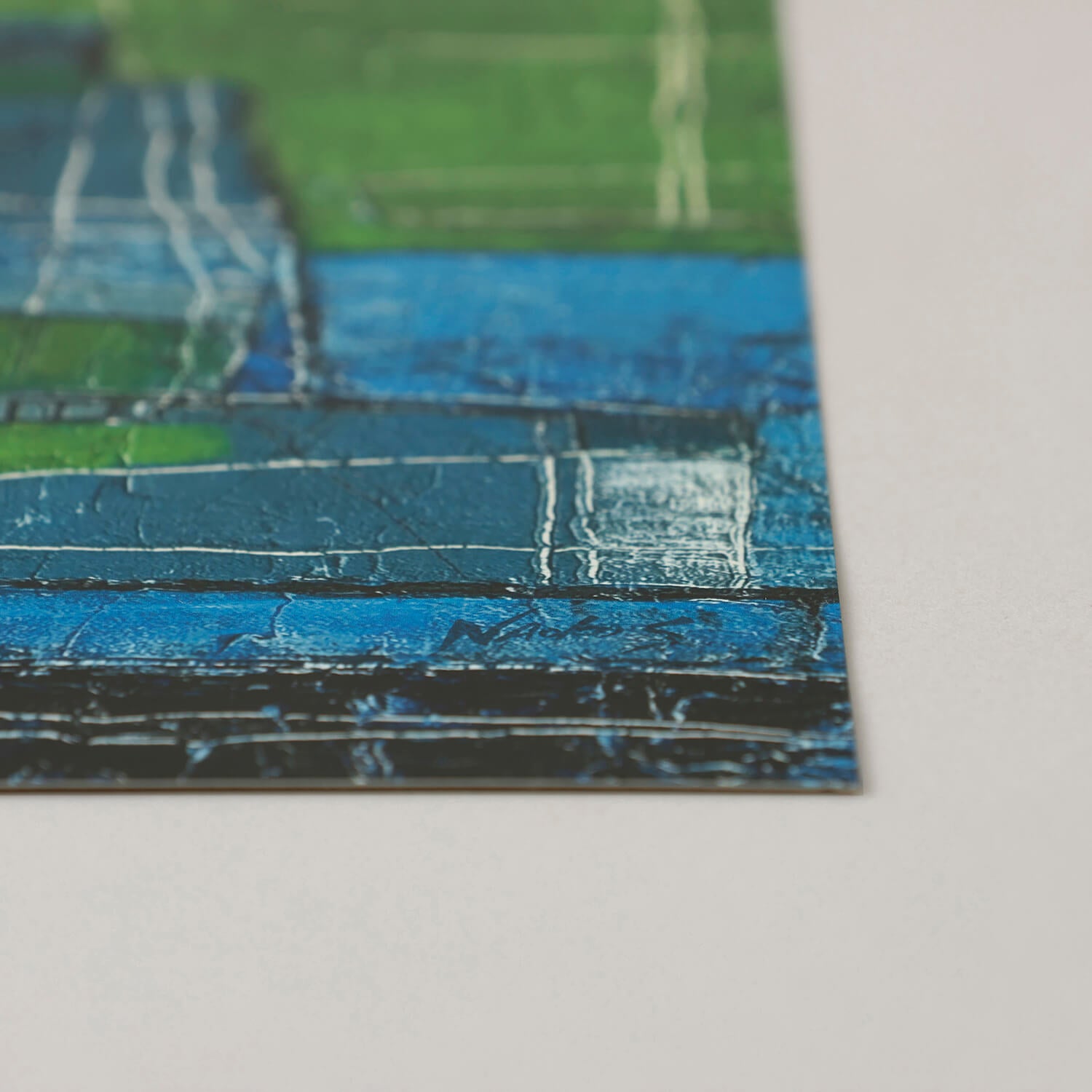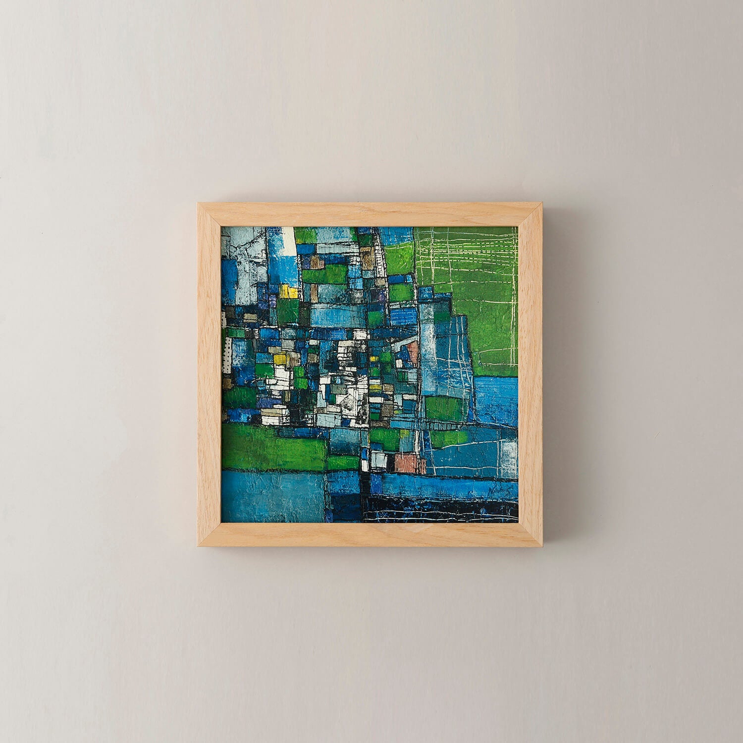 島上直子さんの作品は、どれも線と面で構成された抽象的な風景画。基調となる青色は空や海でしょうか。旅をきっかけに描かれたその景色に、ただただ圧倒されます。
