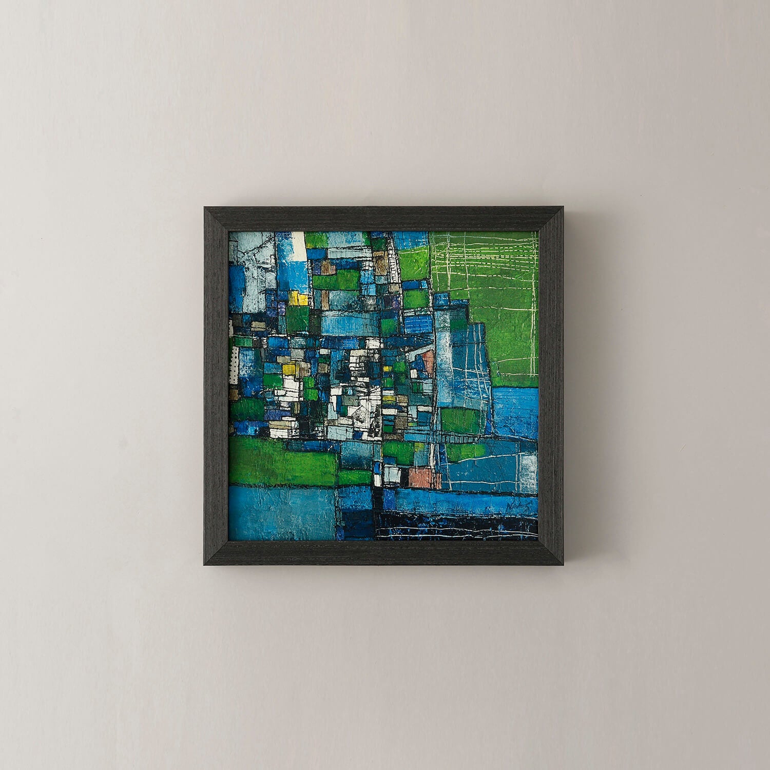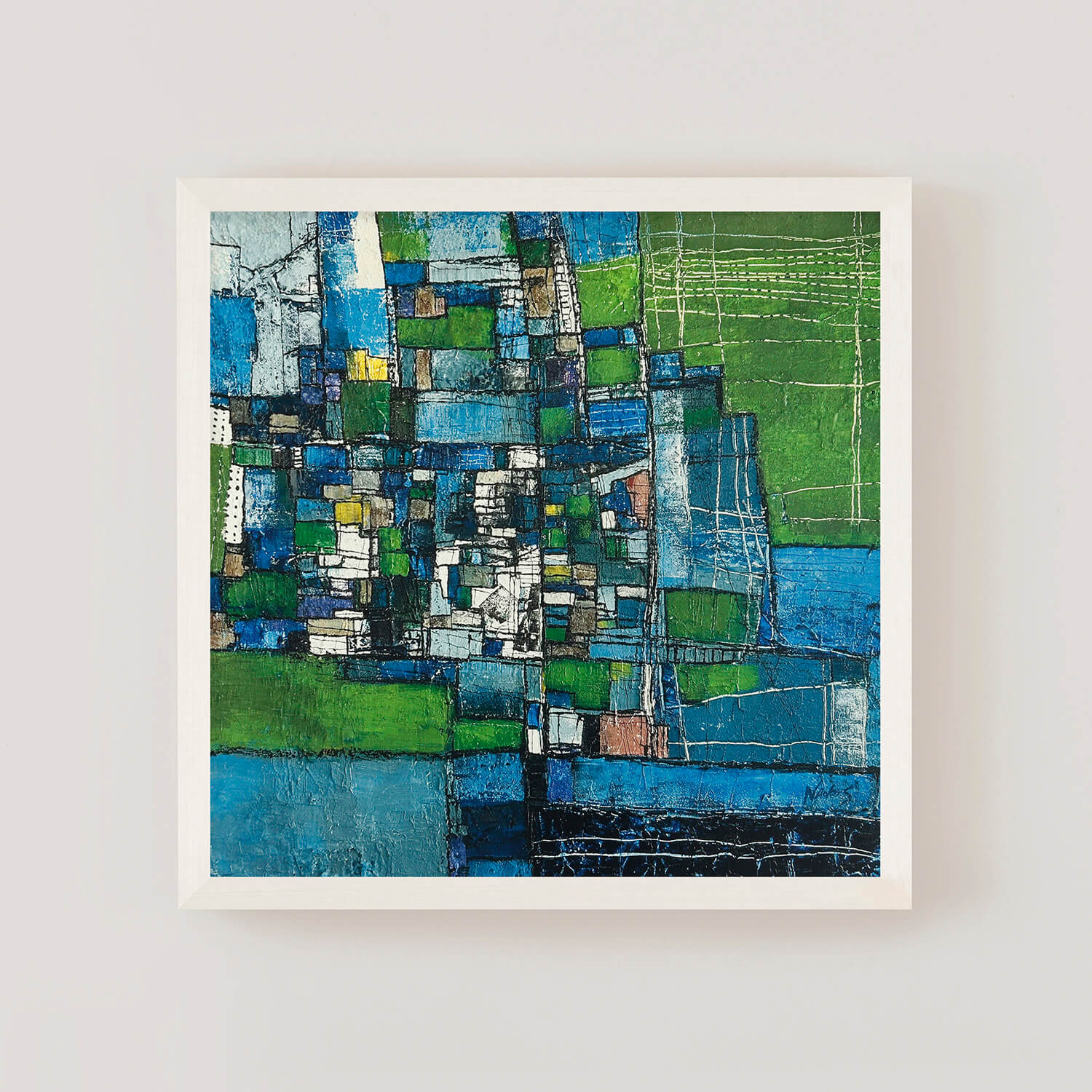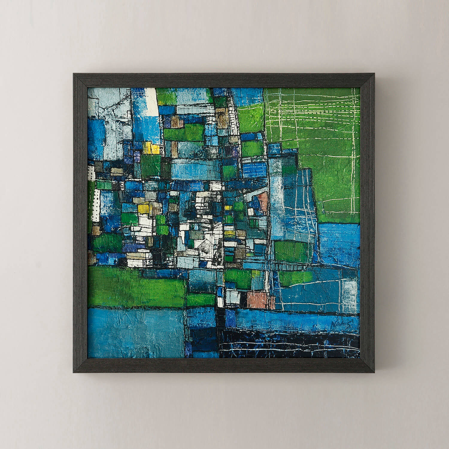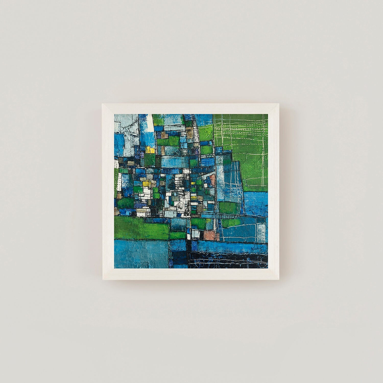 島上直子さんの作品は、どれも線と面で構成された抽象的な風景画。基調となる青色は空や海でしょうか。旅をきっかけに描かれたその景色に、ただただ圧倒されます。