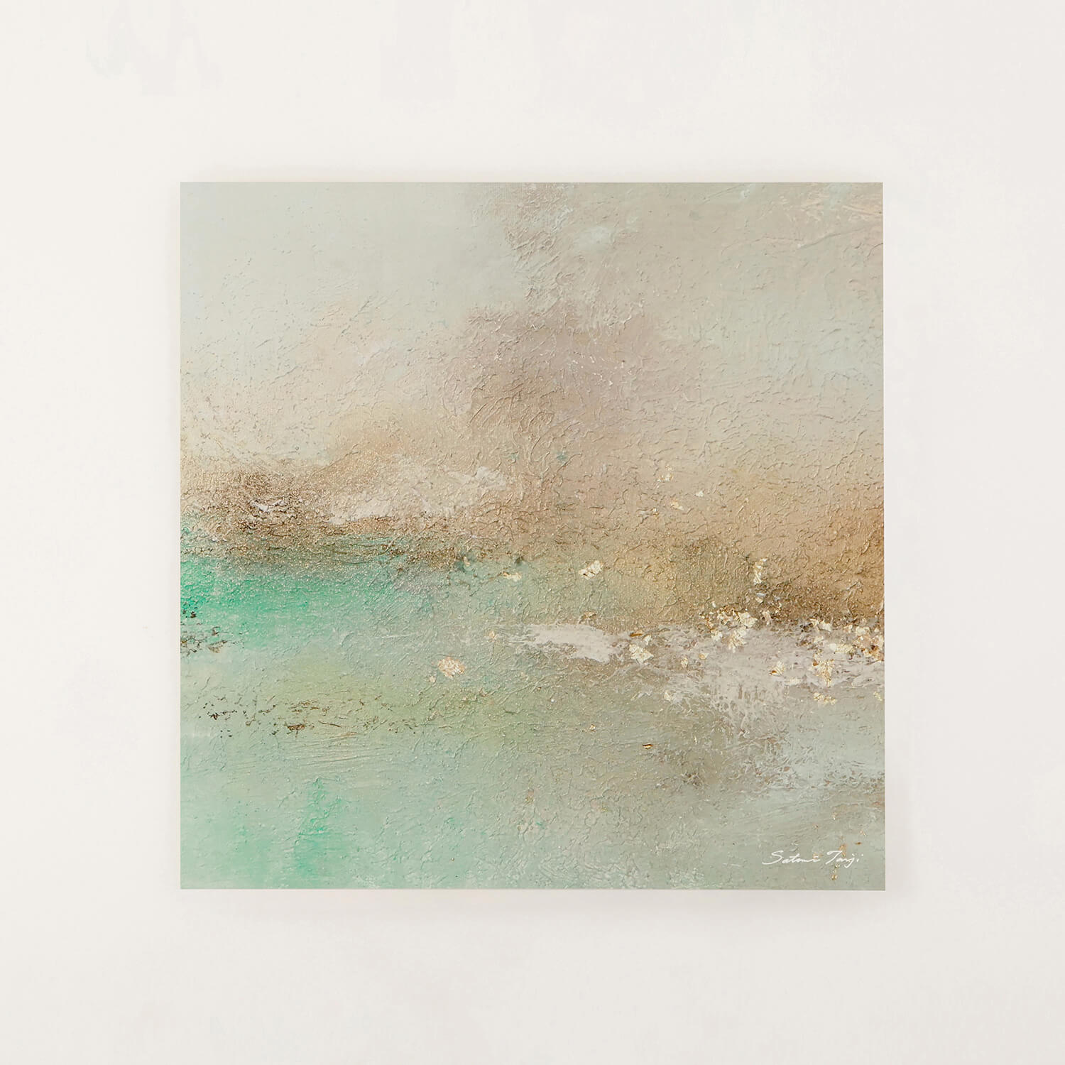 タンジサトミさんの抽象作品。淡いベージュとグリーンが溶け合い、やさしい大地や水辺を思わせる風景が広がります。表面の質感や金色のきらめきが光を受けて揺らぎ、眺めるたびに新しい表情を見せてくれます。空間に穏やかな輝きを添える一枚です。