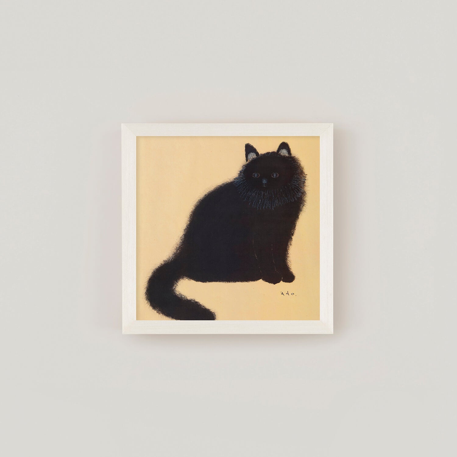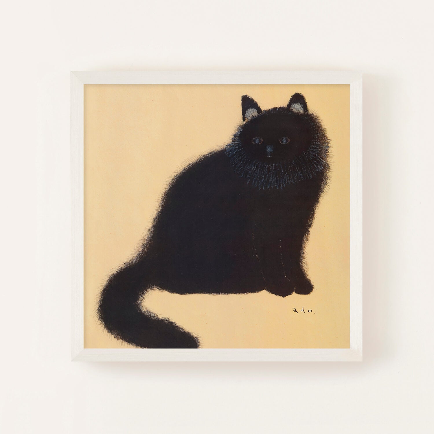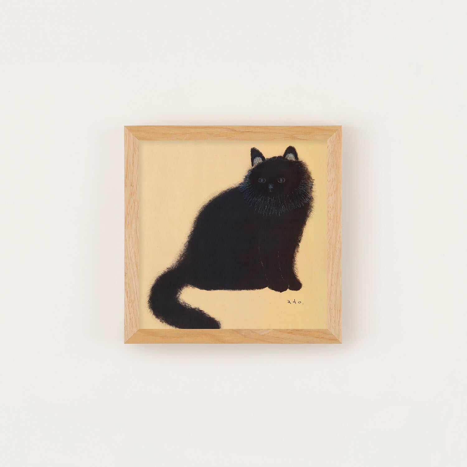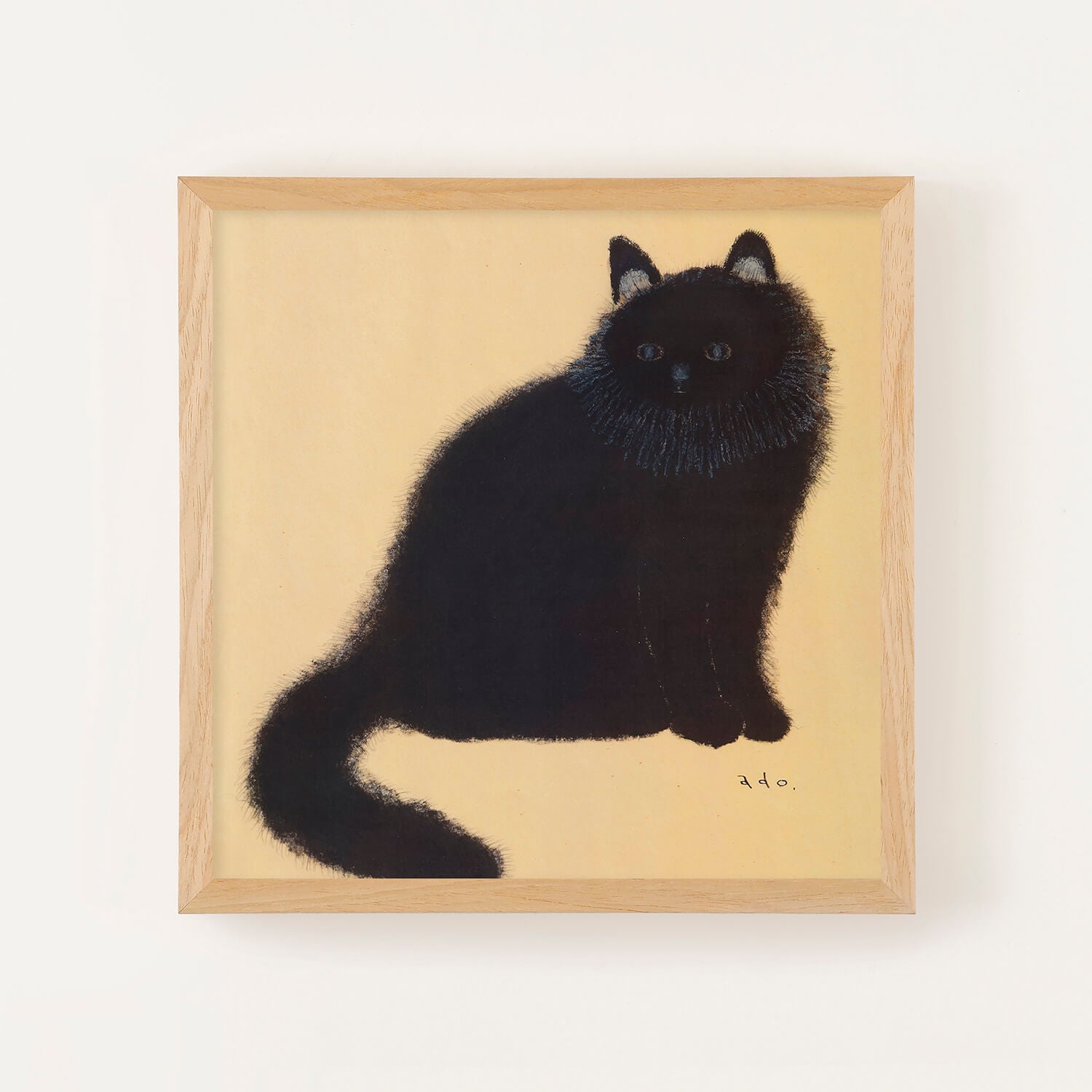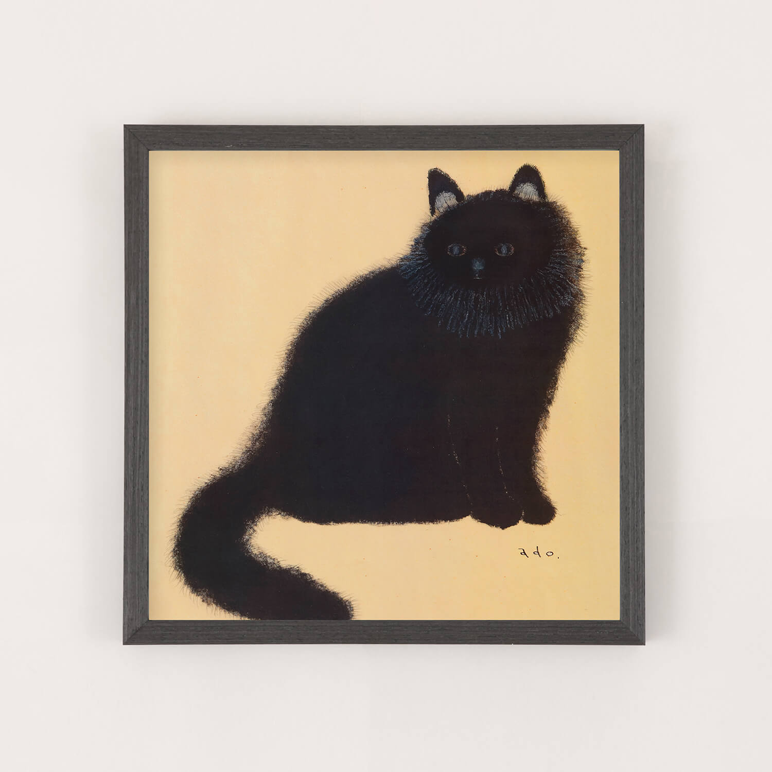 黄金色に輝くような背景の中、長毛の黒猫がこちらをじっと見つめています。日本画を思わせる落ち着いた色調と、adoさんが一本一本丁寧に描いた繊細な毛並みが印象的な作品です。吸い込まれるような青い瞳とシンプルな構図の中に深い存在感があり、飾るたびに新たな表情を見せてくれます。猫好きの方はもちろん、動物画に興味のある方にもおすすめの一枚です。