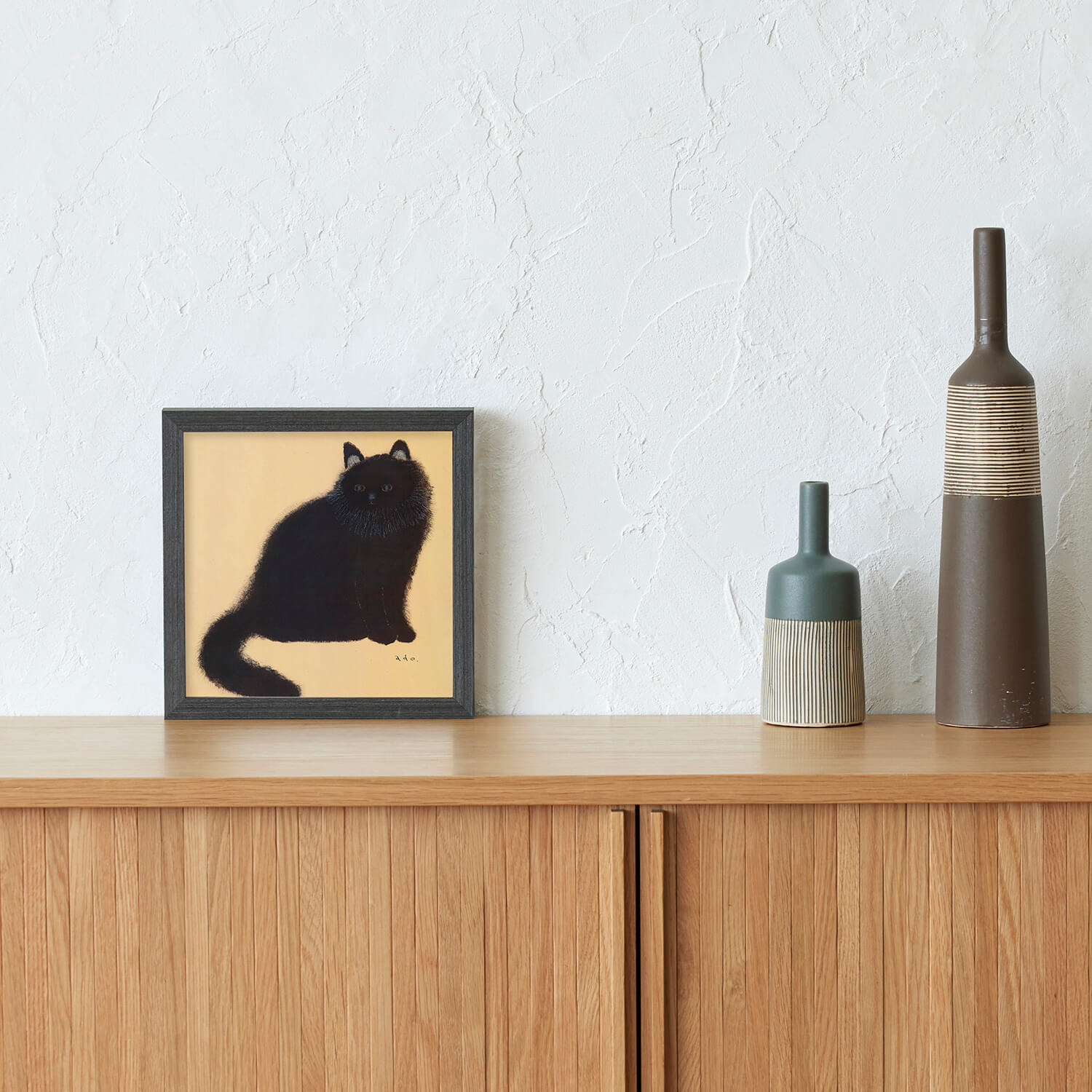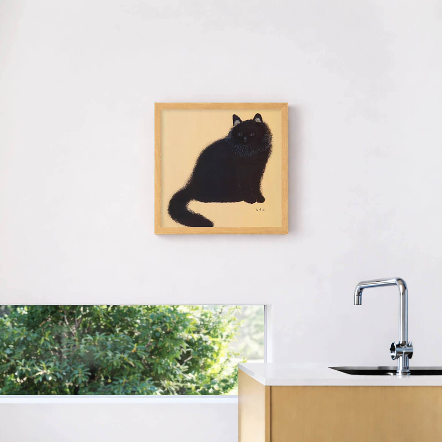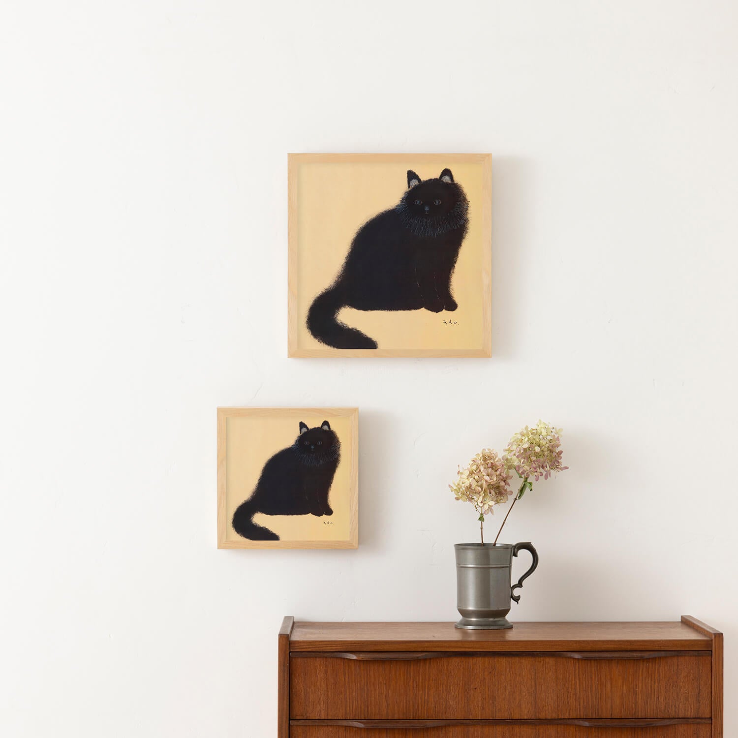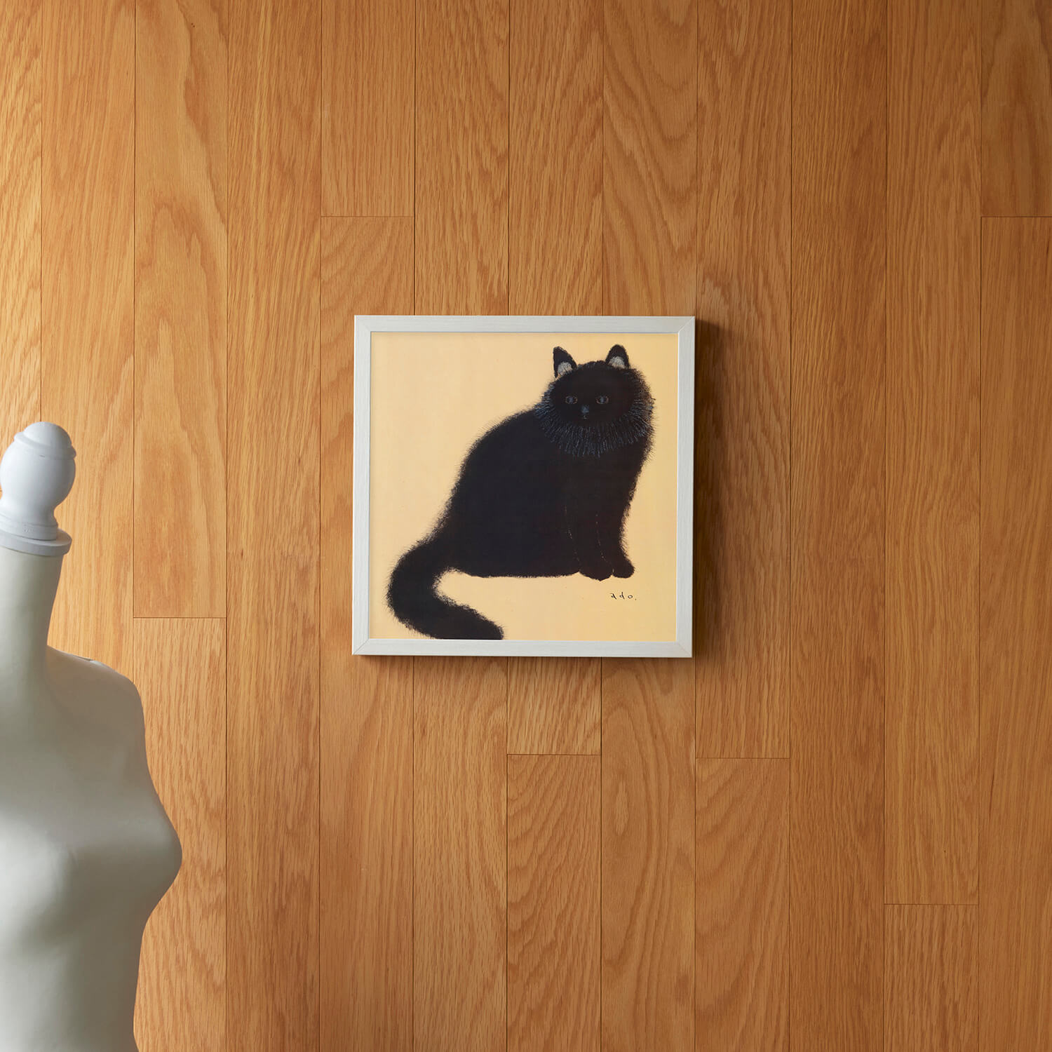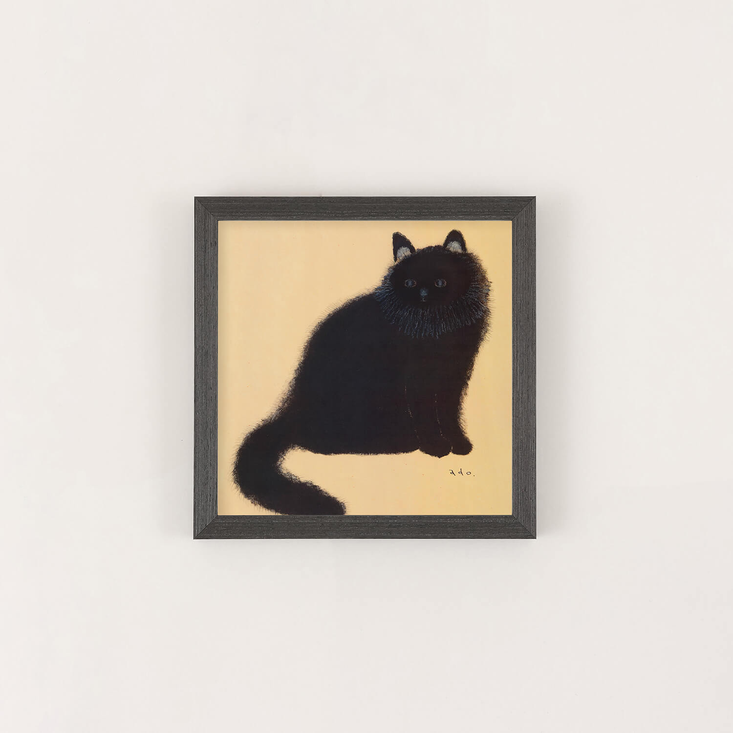 黄金色に輝くような背景の中、長毛の黒猫がこちらをじっと見つめています。日本画を思わせる落ち着いた色調と、adoさんが一本一本丁寧に描いた繊細な毛並みが印象的な作品です。吸い込まれるような青い瞳とシンプルな構図の中に深い存在感があり、飾るたびに新たな表情を見せてくれます。猫好きの方はもちろん、動物画に興味のある方にもおすすめの一枚です。