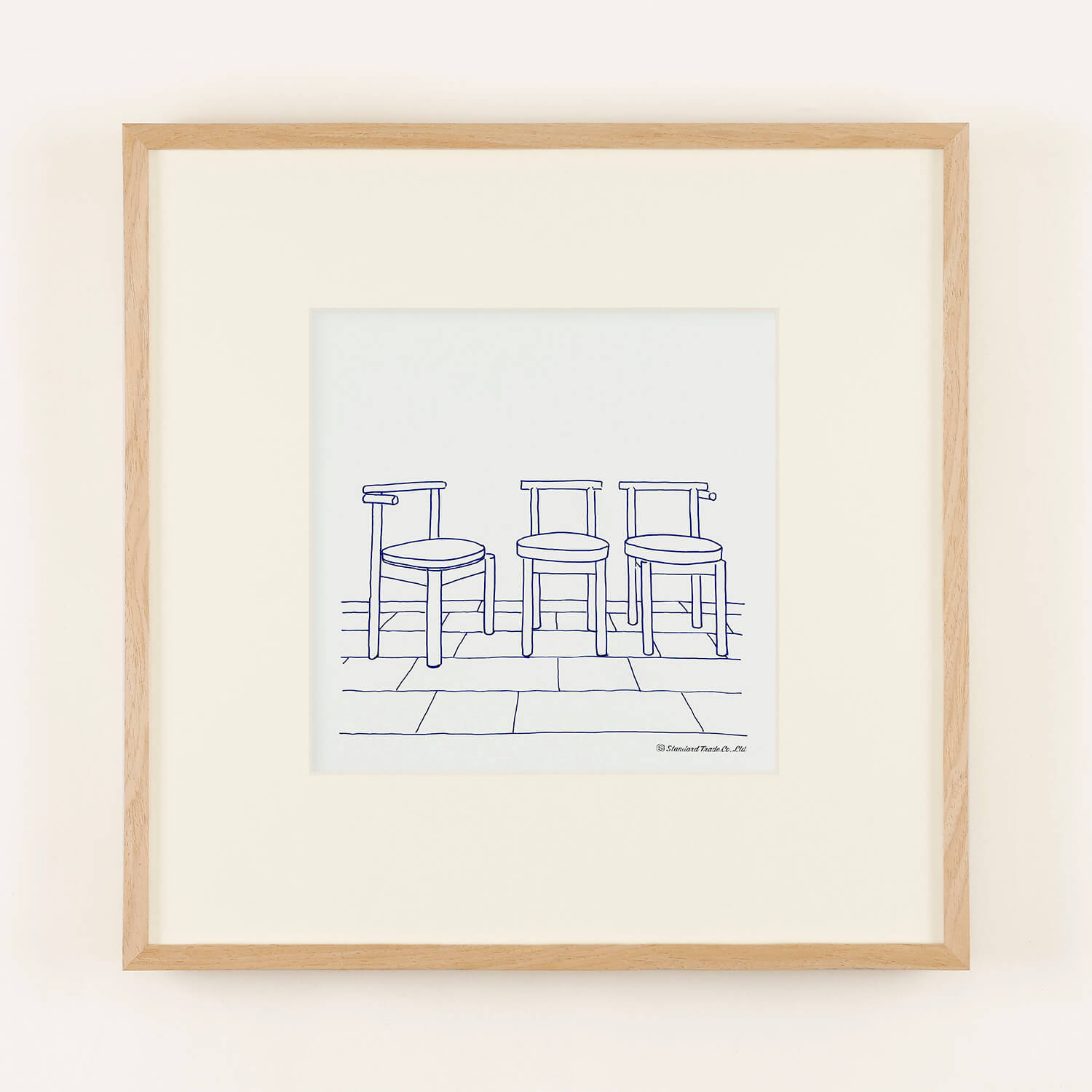 渡邊謙一郎さんご自身が設計した家具を、愛用のブルーペンだけで描いたミニマルな線画。名だたるクリエイターたちに愛される、ブランドの思想がうかがえる作品です。ポスターとして印刷するにあたって、原画に残るインクの漏れや擦れはそのまま活かしました。