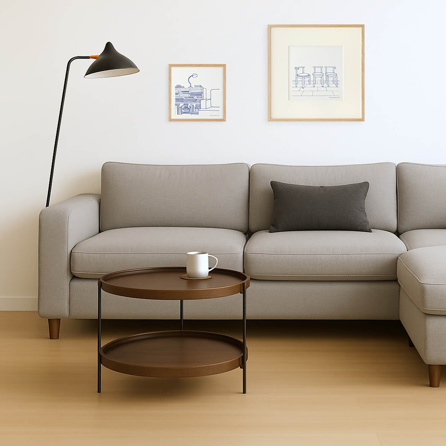 乾燥や湿気による形状変化を抑えるため松の木を加工したパイン材を芯材に使用し、木目が綺麗で反りや割れも少ない突板を巻いたオリジナルフレーム。