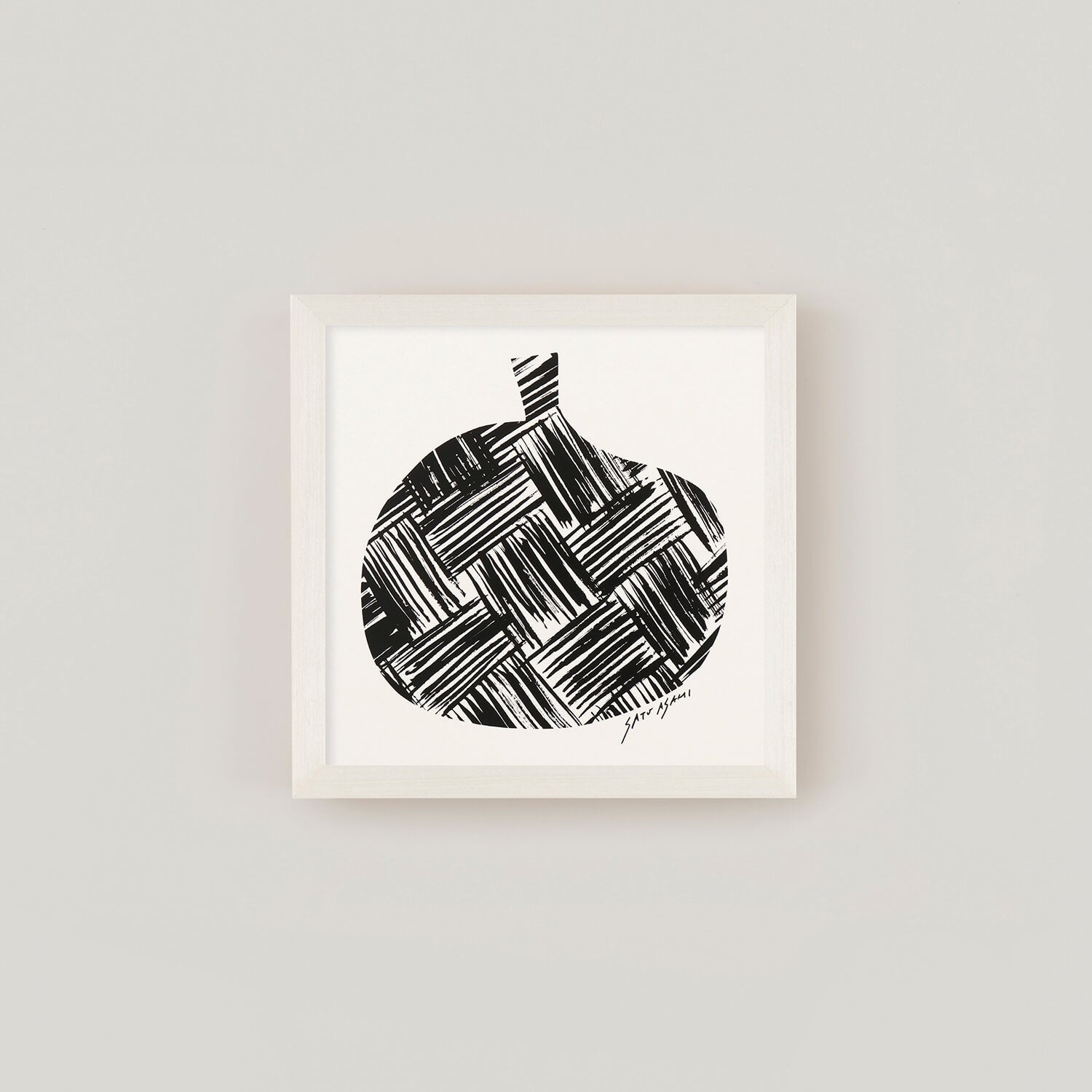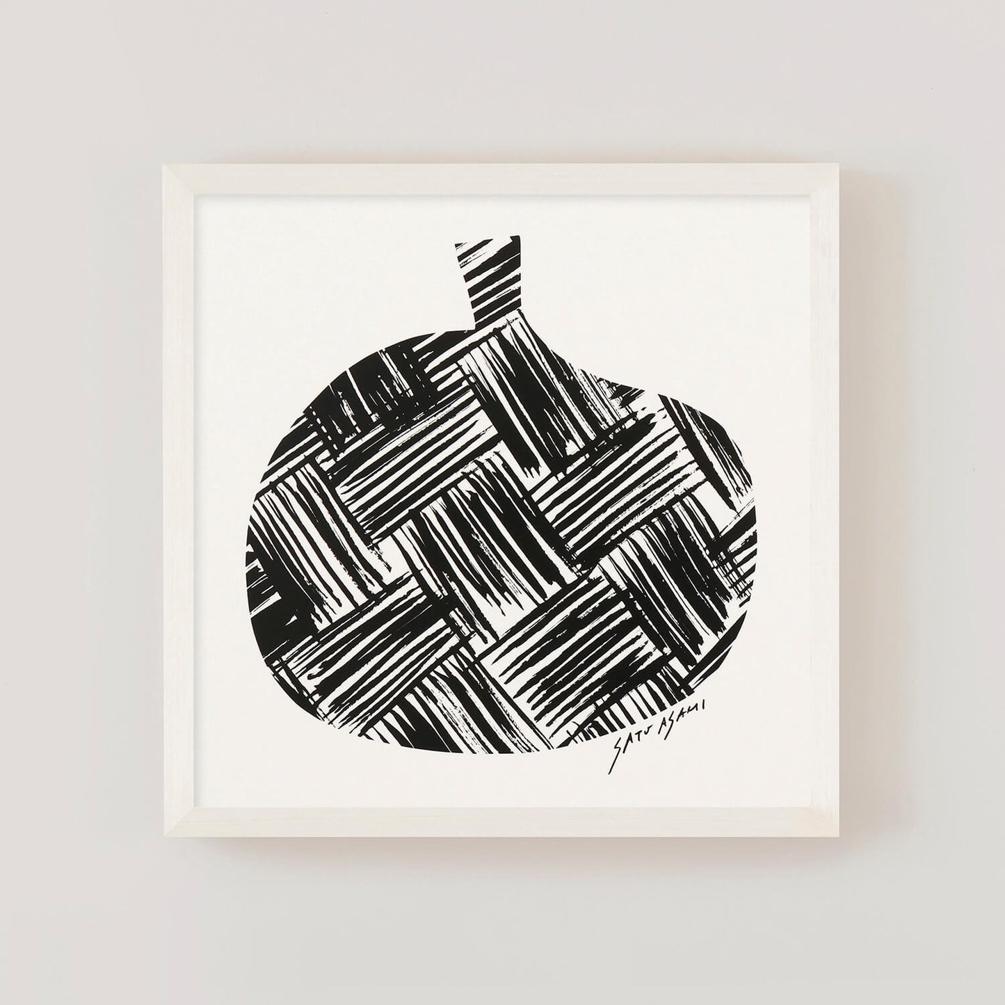 籐で編んだようなテクスチャーの香水瓶を、筆タッチで描いたデザイン。モノトーンの静物画であるにも関わらず、シンプルすぎずモダンすぎず、躍動感にあふれています。インテリアを選ばないサトウアサミさんの作品です。