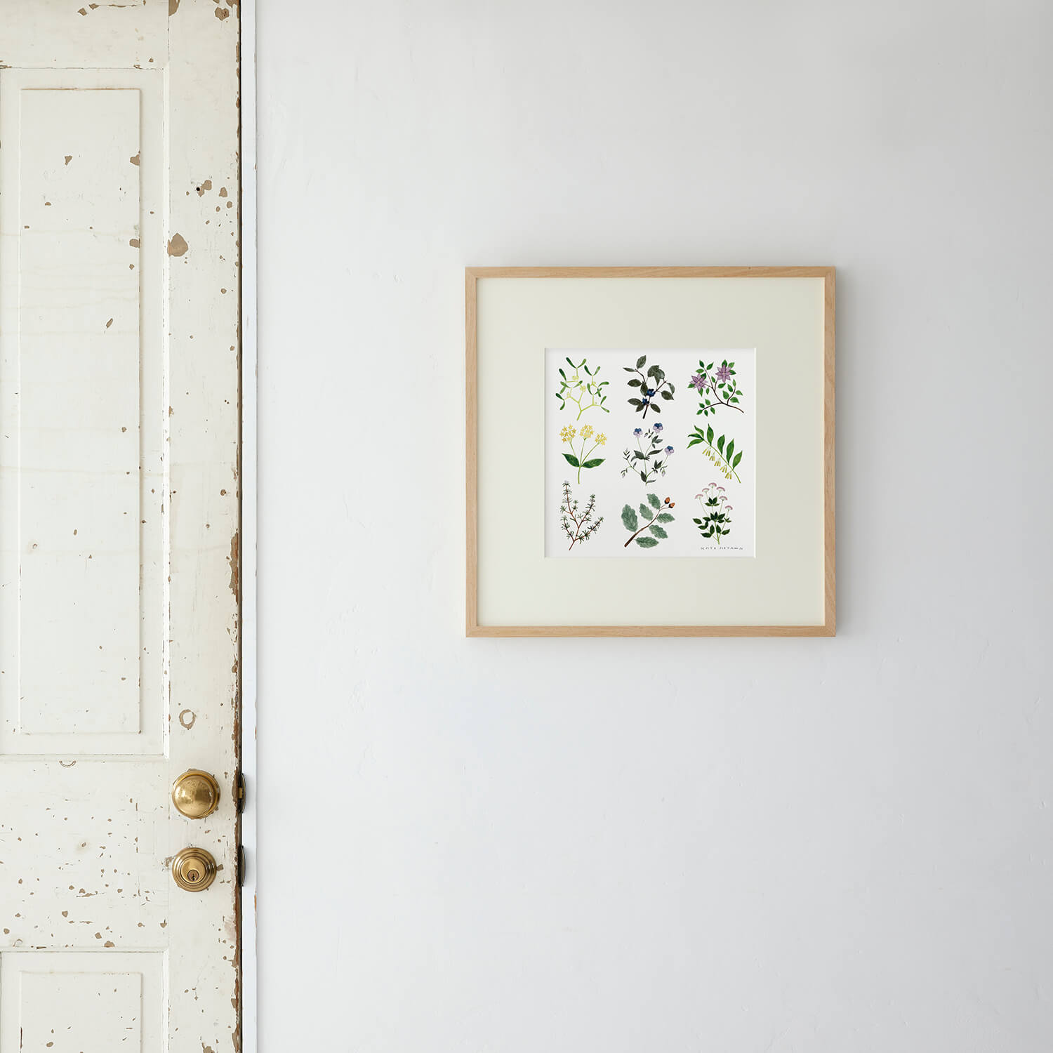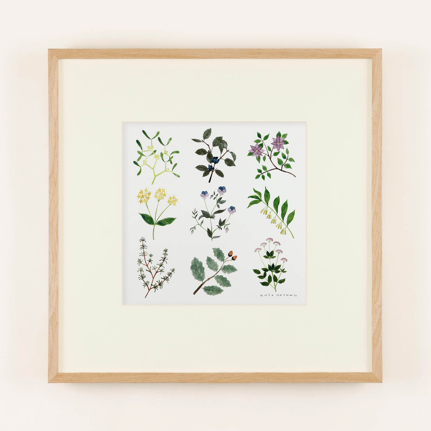 青山佳世さんによって絵の具で描かれたモチーフが均等に並んだ、まるで図鑑のようなシリーズ。「モチーフを選ぶ際、古いイギリスの植物図鑑を見ていたので少しマニアックな種類のものもあるのですが、描いてみたい造形の植物を選んで描きました」(青山さんのコメント)。モチーフは左上から右に「ヤドリギ」「クロウメモドキ」「クレマチス」、2段目「イケマ」「ビオラ」「アマドコロ」、3段目「ローズマリー」「オーク」「イワミツバ」。