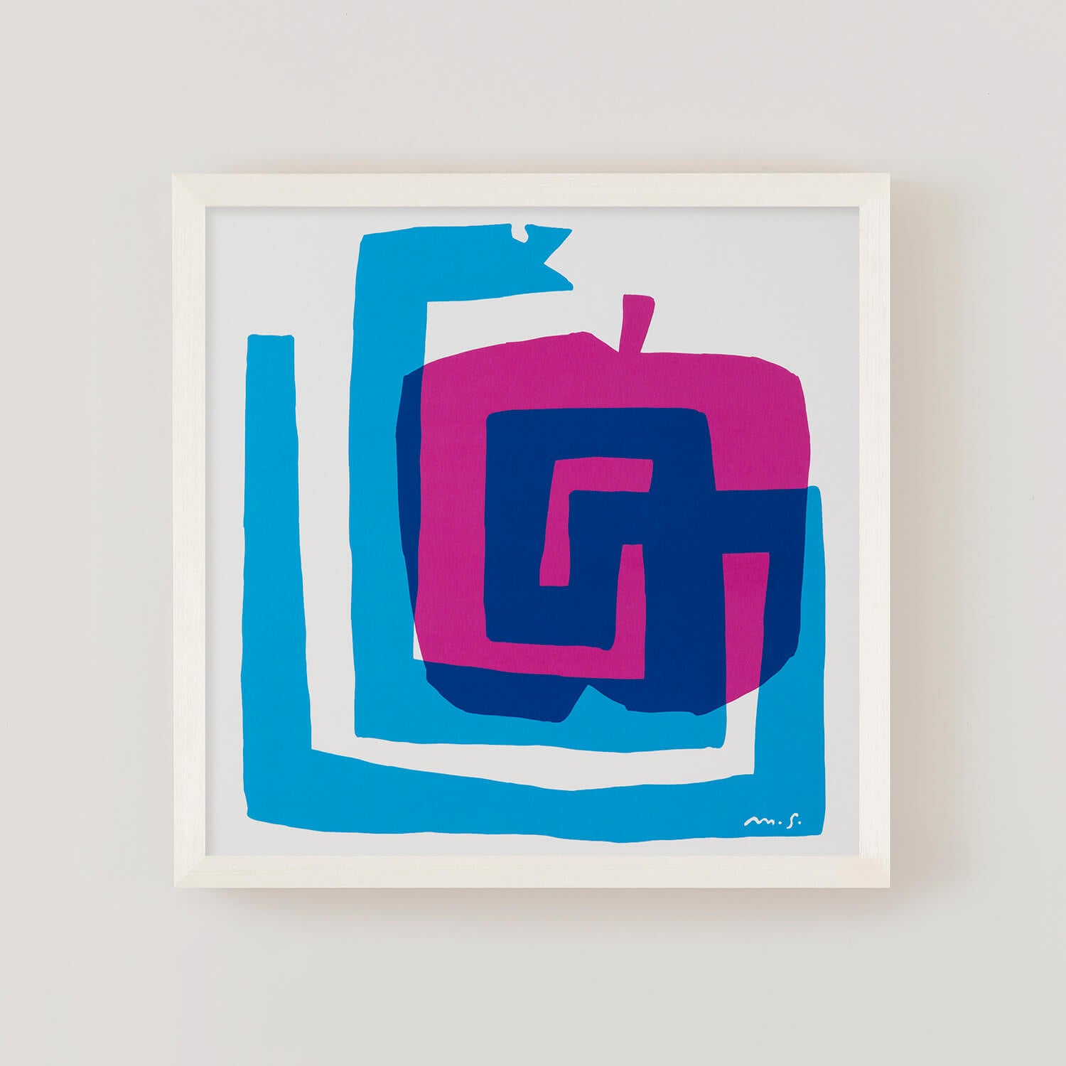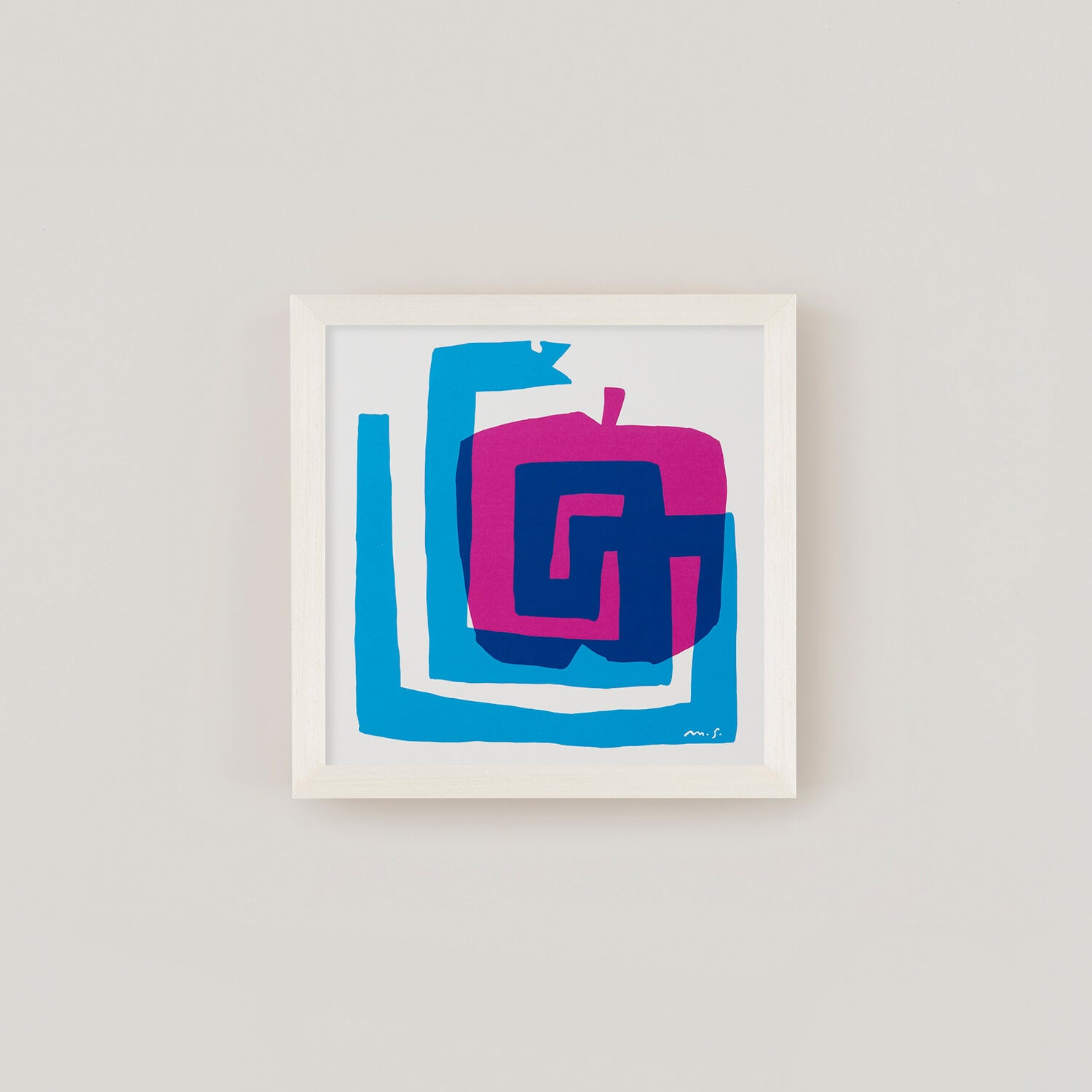 アンバランスでちょっととぼけたヘビとリンゴが重なった、鈴木マサルさんならではの作品。不自然にも思われるサイズ感で組み合わされたモチーフが、絶妙な配色とバランスで描かれている。