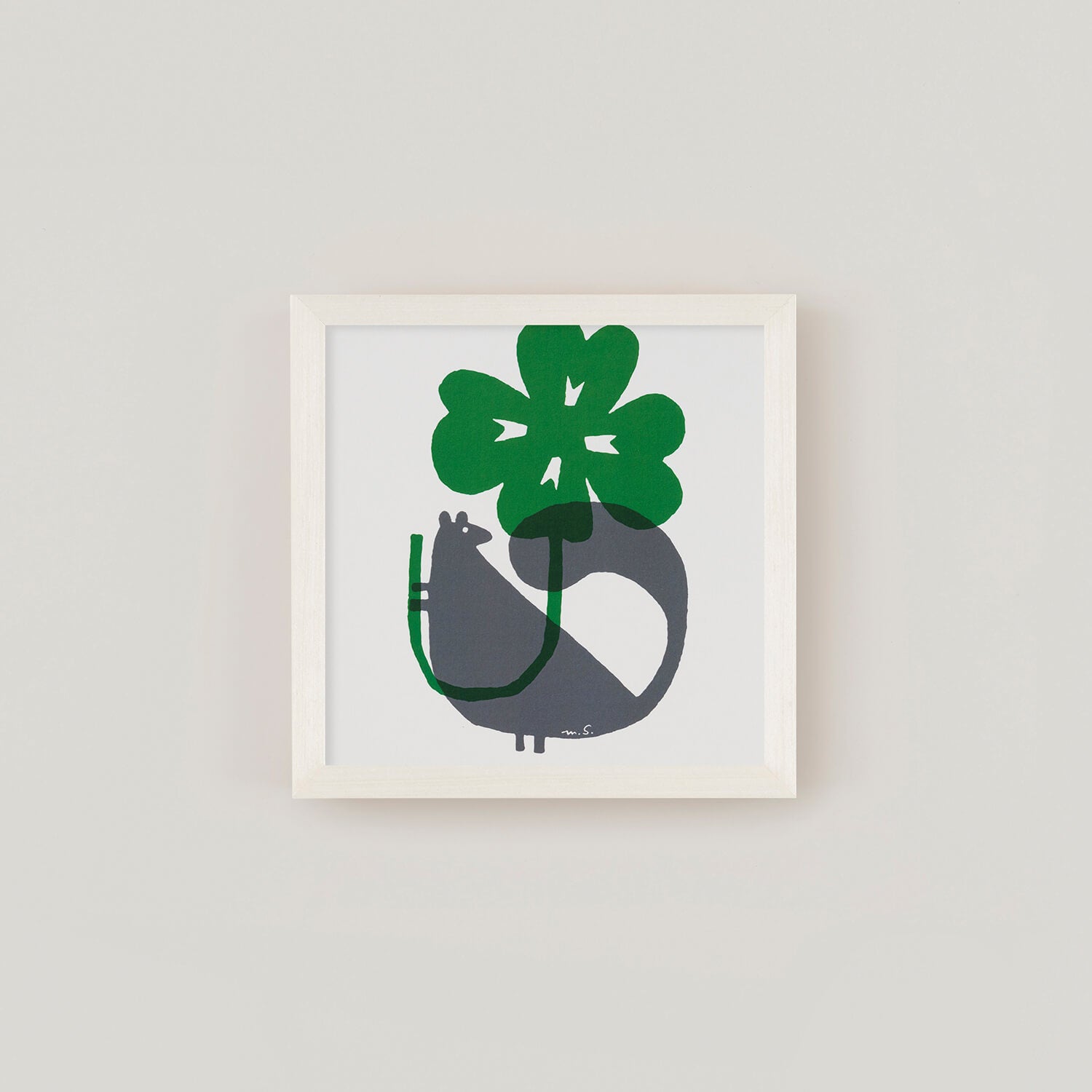 アンバランスでちょっととぼけたリスとシロツメクサが重なった、鈴木マサルさんならではの作品。不自然にも思われるサイズ感で組み合わされたモチーフが、絶妙な配色とバランスで描かれている。