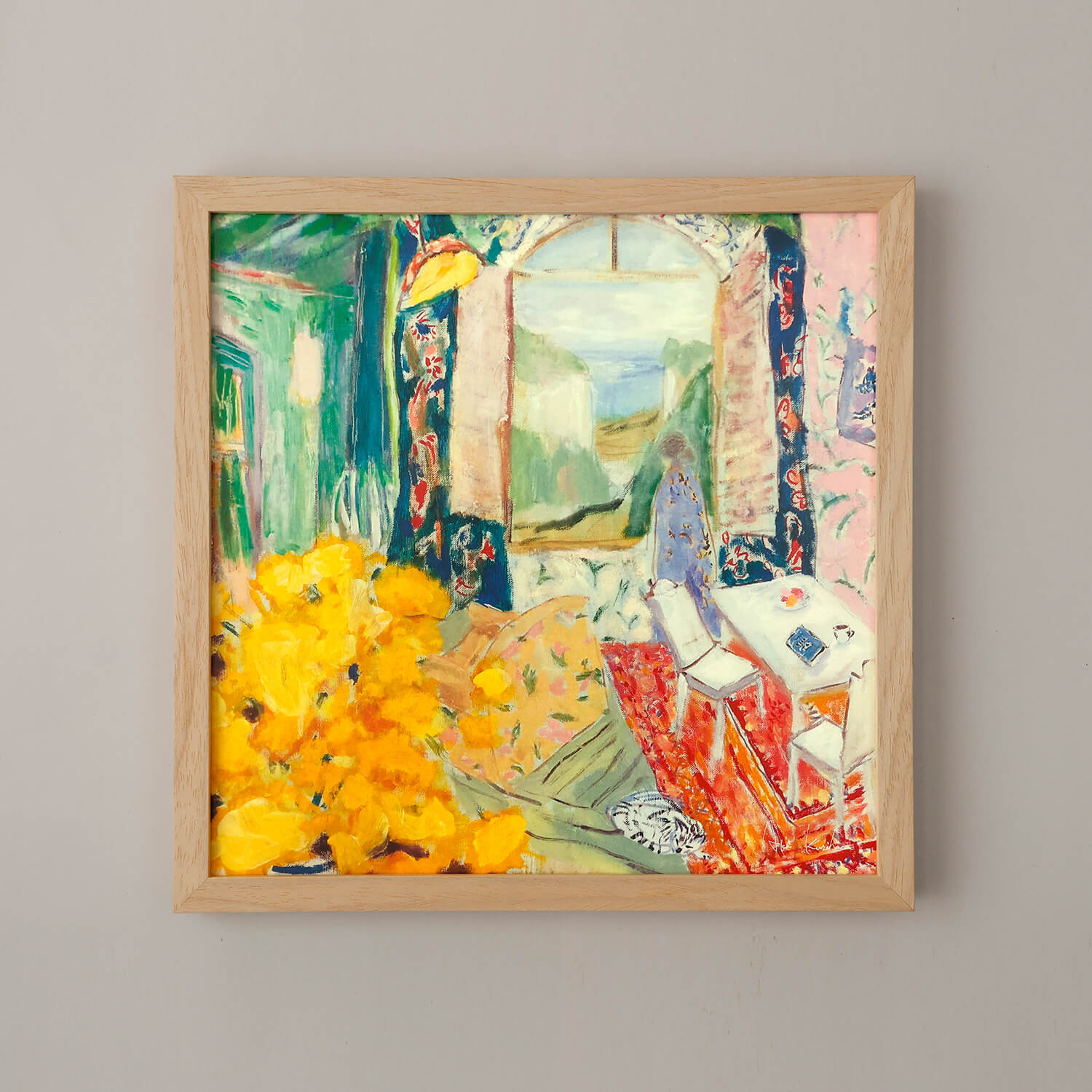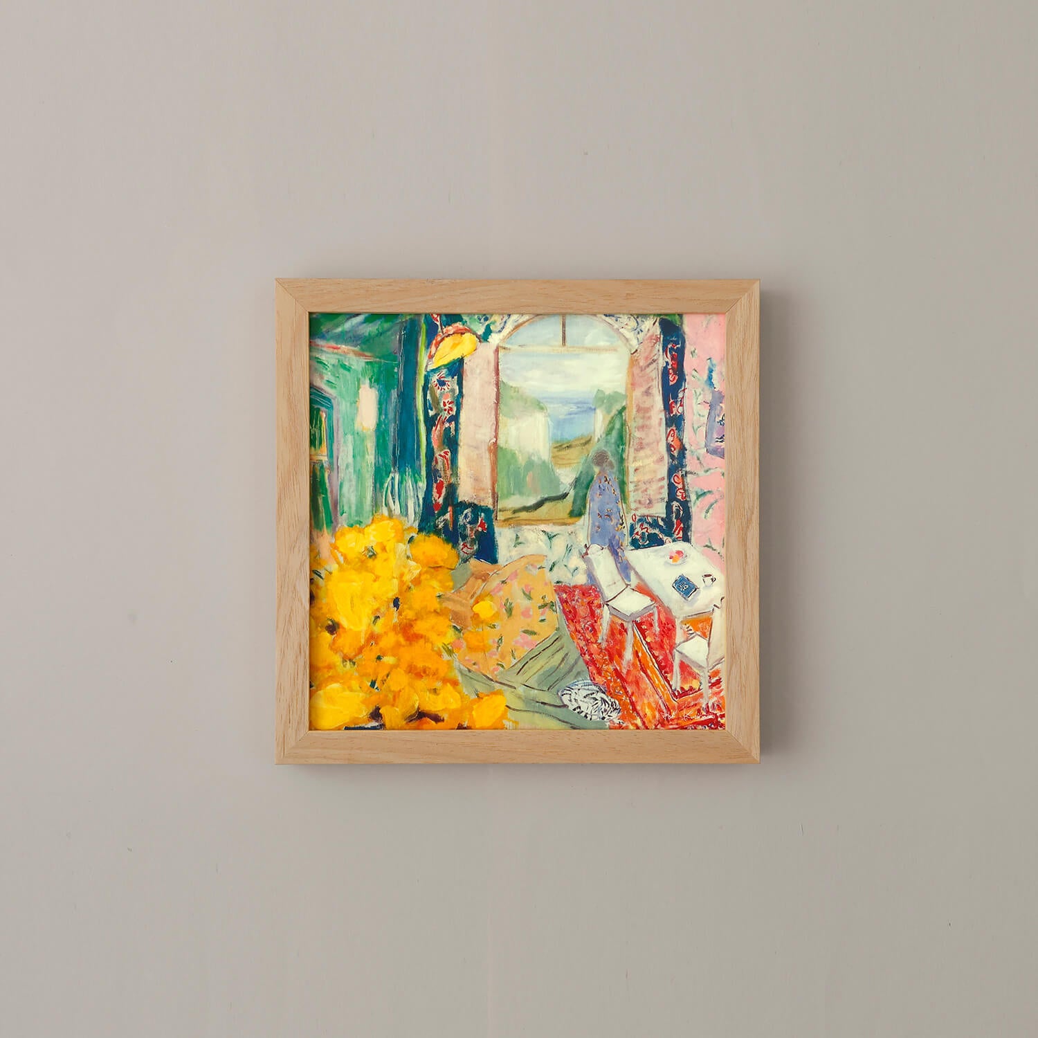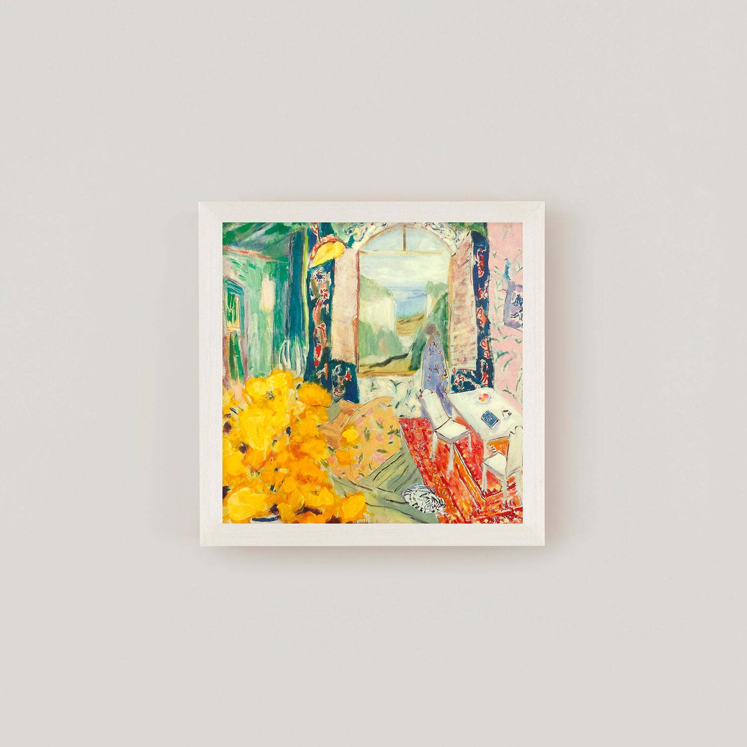 手前の花とソファ、ラグの色彩、開け放たれた窓。どれも春の到来をイメージさせる作品。遠くに見える海に向かって、この女性は何を想うのでしょう。横たわる猫の寛いださまが、穏やかな時間の流れを感じさせてくれます。栗原あきさんの作品。