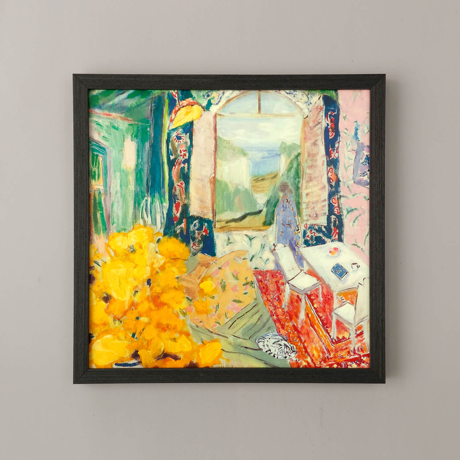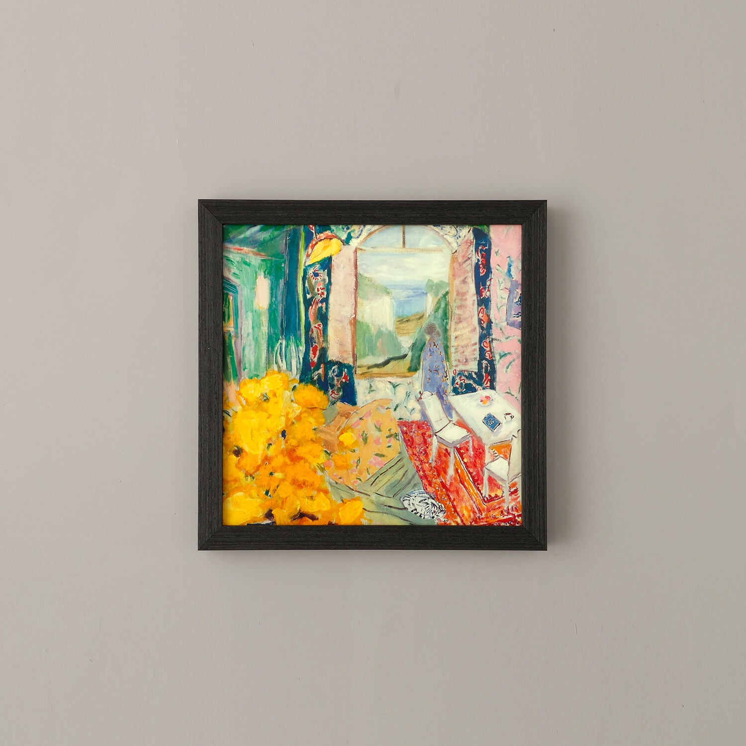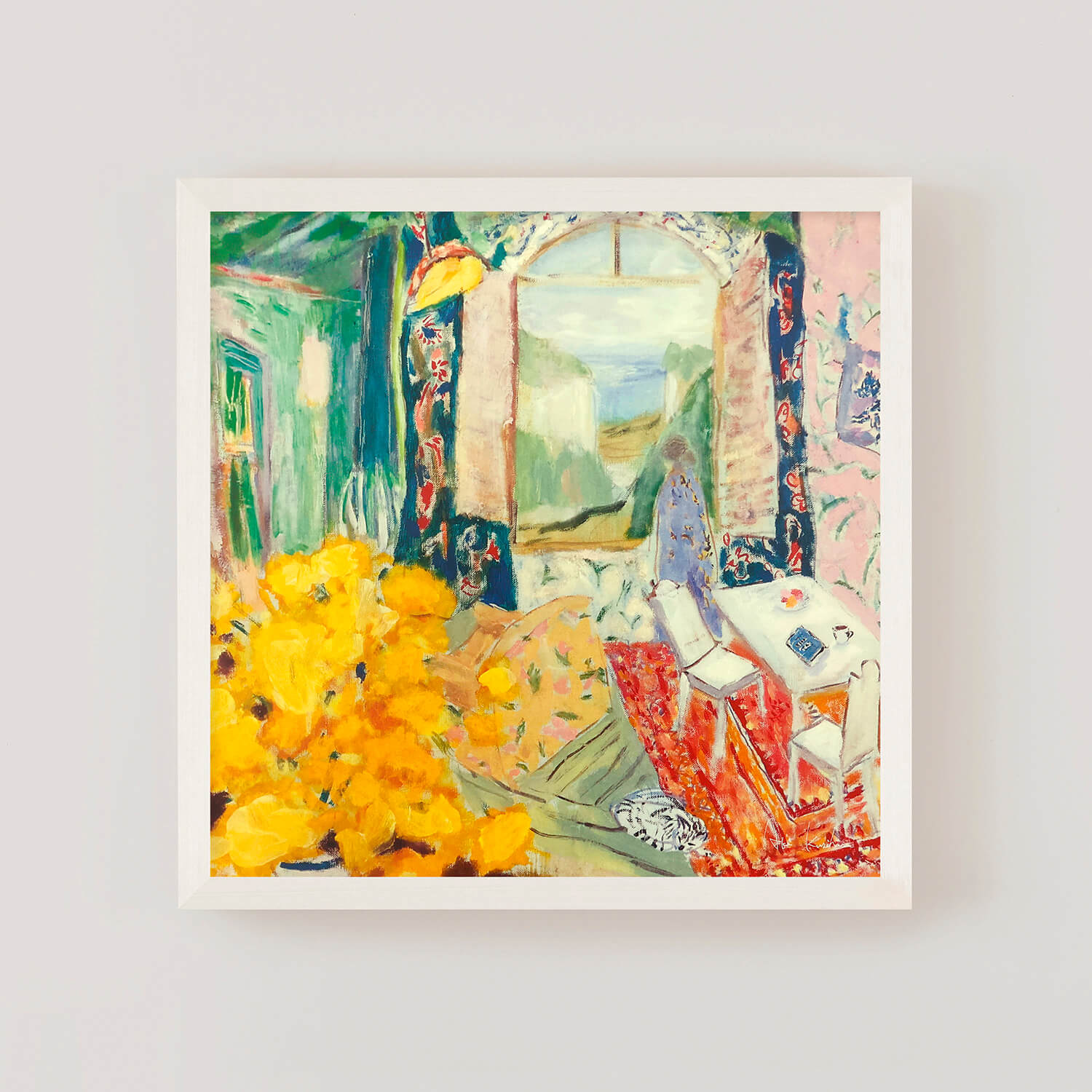 手前の花とソファ、ラグの色彩、開け放たれた窓。どれも春の到来をイメージさせる作品。遠くに見える海に向かって、この女性は何を想うのでしょう。横たわる猫の寛いださまが、穏やかな時間の流れを感じさせてくれます。栗原あきさんの作品。
