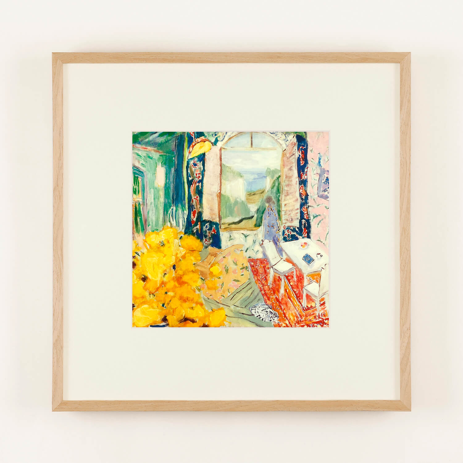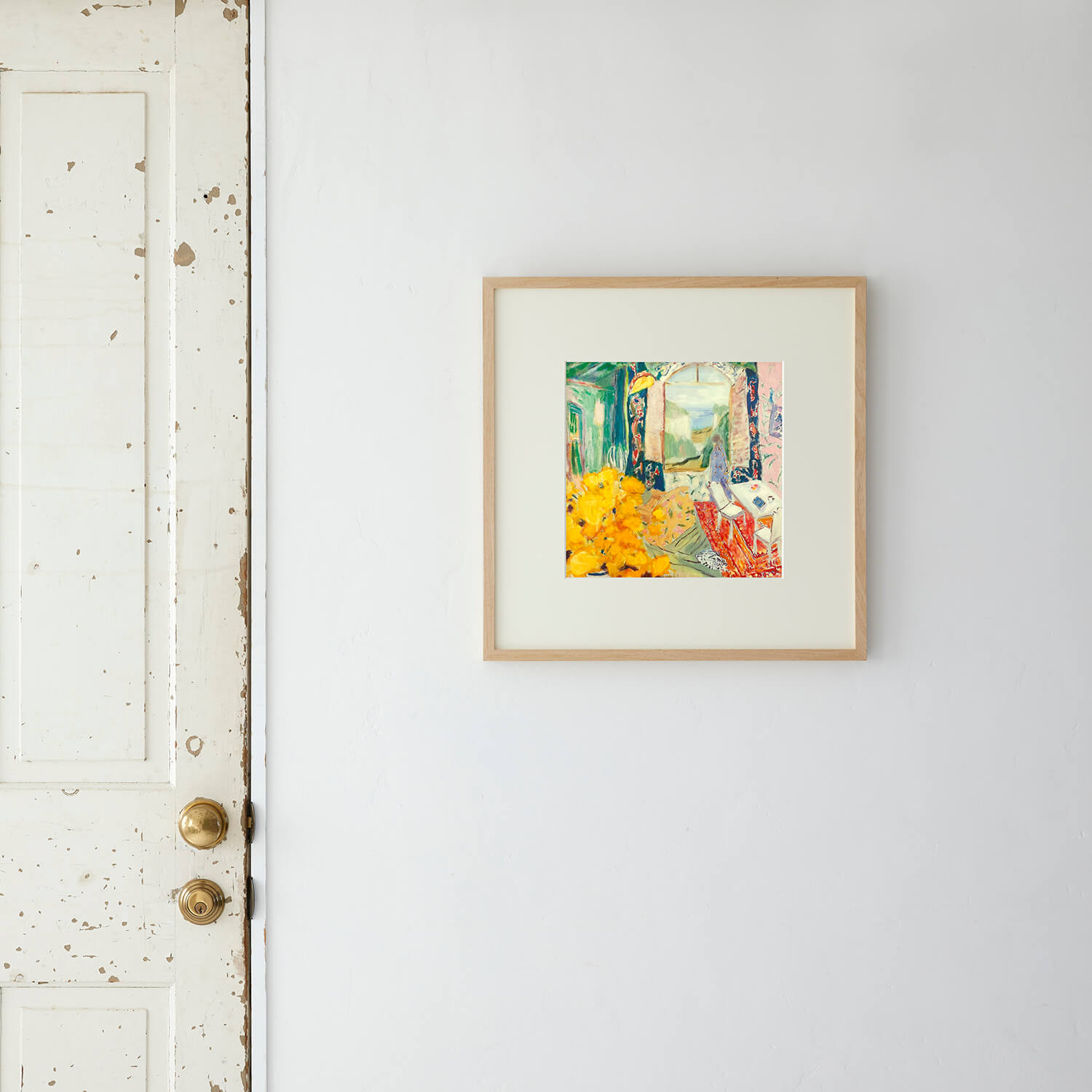 手前の花とソファ、ラグの色彩、開け放たれた窓。どれも春の到来をイメージさせる作品。遠くに見える海に向かって、この女性は何を想うのでしょう。横たわる猫の寛いださまが、穏やかな時間の流れを感じさせてくれます。栗原あきさんの作品。