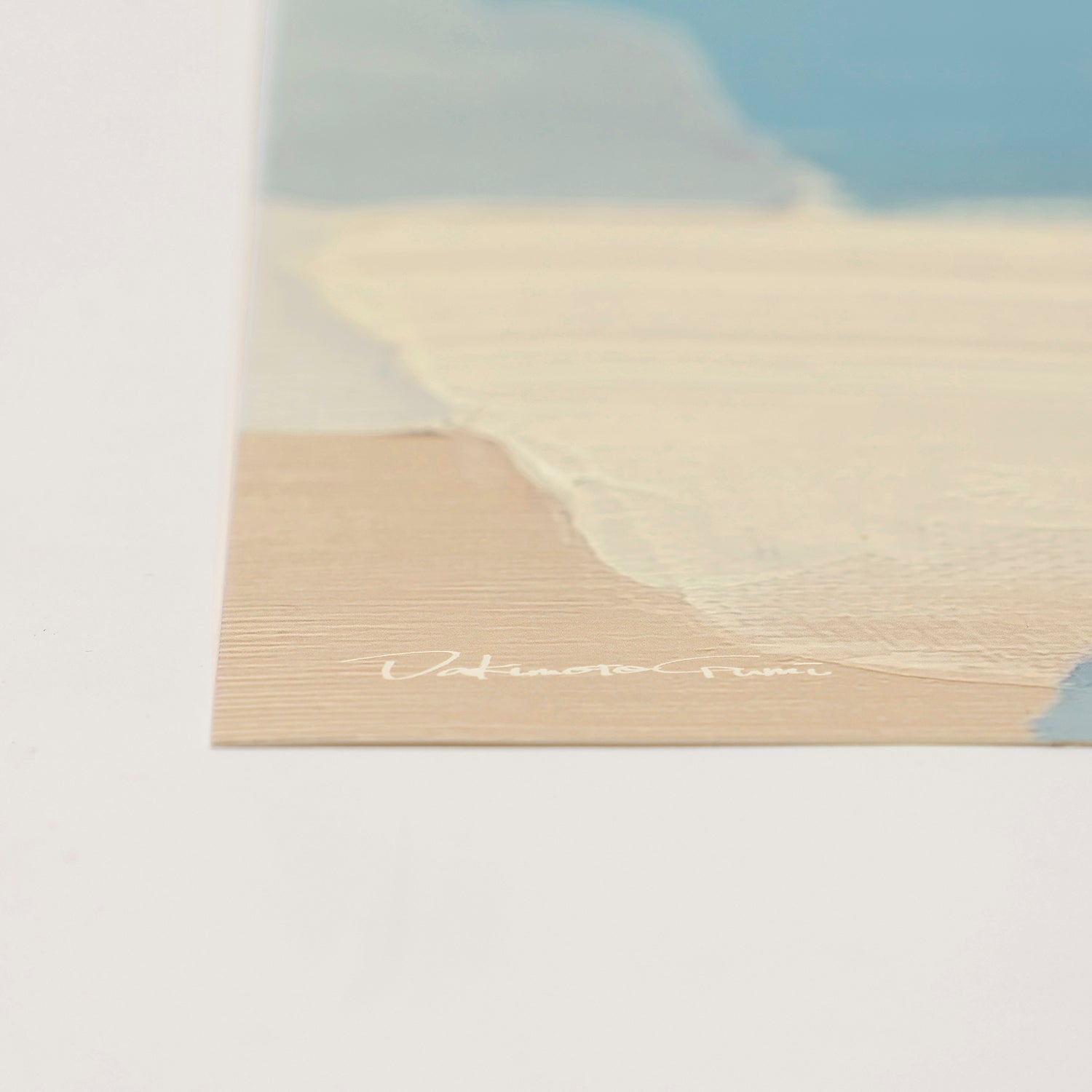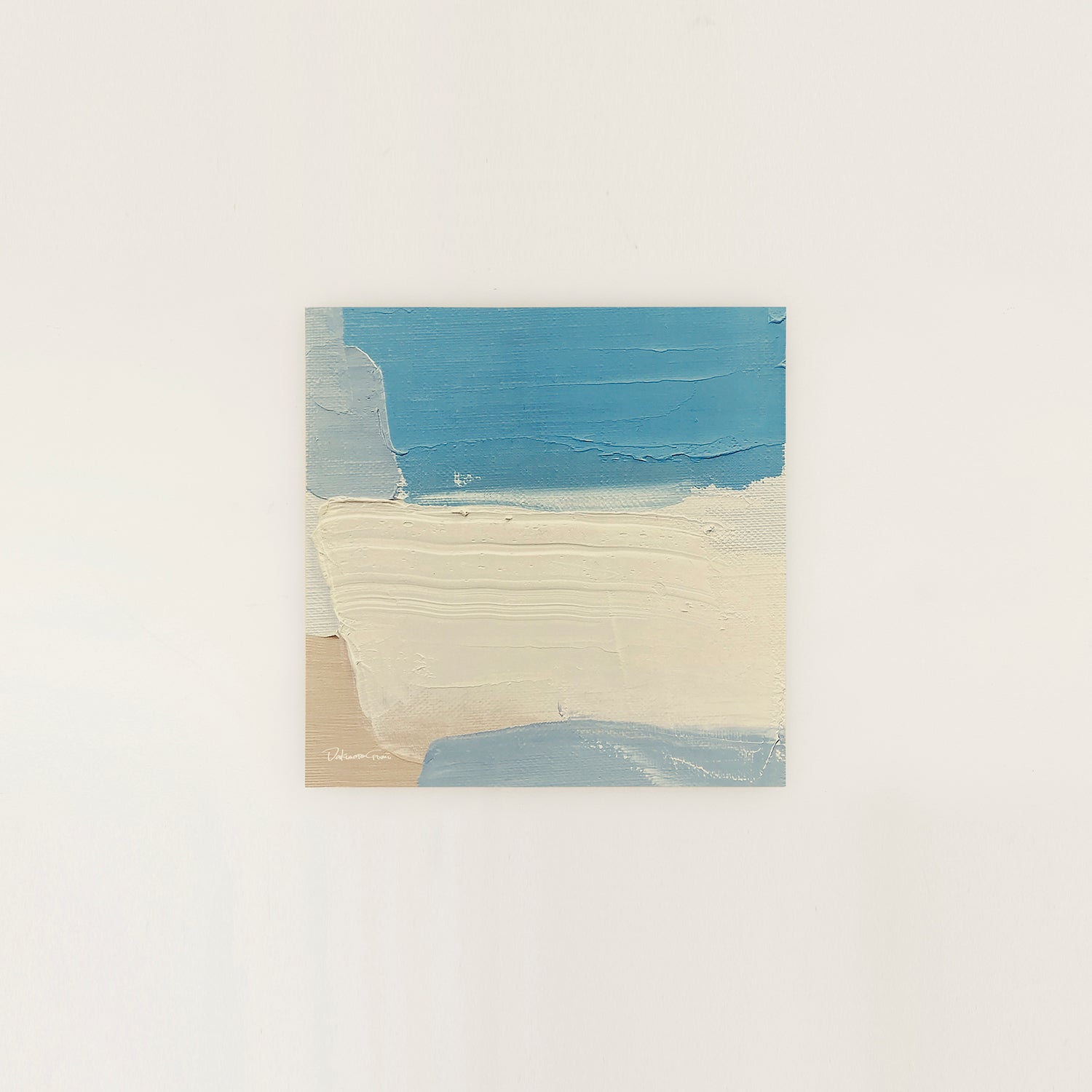 青と生成りを中心に構成された、穏やかで開放感のある抽象画。刷毛跡を残した大胆なストロークが、色の層にリズムと奥行きを生み出しています。重ねながらも混ざりすぎず、それぞれの色が独立した存在として立ち上がる構成。滝本優美さんによる本作は、筆の動きそのものを意識させる一枚で、絵具の流れと静けさの両方を感じさせます。