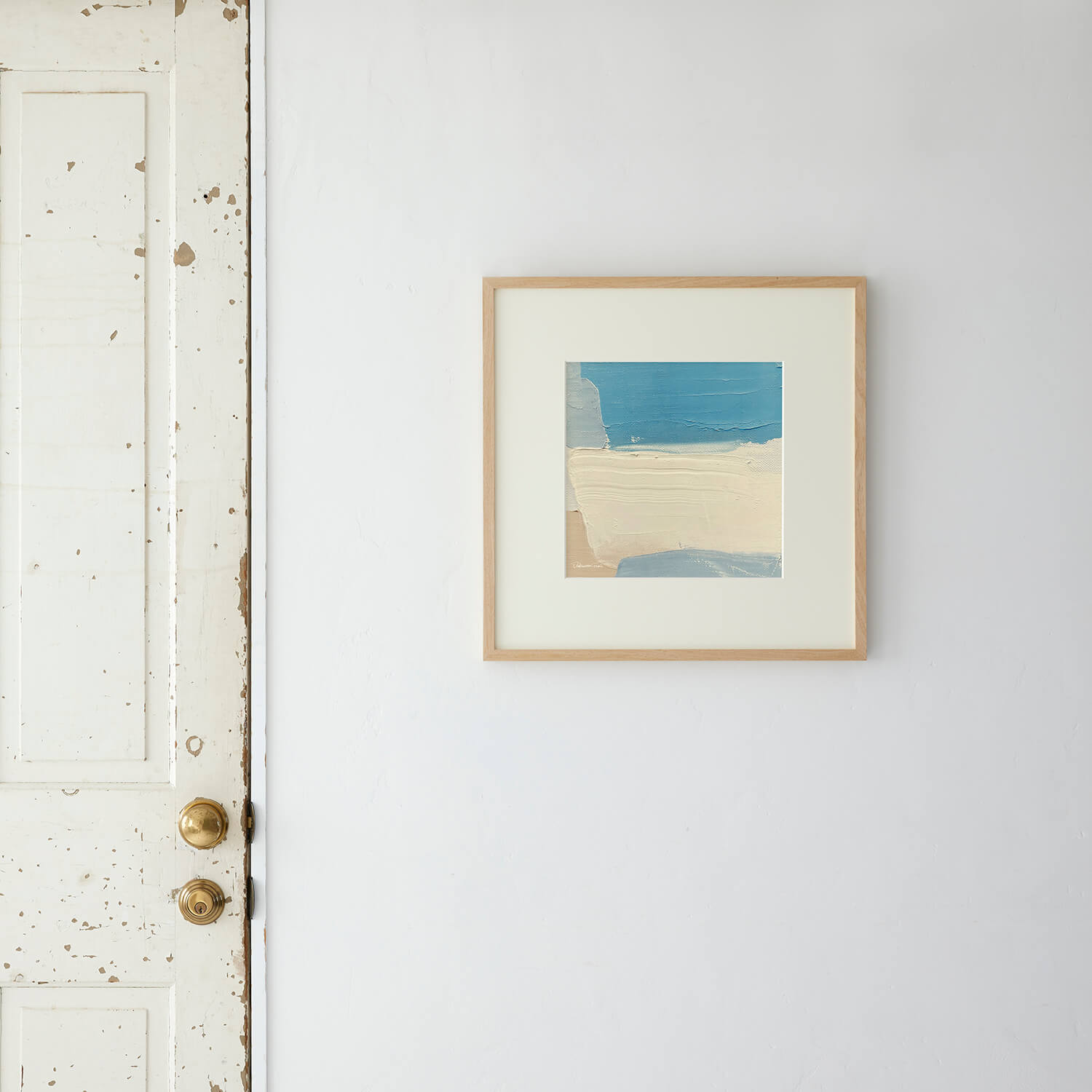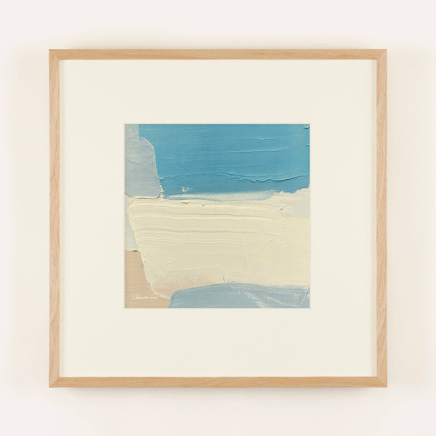 青と生成りを中心に構成された、穏やかで開放感のある抽象画。刷毛跡を残した大胆なストロークが、色の層にリズムと奥行きを生み出しています。重ねながらも混ざりすぎず、それぞれの色が独立した存在として立ち上がる構成。滝本優美さんによる本作は、筆の動きそのものを意識させる一枚で、絵具の流れと静けさの両方を感じさせます。