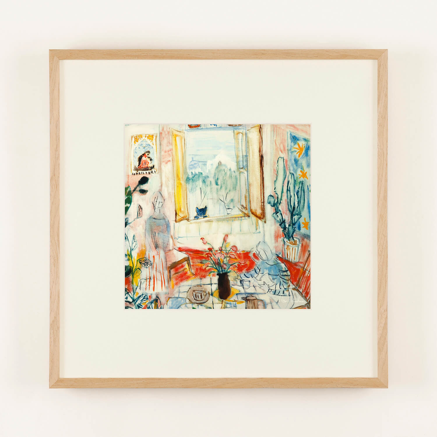 気持ちのいい朝の食卓か、まったりとしたランチタイムの風景でしょうか。美味しそうな匂いに誘われたのか、大きく開け放った窓から黒猫が覗いています。全体的に優しめの色彩ですが、床と花瓶に使われた濃色が奥行きを感じさせてくれる、花と緑に溢れた栗原あきさんの作品。