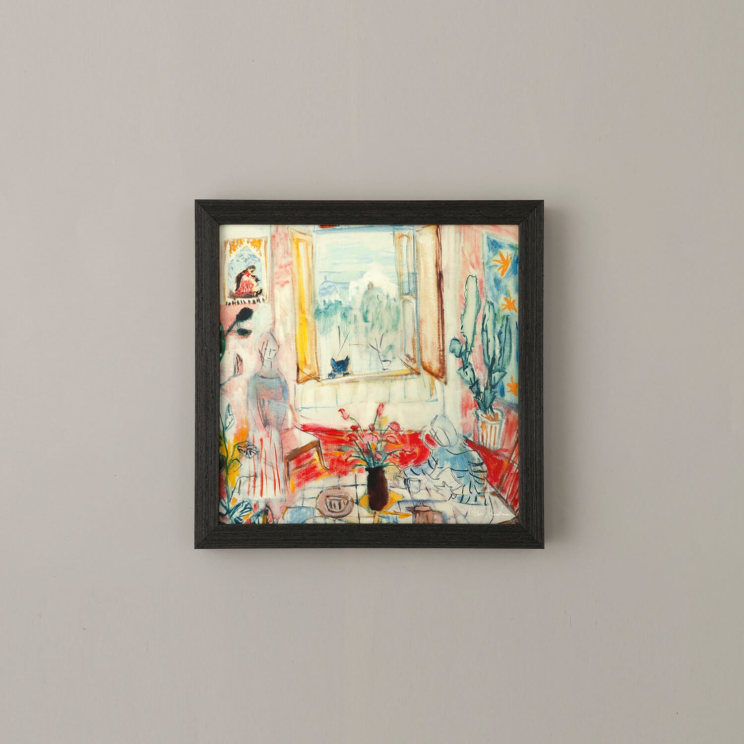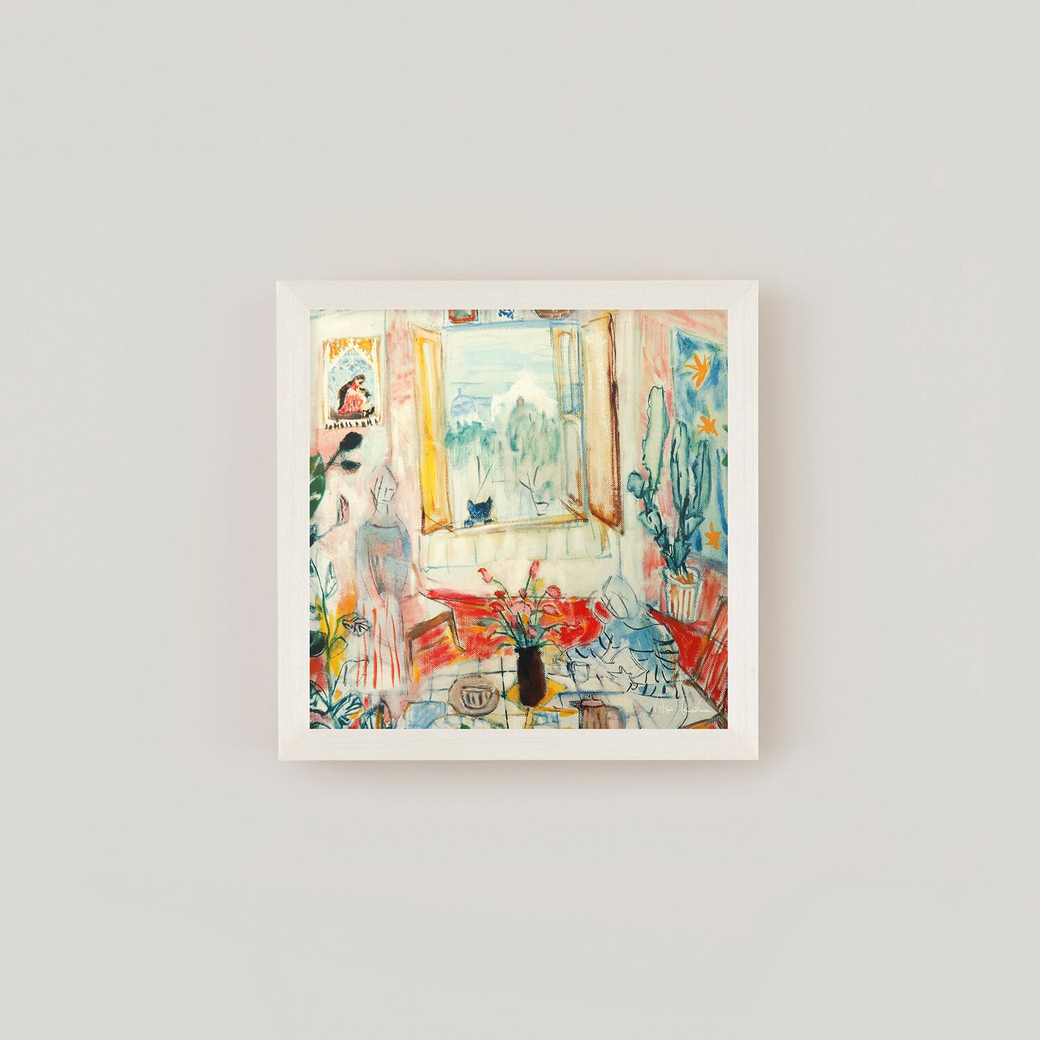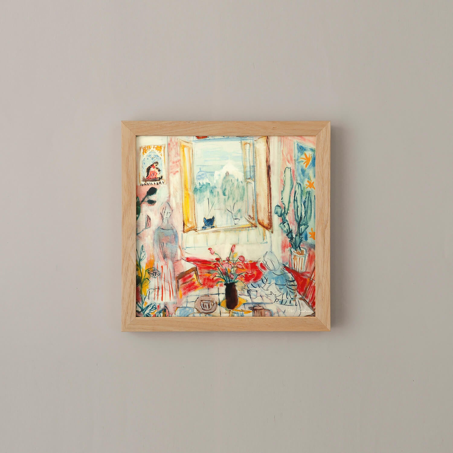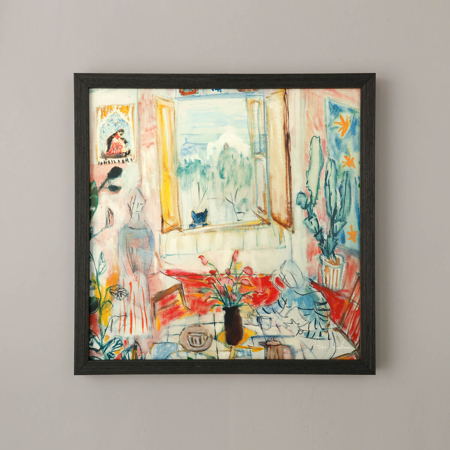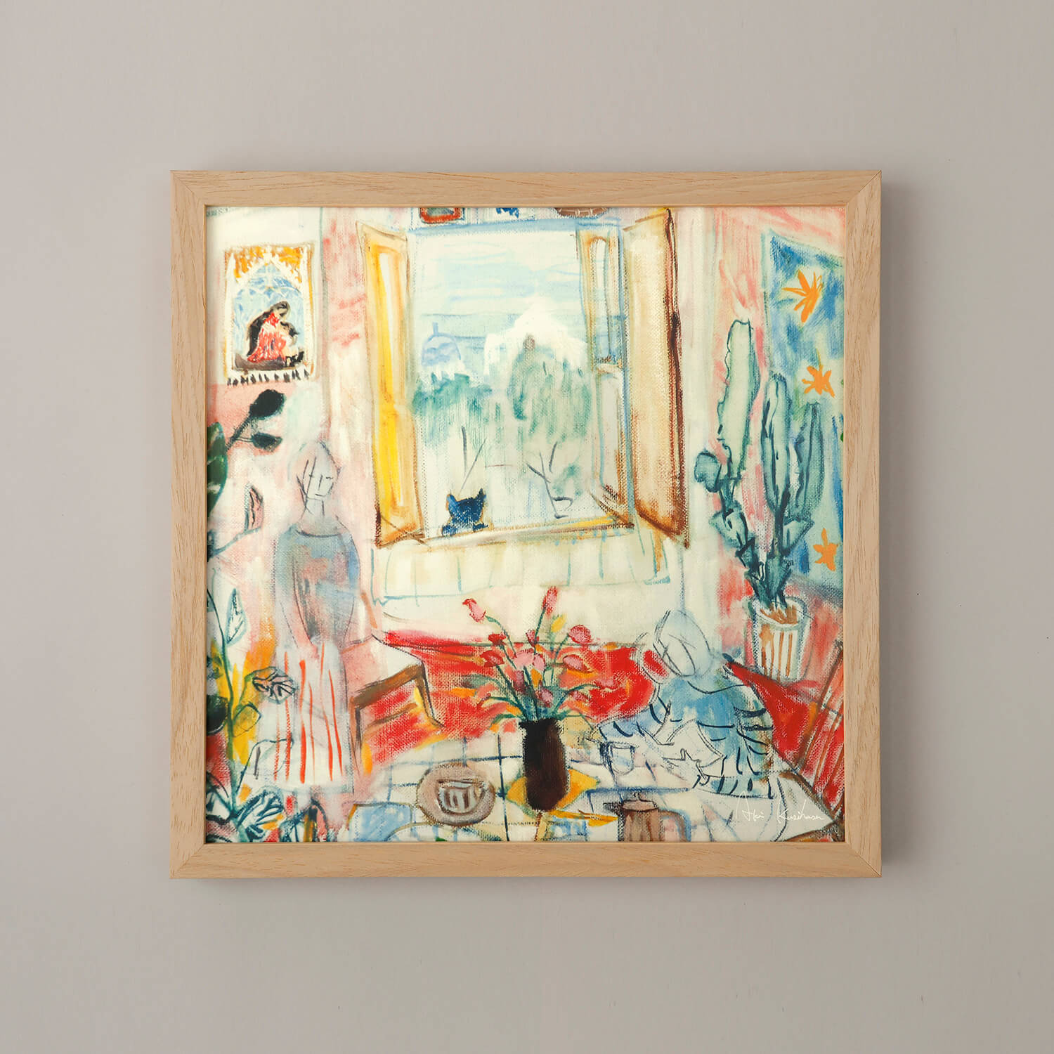 気持ちのいい朝の食卓か、まったりとしたランチタイムの風景でしょうか。美味しそうな匂いに誘われたのか、大きく開け放った窓から黒猫が覗いています。全体的に優しめの色彩ですが、床と花瓶に使われた濃色が奥行きを感じさせてくれる、花と緑に溢れた栗原あきさんの作品。